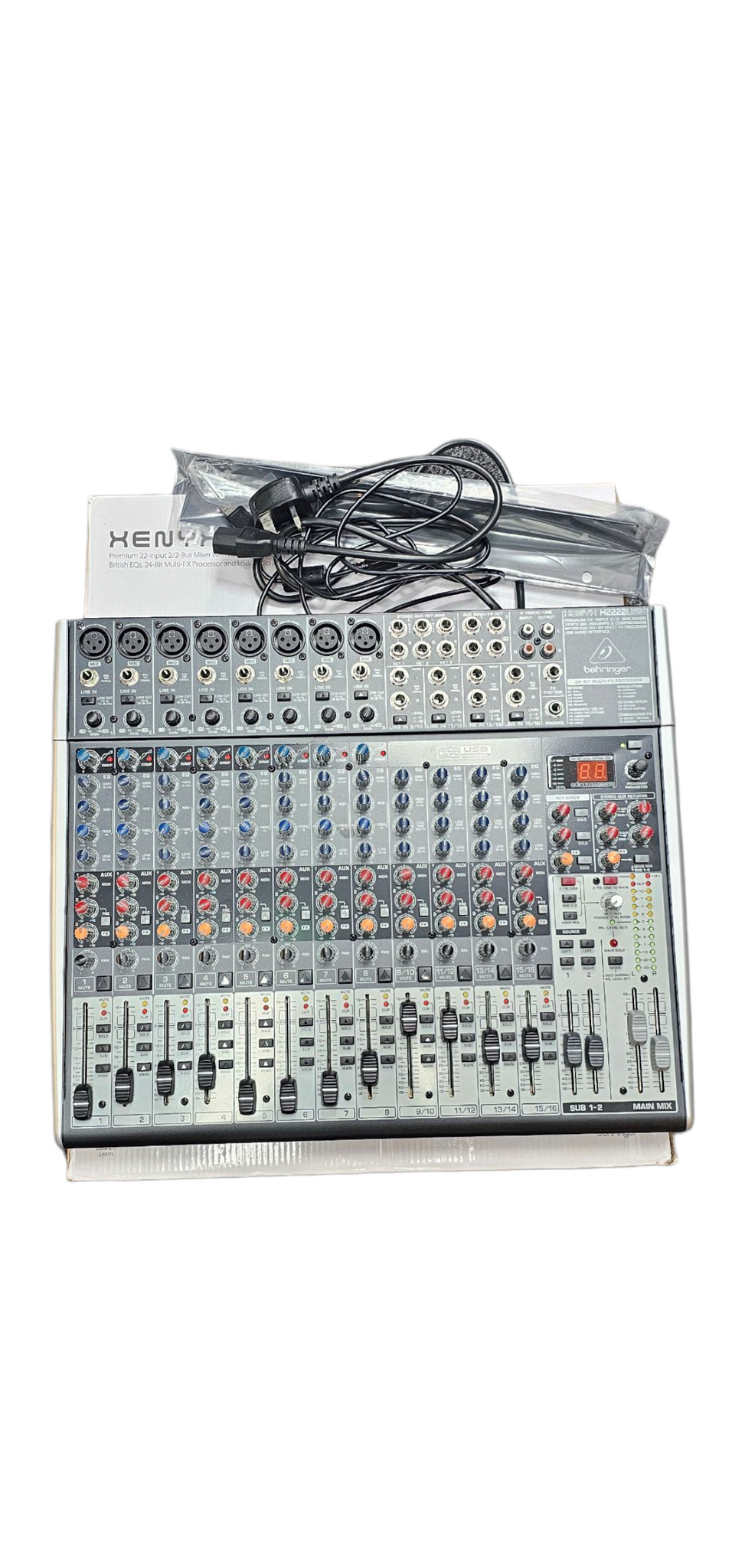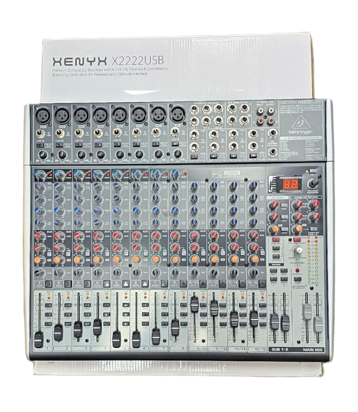 Behringer X2222USB The Behringer X2222USB gives you a premium 22-Channel PA mixer with an integrated effect processor. Sporting 8 Xenyx mic preamps that represent a major step in the evolution of audio technology. Easily holding their own even when compared to the most expensive stand-alone mic preamps. Offering a staggering 130 dB of dynamic range, with a bandwidth that extends from below 10 Hz to well over 200 kHz. Giving you a transparent, crystal-clear performance that will give your microphones a whole new sound. Furthermore, the X2222USB features dedicated compressors and 3-band EQ with semi-parametric mids and three Aux Sends. As well as four stereo line-level channels, two convenient mix subgroups, and onboard 24-bit digital FX processing. All this and more, the X2222USB comes in a rack-ready, roadworthy steel chassis. Designed to handle your live gigs, the Xenyx X2222USB provides the state-of-the-art tools you need for stunning, professional recordings. Along with a built-in USB audio interface, the X2222USB comes complete with all the recording and editing software you need. Turning your computer into a complete, high-performance recording studio.