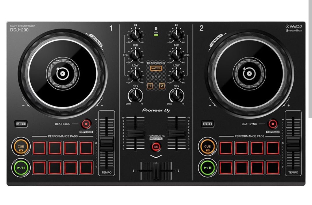 Pioneer Dj Smart controller DDJ -200. Comes in good condition with usb cable and an aux cable. This set up is Bluetooth compatible with Android and ios. Compatible with record box dj windows and mac. Download on app store. Comes in original box.