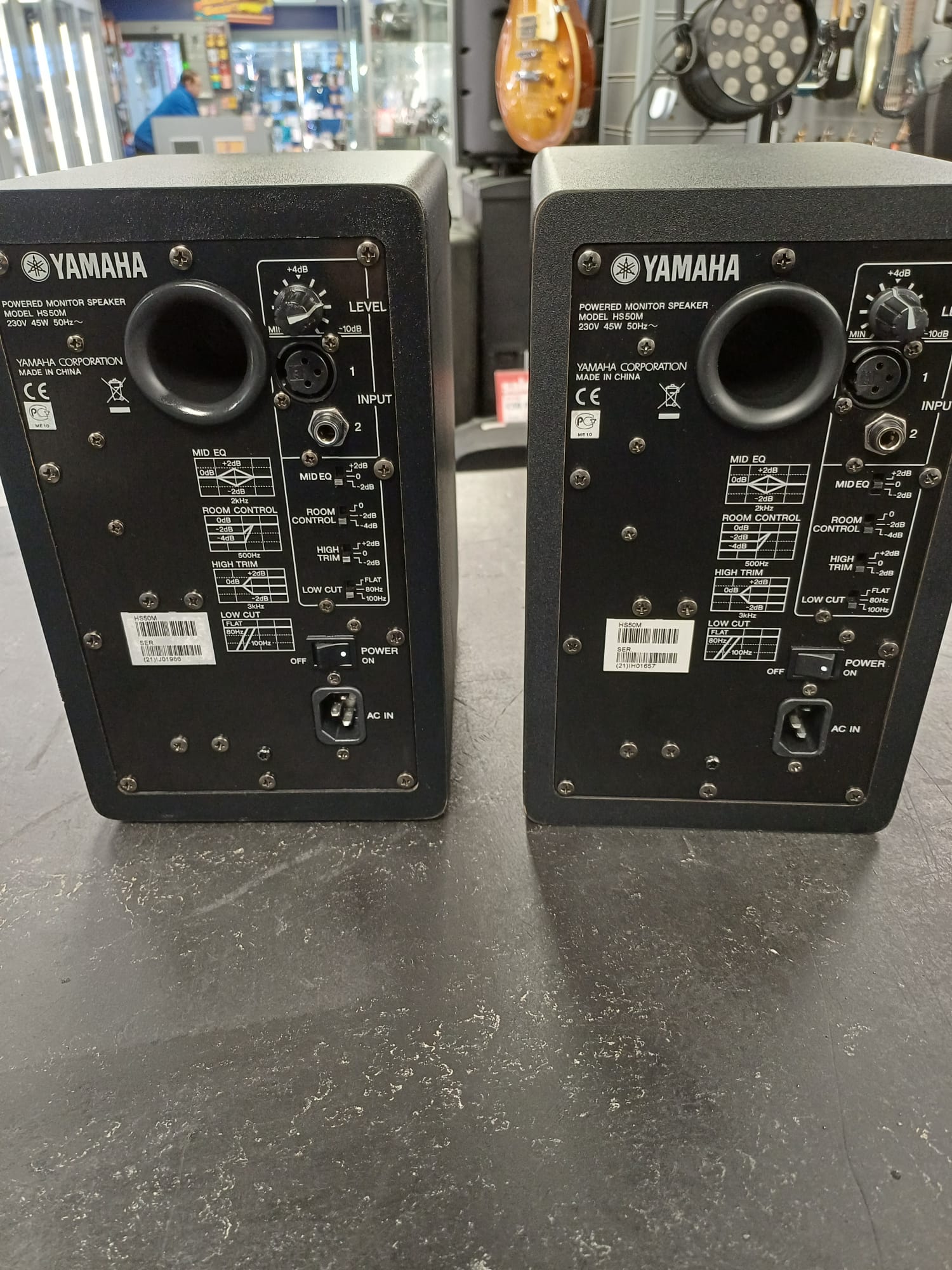 Yamaha HS50M Monitor Speakers 🔊 Accurate Sound, Professional Quality - 5" woofer + 1" dome tweeter – clear midrange, tight bass (70 Hz–20 kHz), perfect for music production, mixing, and gaming. - Bi-amp design (45W LF + 25W HF) – detailed sound with low distortion. - Mids-focused sound signature – hear every nuance in vocals and instruments. - Room Control & HPF switches – fine‑tune for your space (flat, -2 dB, -4 dB below 500 Hz; HPF @ 80/100 Hz). 💻 Why It’s for You - Studio‑grade accuracy – trusted by pros for mixing/mastering. - Neutral sound – great for EDM, hip‑hop, rock, and podcasting. - Compact, durable design – fits any desk (235 mm × 170 mm × 278 mm, 5.9 kg each). 🔌 Connections - Balanced XLR + unbalanced 1/4" inputs – hook up audio interfaces, mixers, or phones. - Volume knob on rear – tweak as you work.