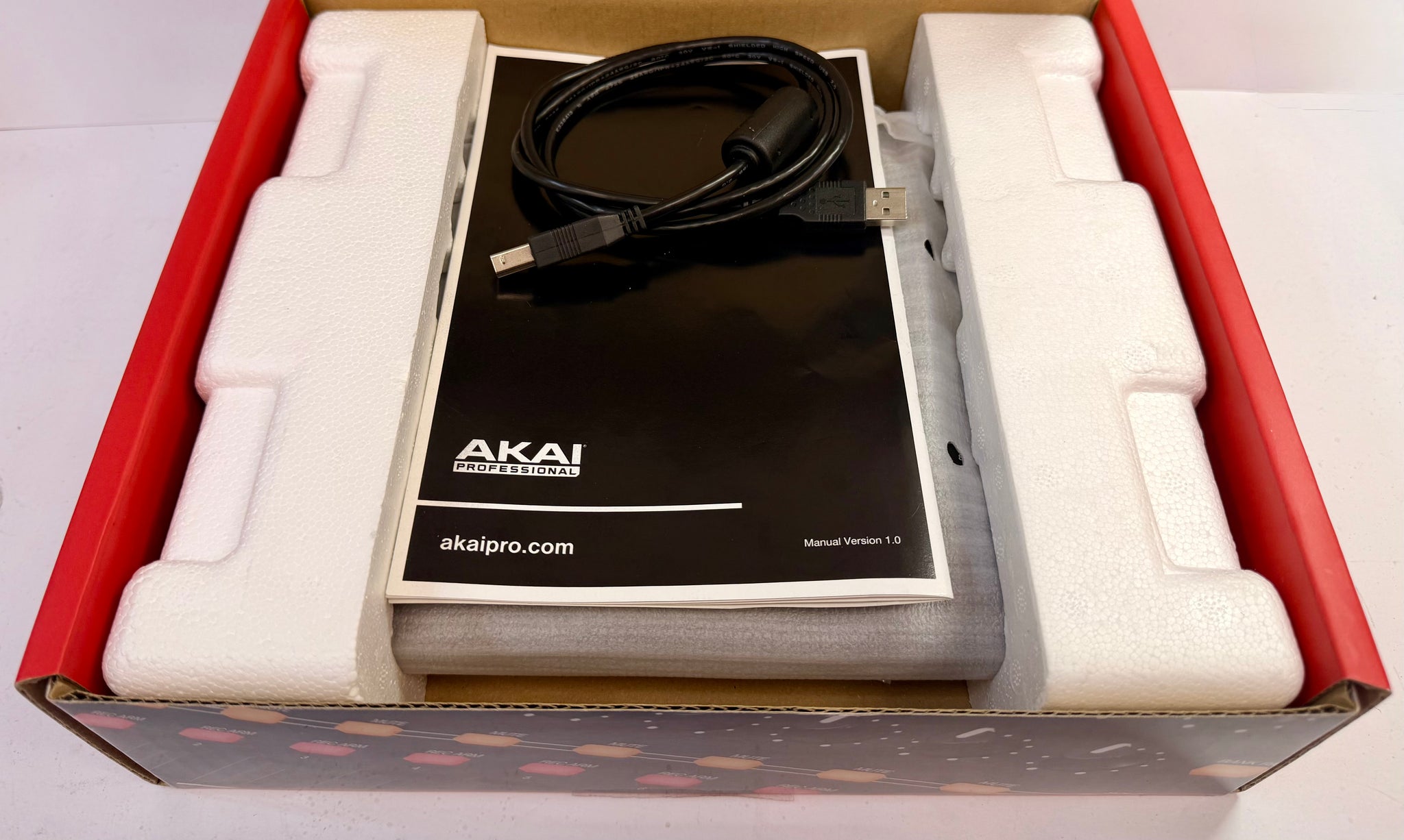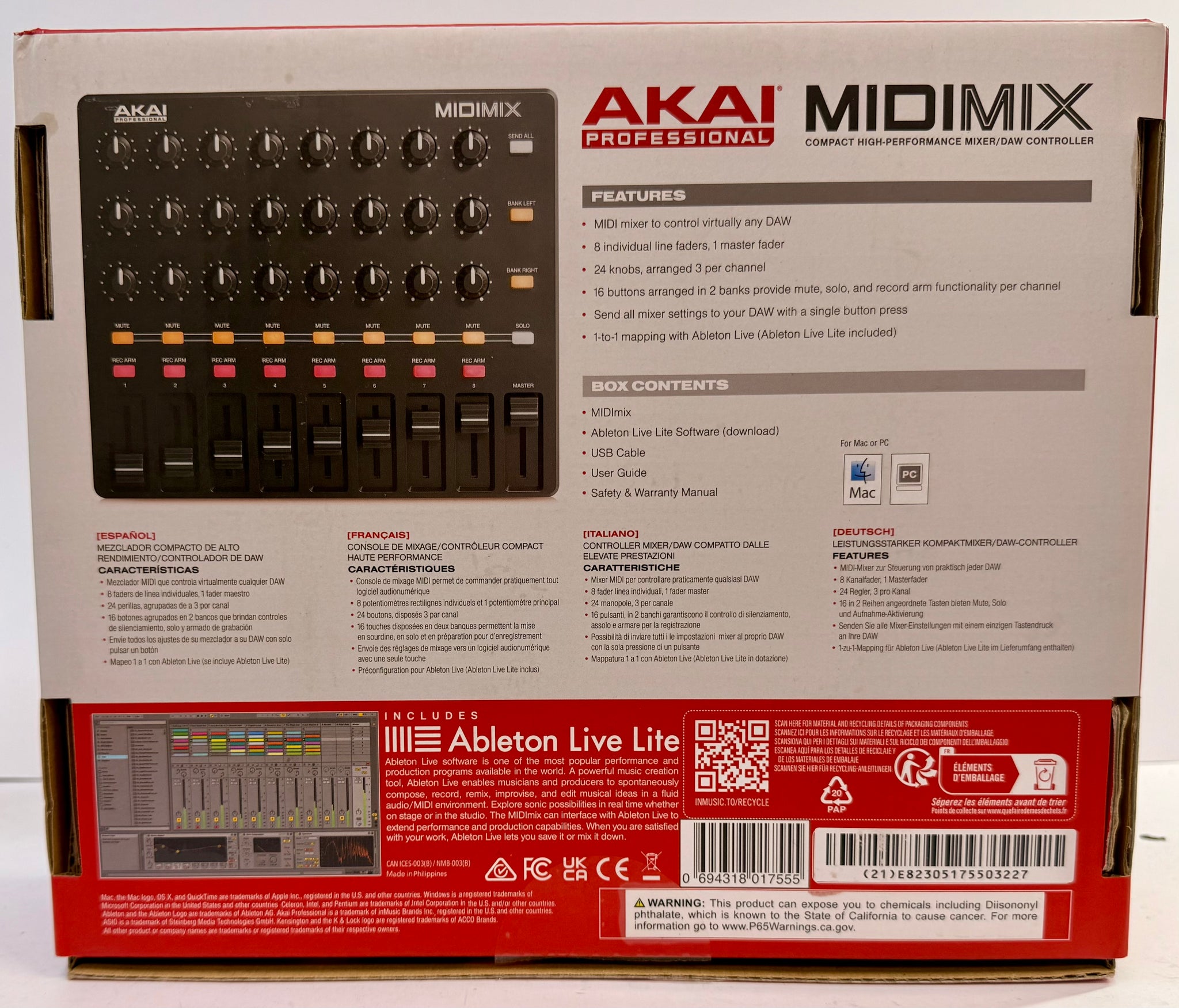 The AKAI Professional MIDIMIX is a compact mixer. It has a black interface with 24 knobs, 8 faders, and 16 arranged buttons. This product includes Ableton Live Lite.
