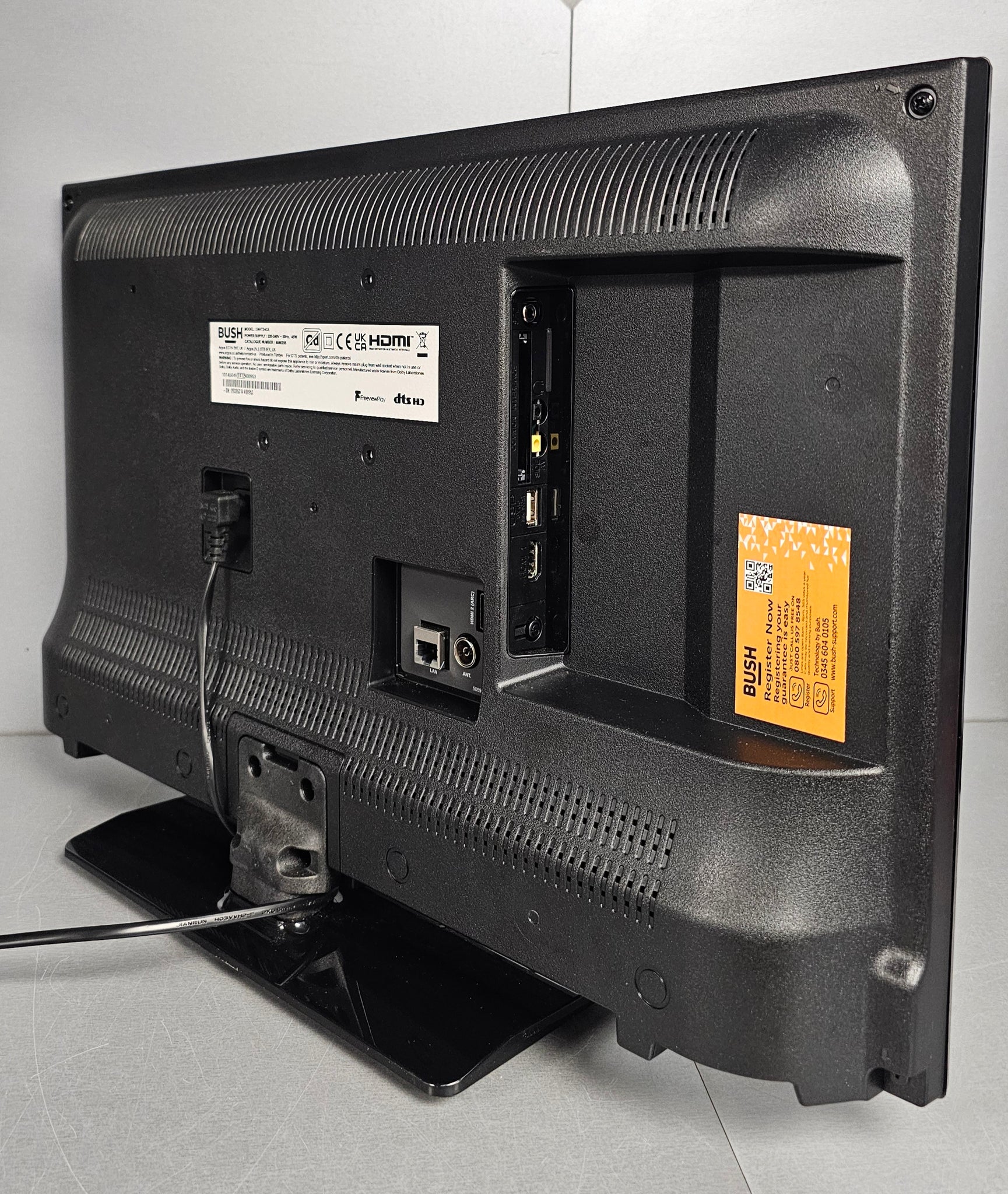 Transform your evenings into cozy experiences with the Bush Smart HD Ready TV Powered by TiVo™. Discover, watch, and enjoy the latest content effortlessly. This HD-ready television delivers crisp resolution, featuring HDR10 to elevate colours and details, rich sound of DTS HD and Dolby audio ensuring a great viewing experience. 2024 model. Dimensions and Weight Screen size: 24 inches. Size of TV H33.4, W55.3, D6.3cm. Size of TV with stand: H36.2, W55.3, D13.5cm. Width of TV stand 28cm. Weight of TV without stand 3.5kg (unpackaged). Weight of TV with stand 3.61kg. Suitable for wall mounting 75 x 75 bracket. Length of cable: 1.5m. Packaged size H46, W62.5, D11cm. Packaged weight 4.45kg. Screen Technology DLED TV Screen. HD Ready display resolution. HDR10. Motion rate 50Hz. Viewing angle 89/89 degrees. Resolution 1366 x 768 pixels. Sound Technology Dolby sound system. 2 x 2.5 watt RMS power output. Connectivity 1 USB port and 2 HDMI sockets. Headphone socket. Built in Wi-Fi. Ethernet connection. Smart TV features Compatible with the following smart apps: Disney+, Netflix, BBC iPlayer, ITV Hub, My5, All 4, Amazon Prime, YouTube. Internet browser. Miracast.
