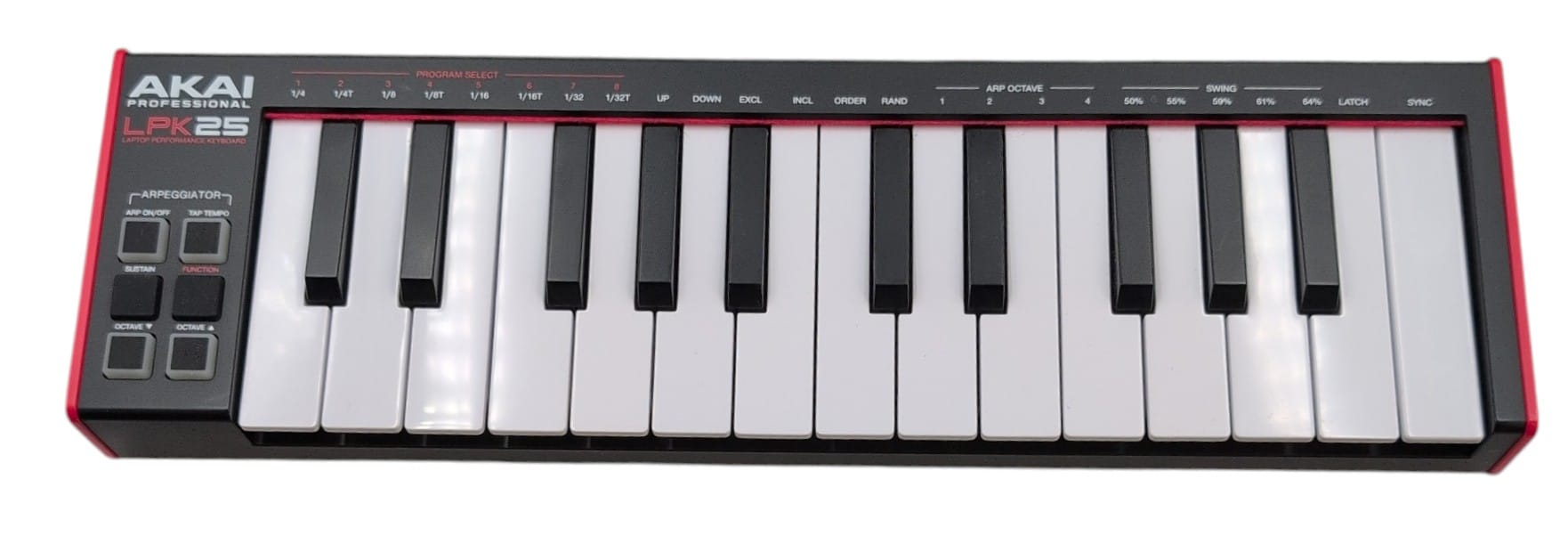 Akai LPK25 (Laptop Performance music Keyboard) is an ultra-portable, 25-key USB MIDI controller designed for producers on the go, featuring velocity-sensitive, synth-action mini-keys. It includes an onboard arpeggiator, sustain button, and octave controls, making it ideal for composing melodies and basslines. It is plug-and-play compatible with Mac/PC and is powered via USB