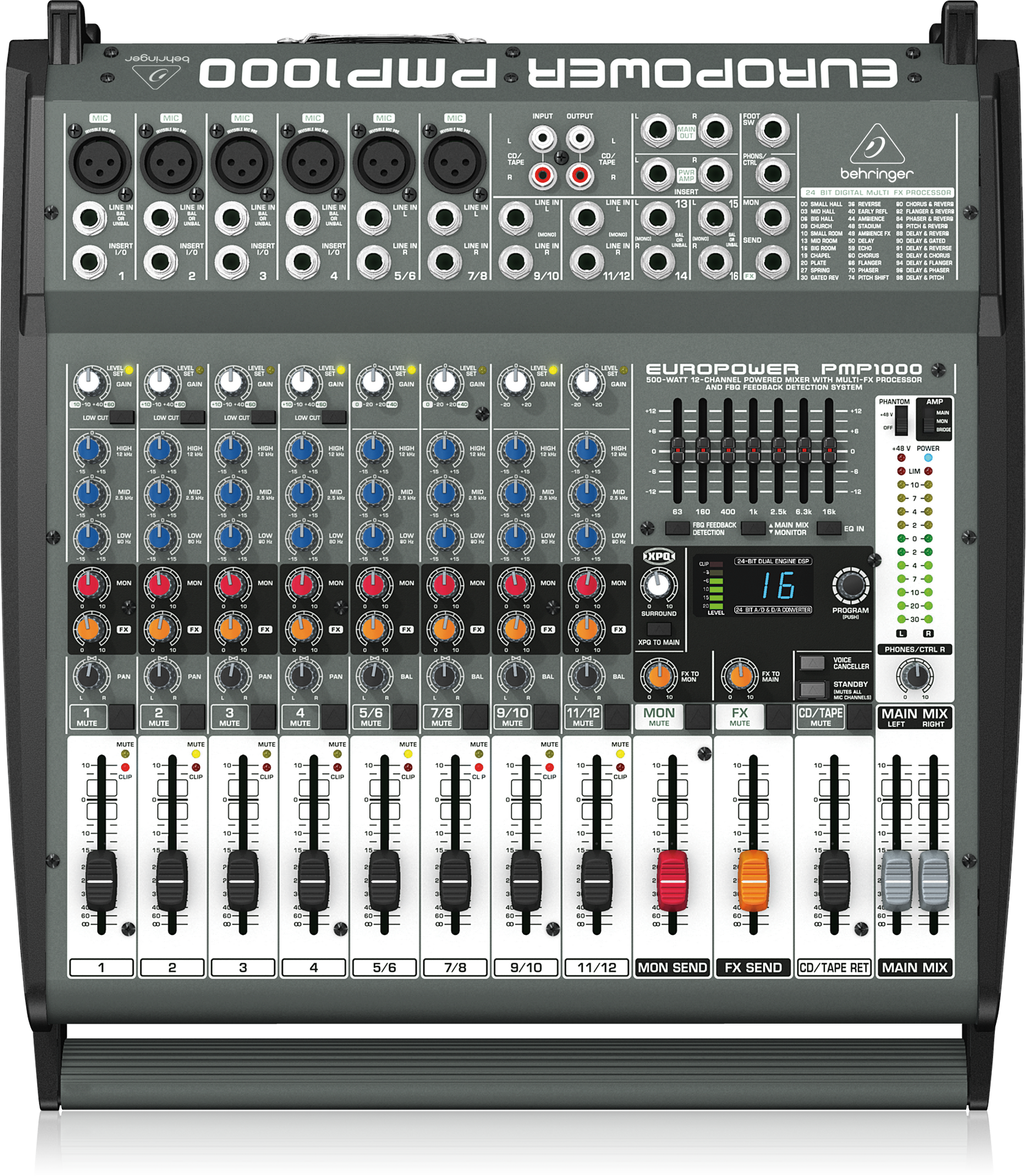 The amazing PMP1000 Powered Mixer packs tremendous power (2 x 250 Watts stereo or 500 Watts in Bridged mode), while maintaining an incredible power-to-weight ratio. The 12-channel PMP1000 features 9 high-quality mic preamps, 4 stereo channels, a studio-grade 24-bit Multi- FX processor with 100 awesome presets including studio-class reverbs, delays, pitch shifter and various multi-effects, plus a 7-band stereo graphic EQ with our FBQ Feedback Detection System, for the ultimate in high-quality sound and feedback- free performance.