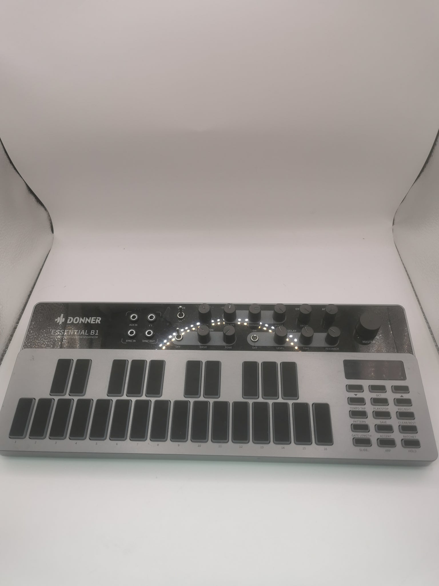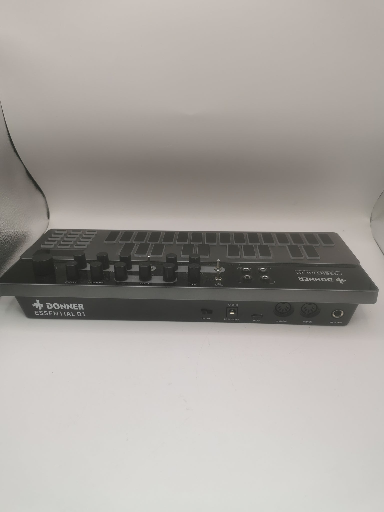 The Donner Essential B1 is an analog bass synthesizer and sequencer designed for intuitive operation and classic acid sounds. This compact device offers 128 genre presets for electronic music and 128 user-programmable slots for custom sound creation. The interface integrates modern silicone touchpads with backlighting as an alternative to traditional keyboard layouts, enabling both sequencer and live performance capabilities. Built-in saturation and delay effects allow for deep bass sound shaping with classic distortion and echo characteristics. The synthesizer provides extensive connectivity with USB-MIDI compatibility for DAW integration and functions as a MIDI controller. Audio connections include a 3.5mm audio signal input for multiple device connections, a 6.35mm mono output for master switching, and a 3.5mm audio output for headphone monitoring. The device measures approximately 30 cm in width, 15 cm in depth, and 5 cm in height, weighing around 1.2 kg. The design combines modern interface elements with classic synth functionality, offering both retro-inspired sounds and contemporary workflow benefits. The Essential B1 operates with standard power supply requirements and maintains stable analog signal processing across its parameter ranges. The construction features durable materials with precise knobs and responsive touch surfaces. This synthesizer serves as a versatile tool for electronic music production, live performances, and studio applications, providing direct access to classic bass synthesis while remaining compatible with modern music production setups.