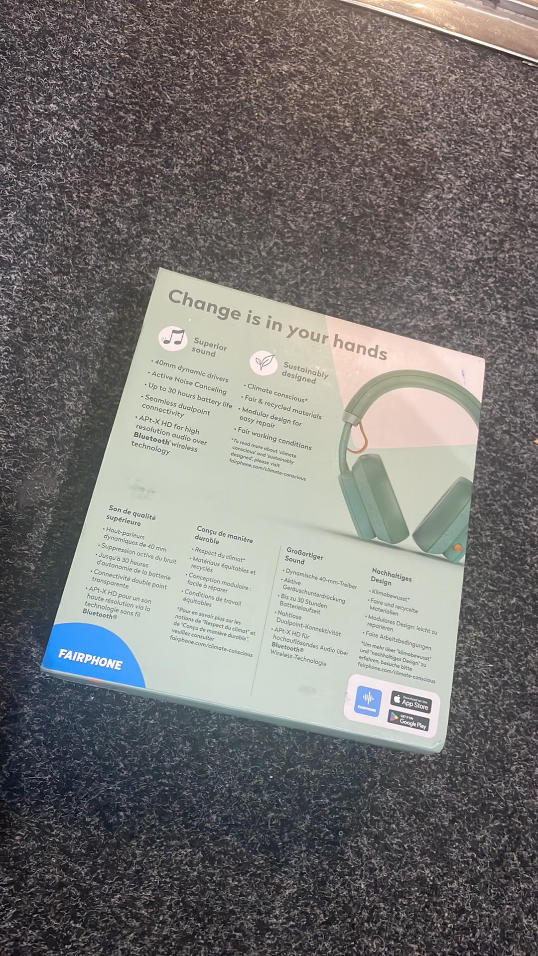 Boxed Fairphone Fairbuds XL (Green) with Original Wires Noise Cancelling, 30 Hours Battery Life, Seamless Point Connectivity, Bluetooth Connectivity.