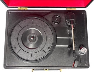 PORTABLE RECORD PLAYER: The portable stand-alone record player is high quality and lightweight to carry everywhere you need. BUILT-IN SPEAKERS: Compact and powerful speakers with well-tuned sound quality generate a magnificent sound you just want to listen to. EASY OPERATION: Put a record on the turntable of this retro record player and after listening through the Auto Stop function will automatically end playback and preserve your needle. SUITCASE DESIGN: This vintage vinyl record player comes in a beautiful suitcase design that will complement your home decor and makes an ideal gift choice for family and friends. Dimensions W 35.5 x D 27.5 x H 13.5 cm