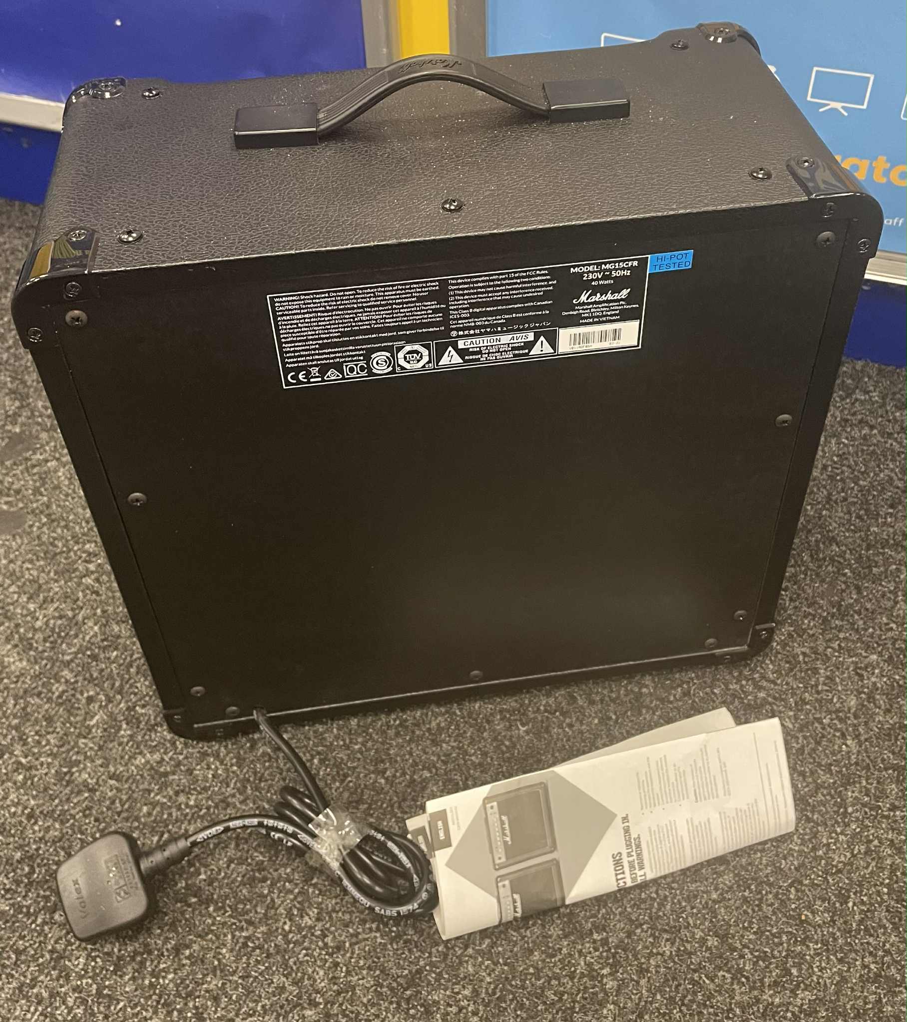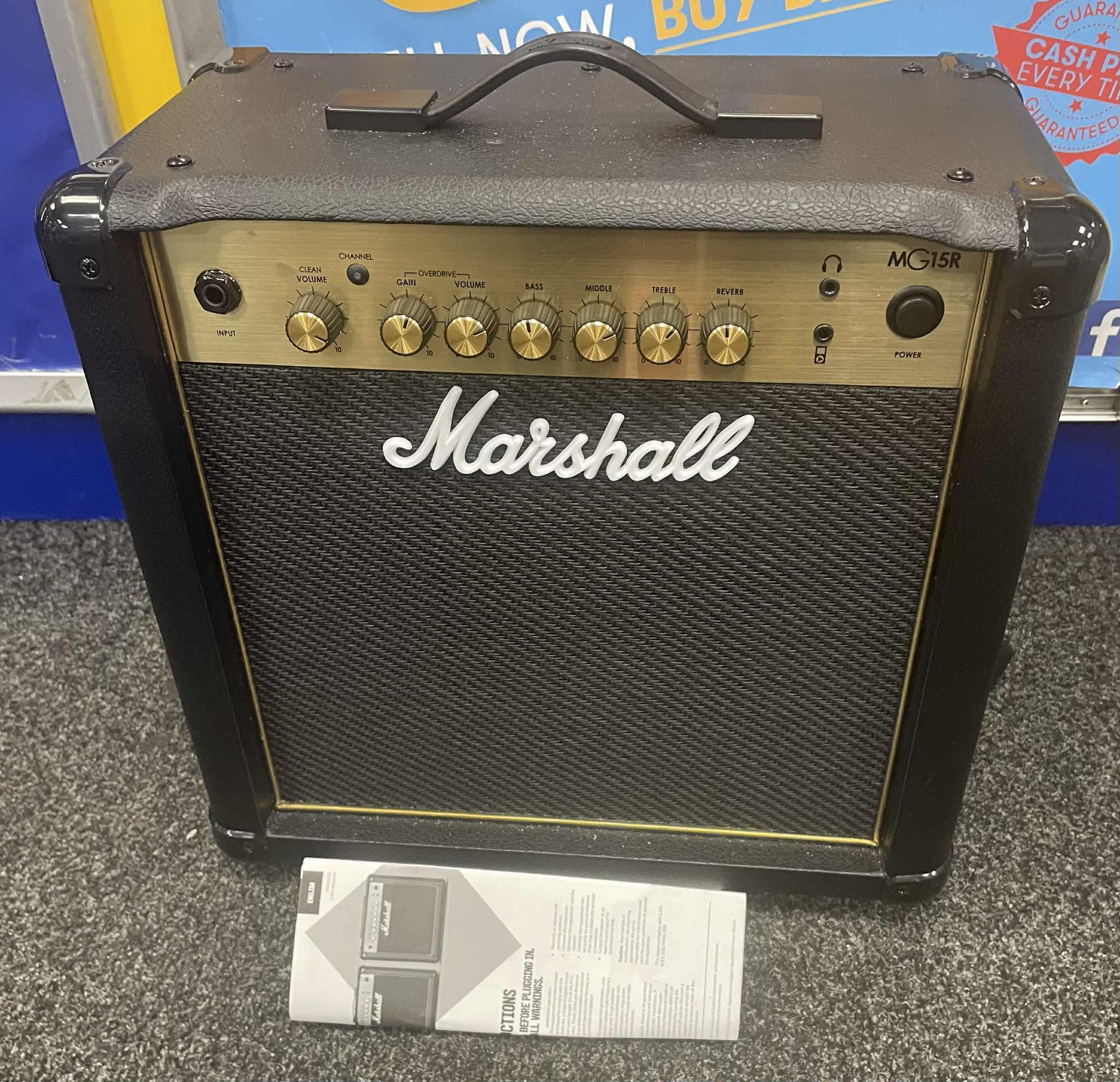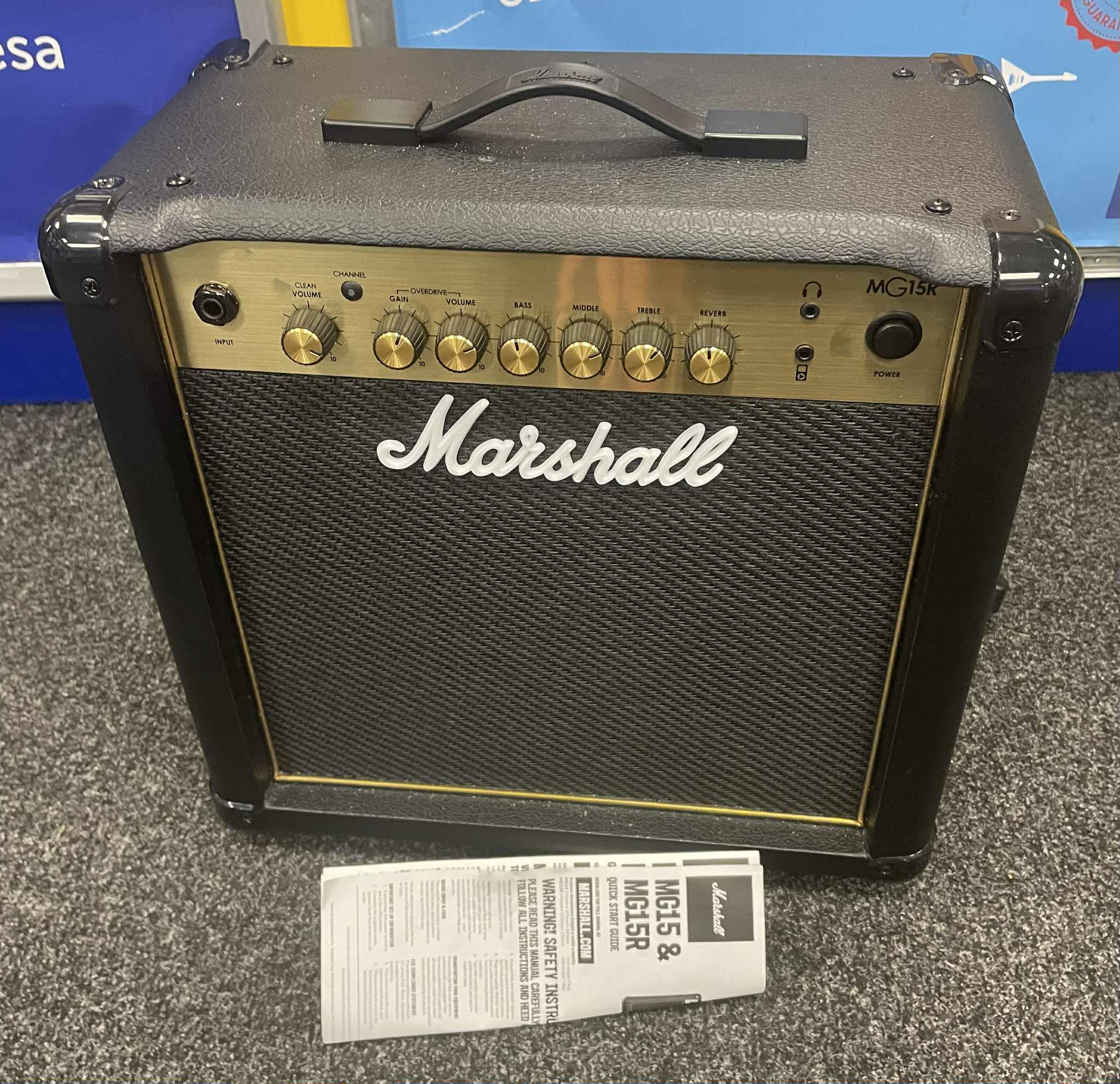 Marshall mg 15cfr 40 15-watt, 15W combo amplifier. It is a practice amp with a modern carbon fibre design, a 2-channel (clean and overdrive) 15-watt output, a built-in reverb, and a 3-band equalizer. It includes a headphone jack for silent practice and an MP3 input to play along with music.