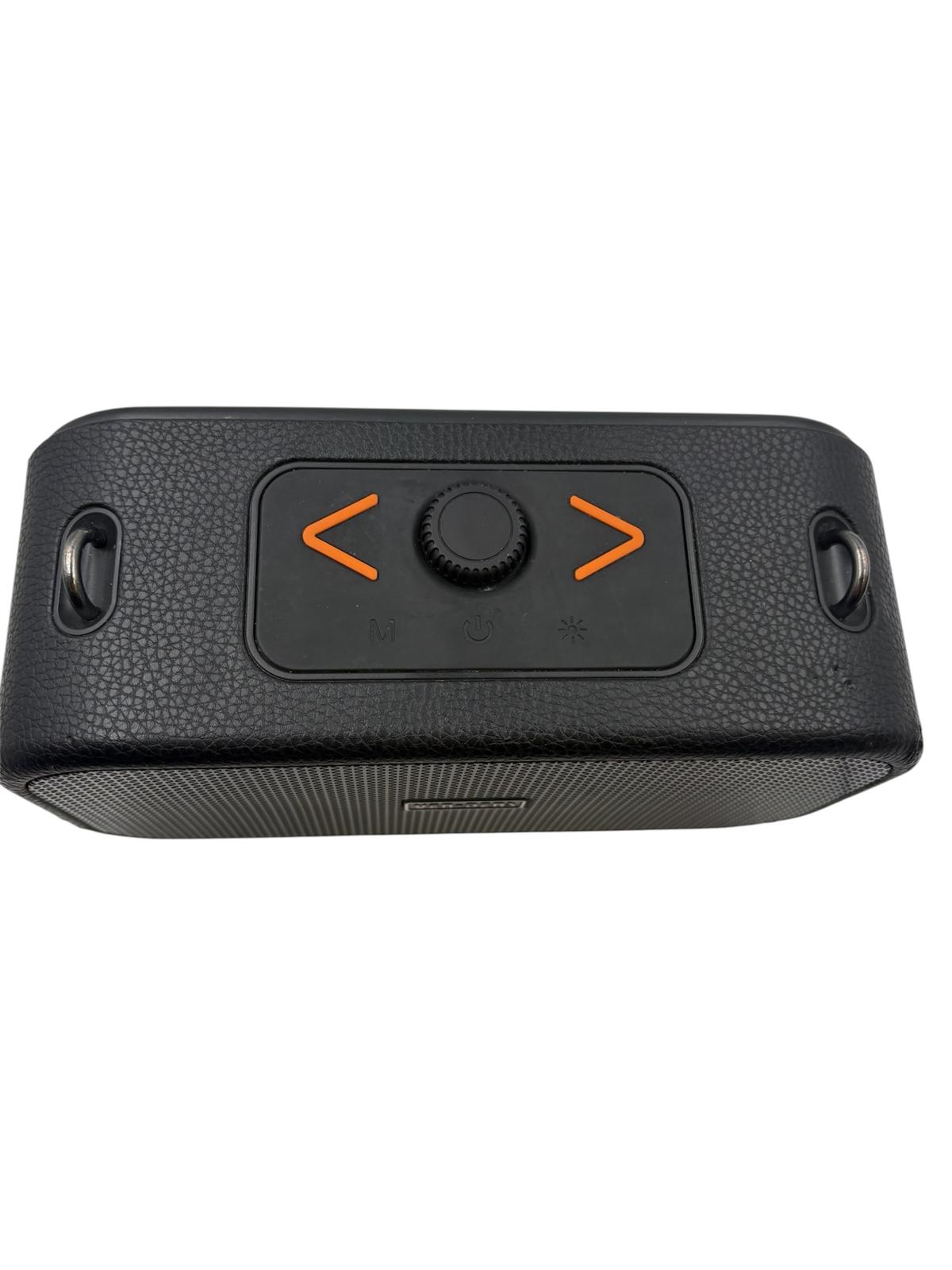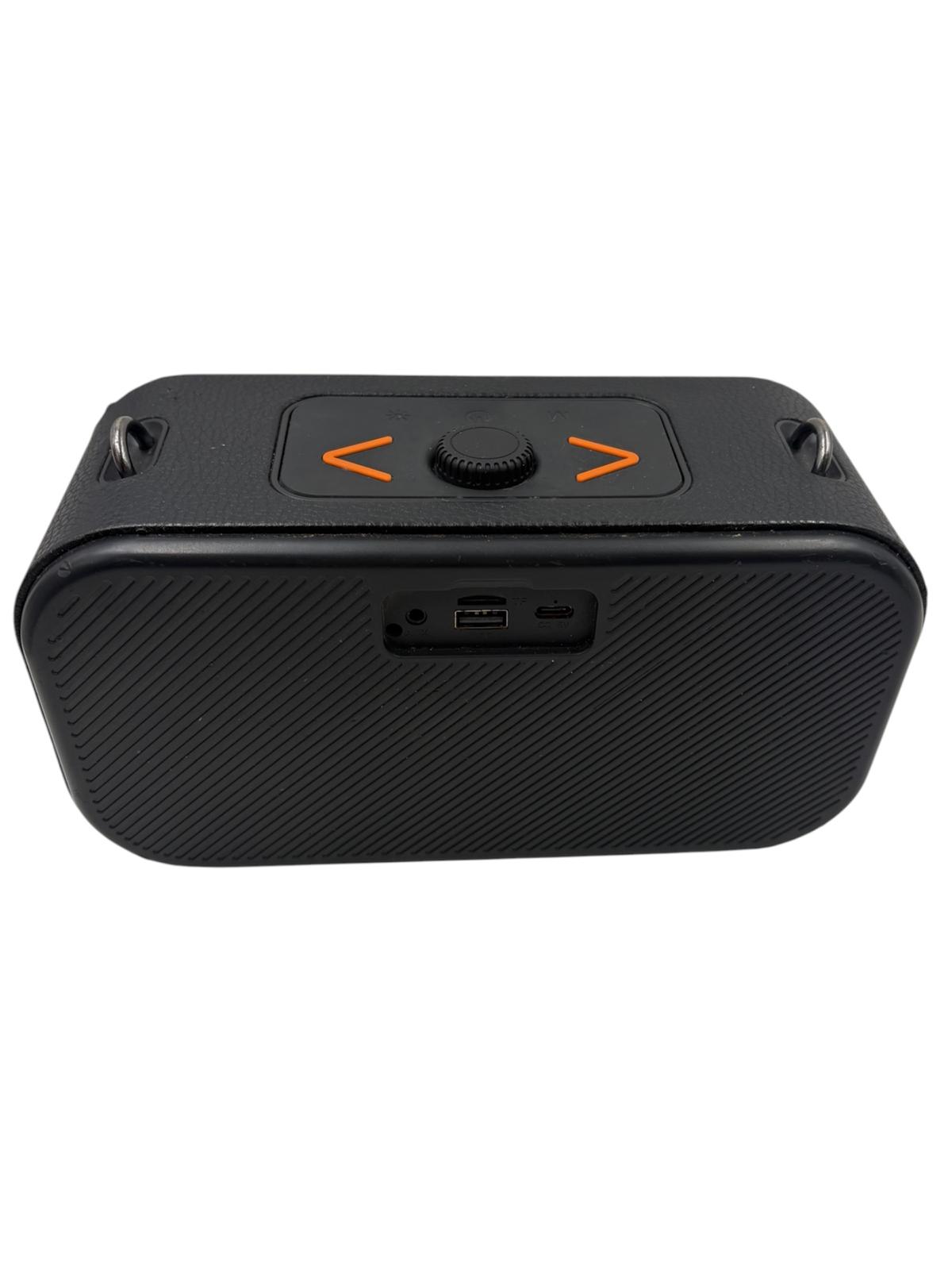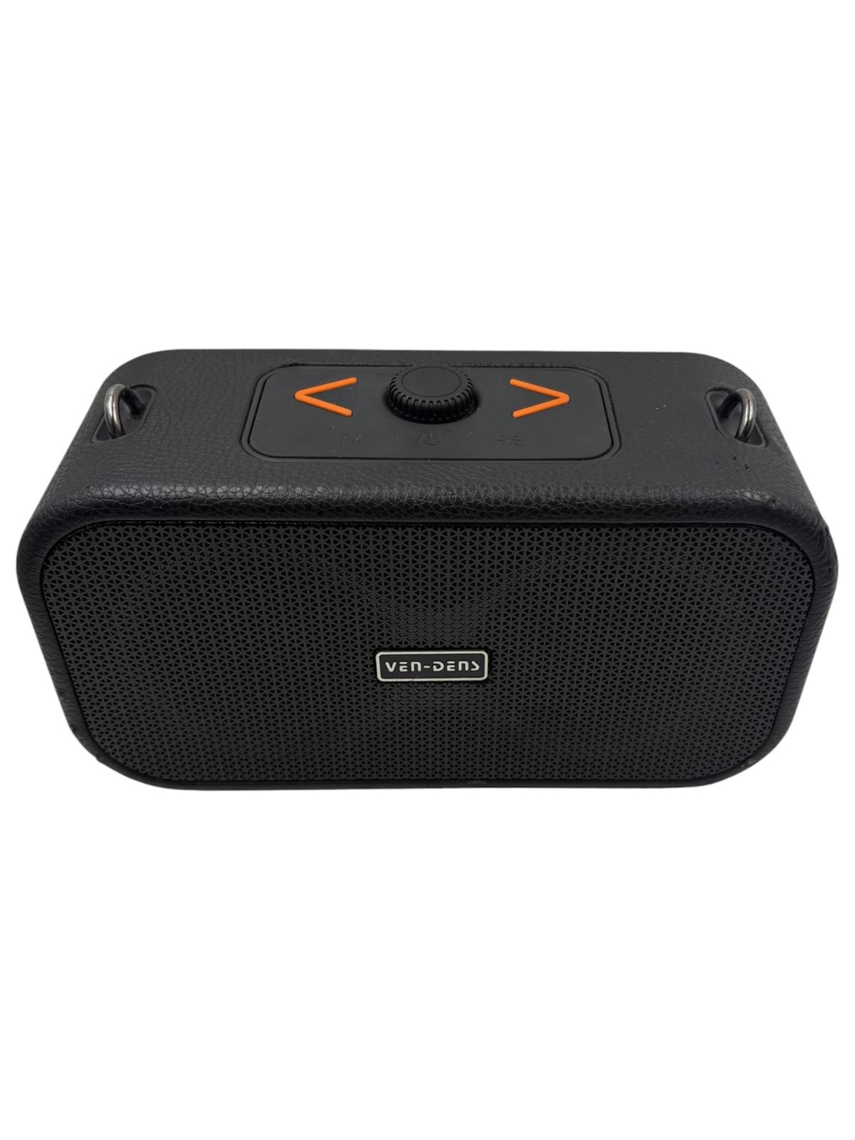 The image shows a Ven-Dens Portable Bluetooth Speaker, a compact and rugged audio device designed for versatility and outdoor use. It features a sleek black, leather-textured finish and a metal mesh grille on the front, accented by a distinctive "VEN-DENS" logo plate. The top-mounted control panel is minimalist and user-friendly, sporting two bright orange playback buttons for skipping tracks and a central textured volume knob for tactile adjustments. For added portability, the speaker includes sturdy metal loops on either side, allowing a shoulder strap to be attached for easy transport to parties, travel, or outdoor gatherings.