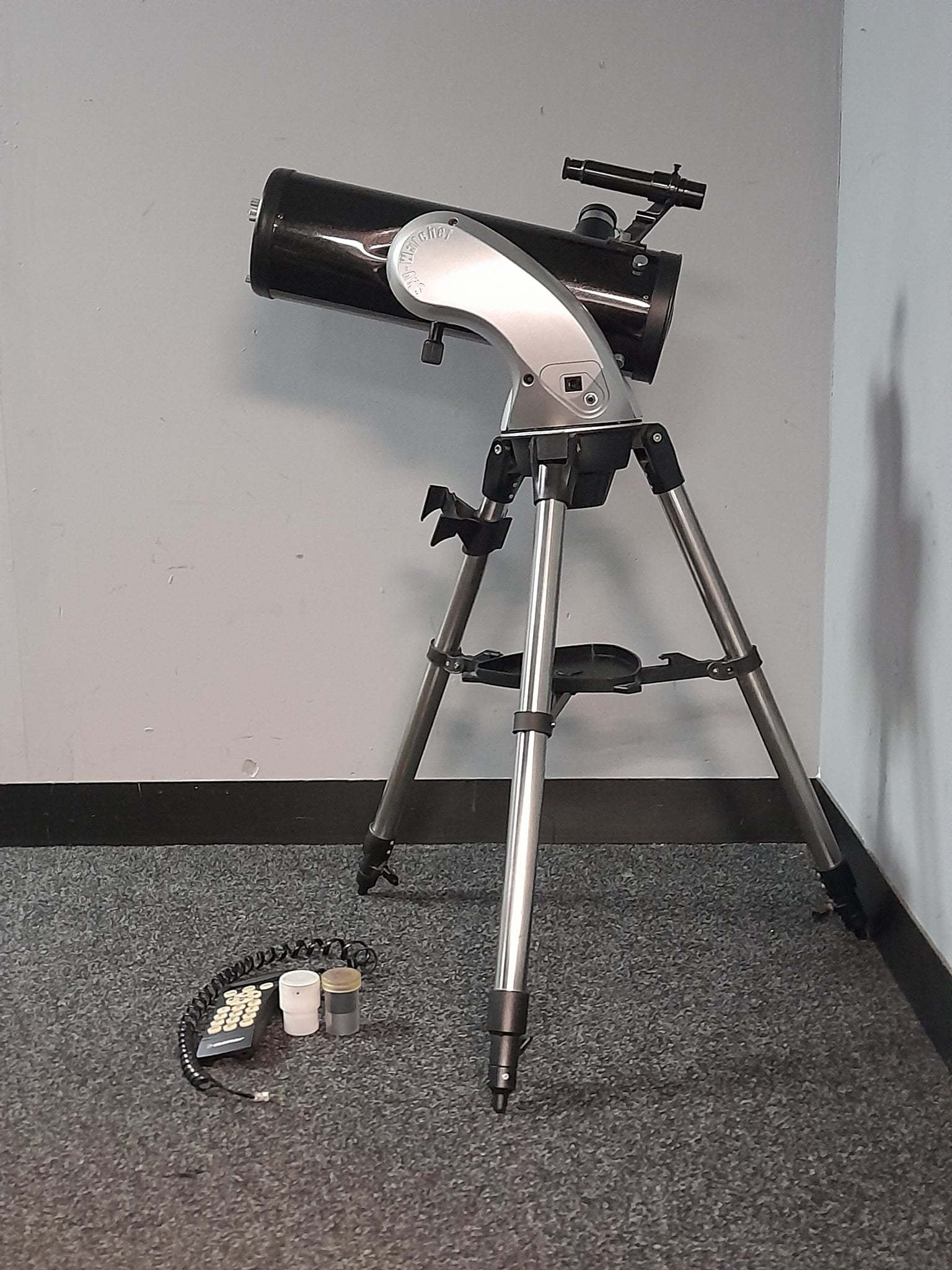 item is used but in good condition and working the remote for this model has got a default which is the connector that connects the remote to the telescope is missing the locking in catch which makes it unusable but the telescope itself can be used manually
