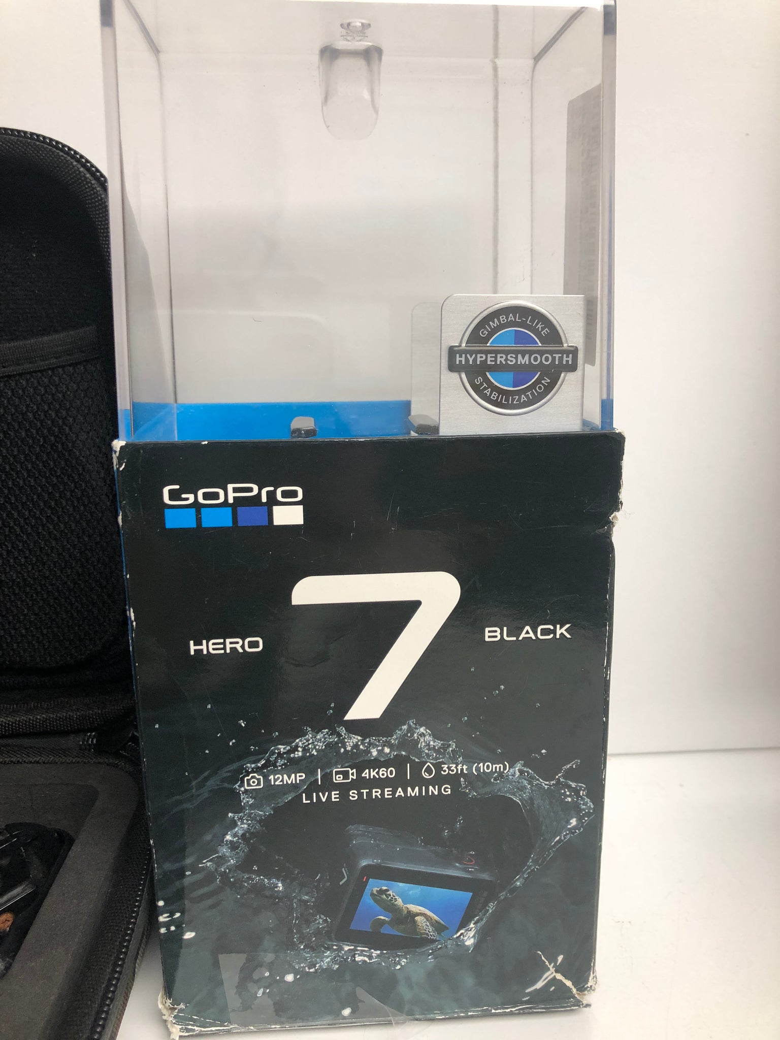 All three models are waterproof up to 33ft (10m) without a housing, feature a 2-inch LCD touchscreen, voice control, and digital image stabilization, though the quality and additional features vary by model, the video quality across the range, with the HERO7 Black's HyperSmooth stabilization being a particular highlight, offering "gimbal-like" footage. box, case and accessories included