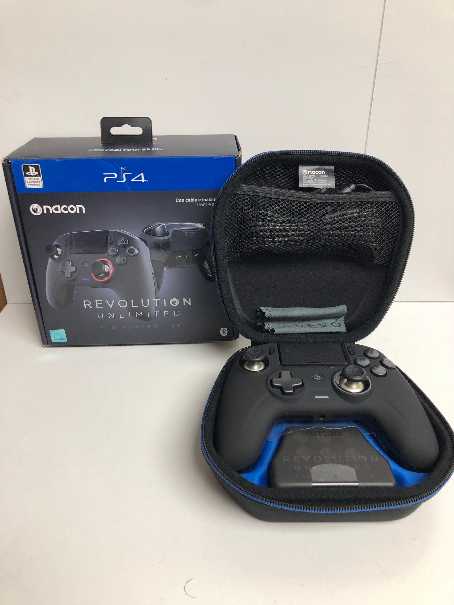 Nacon's pure wireless eSports Game Controller for PS4 features a unique camouflage pattern. The Revolution Unlimited is designed for competitive gaming and can be fully customized for tailored performance using the included software. The Revolution Unlimited Pro Controller combines all of Nacon's technological expertise in competitive gaming on PS4. With its wireless gaming mode, it is the ideal choice for the most demanding gamers. The Revolution Unlimited Pro Controller is Nacon's first controller for PS4 with a wireless mode. It also offers all the customization options, both manual and via software, that competitive players need. The sensitivity of the sticks on the Revolution Unlimited Pro Controller can be easily adjusted thanks to interchangeable heads (concave or convex) and shafts (various diameters). The hidden compartments in the grips of the controller can be filled with additional weights. With the built-in Bluetooth receiver, you can choose between wired and wireless mode. Additionally, it features a headset jack for chat and audio functions in both communication modes. The controls on the underside of the controller allow you to quickly adjust the headset volume, game mode, and communication mode of the controller. boxed, in new condition with original charger and accessories