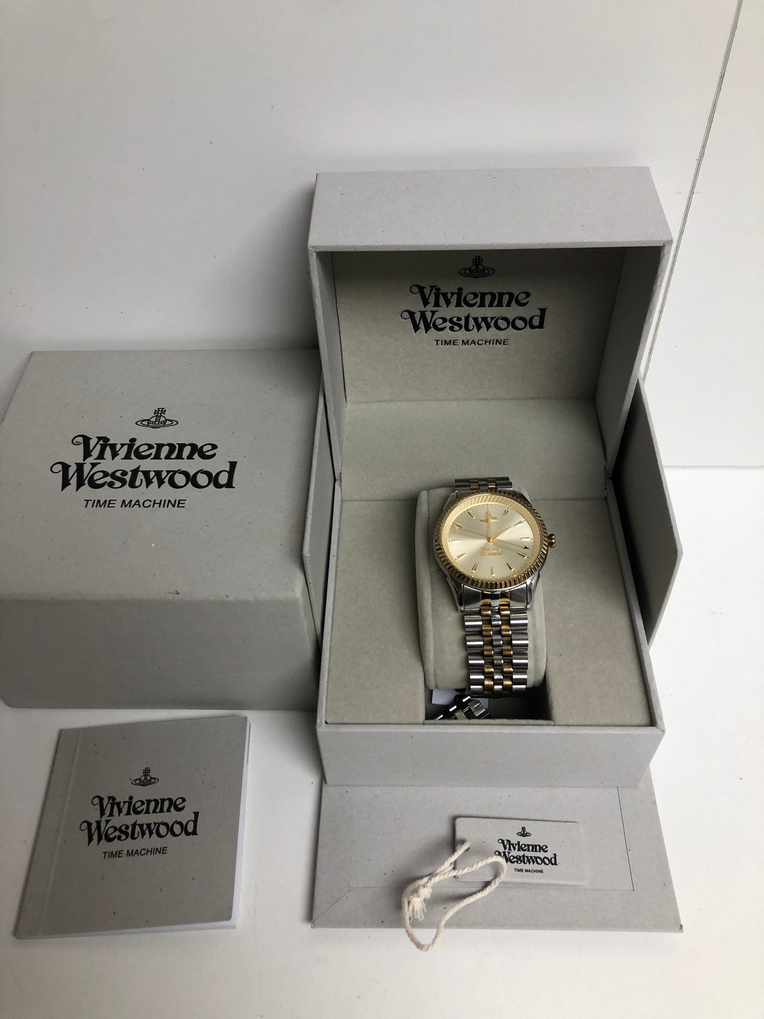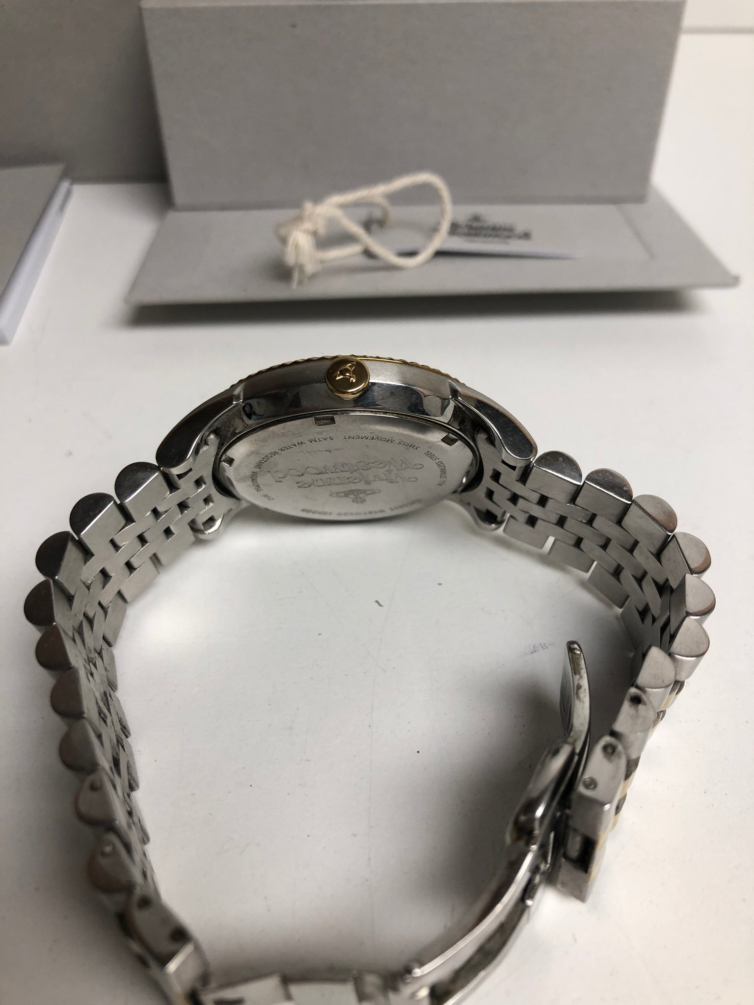 Add a touch of elegance to your wrist with the Seymour Bracelet Watch by Vivienne Westwood. This women's timepiece boasts a champagne sunray-brushed dial, a coin-edged bezel, and a two-tone Jubilee bracelet with deployment clasp. The watch showcases signature branded touches and is 5ATM water resistant. Its case diameter measures 37mm and it is made of 100% stainless steel. Presented in a branded box.