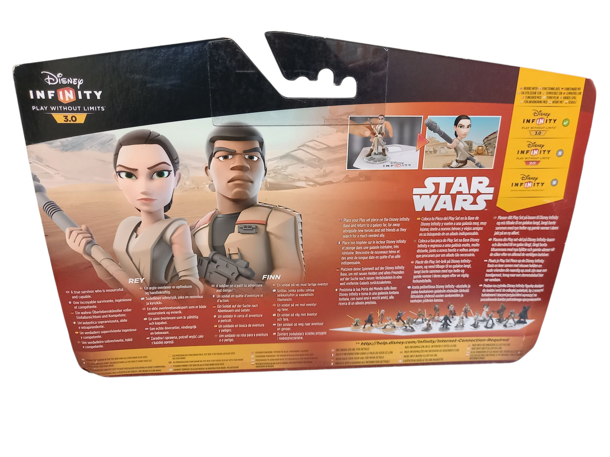 Place your Play set piece on the Disney Infinity Base and return to a galaxy far, far away alongside new heroes and old friends as they search for a much needed ally. Disney Infinity 3.0 Star Wars: The Force Awakens Rey Figure – A true survivor who is resourceful and capable. Disney Infinity 3.0 Star Wars: The Force Awakens Finn Figure – A soldier on a path to adventure and danger.