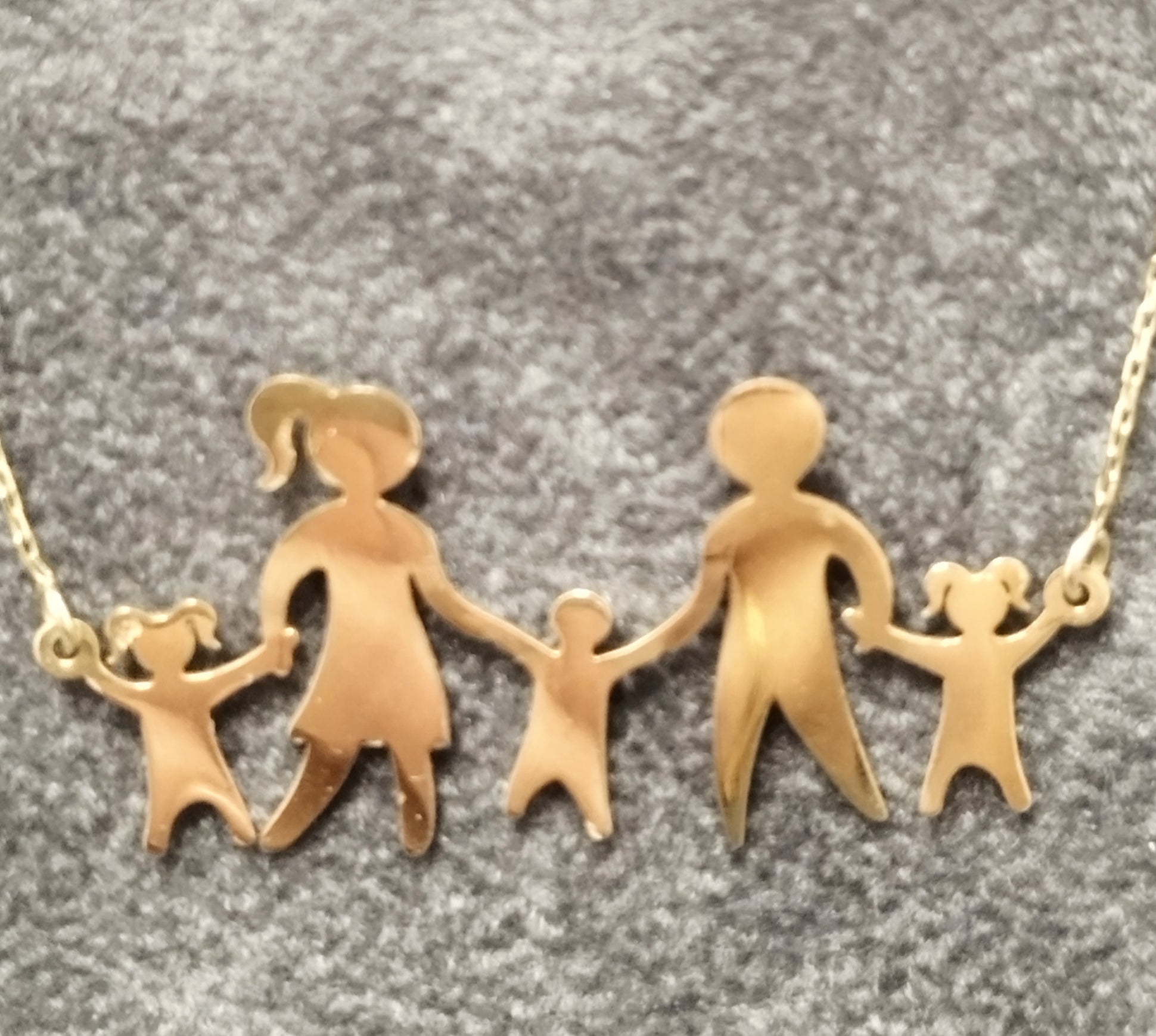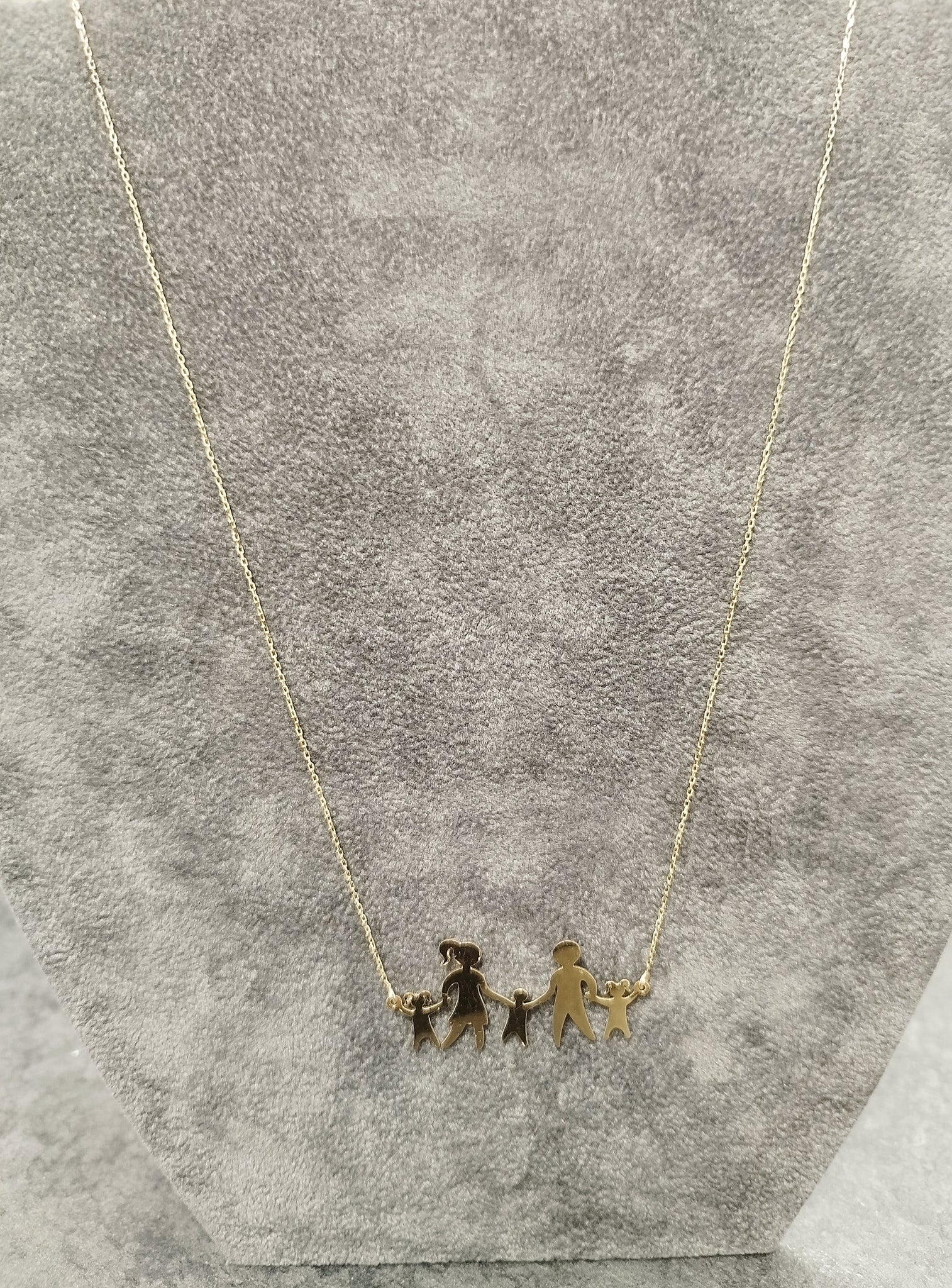A lovely 14ct yellow gold family holding hands silhouette necklace. The 5 person pendant has a polished finish. A perfect piece to celebrate family connections.