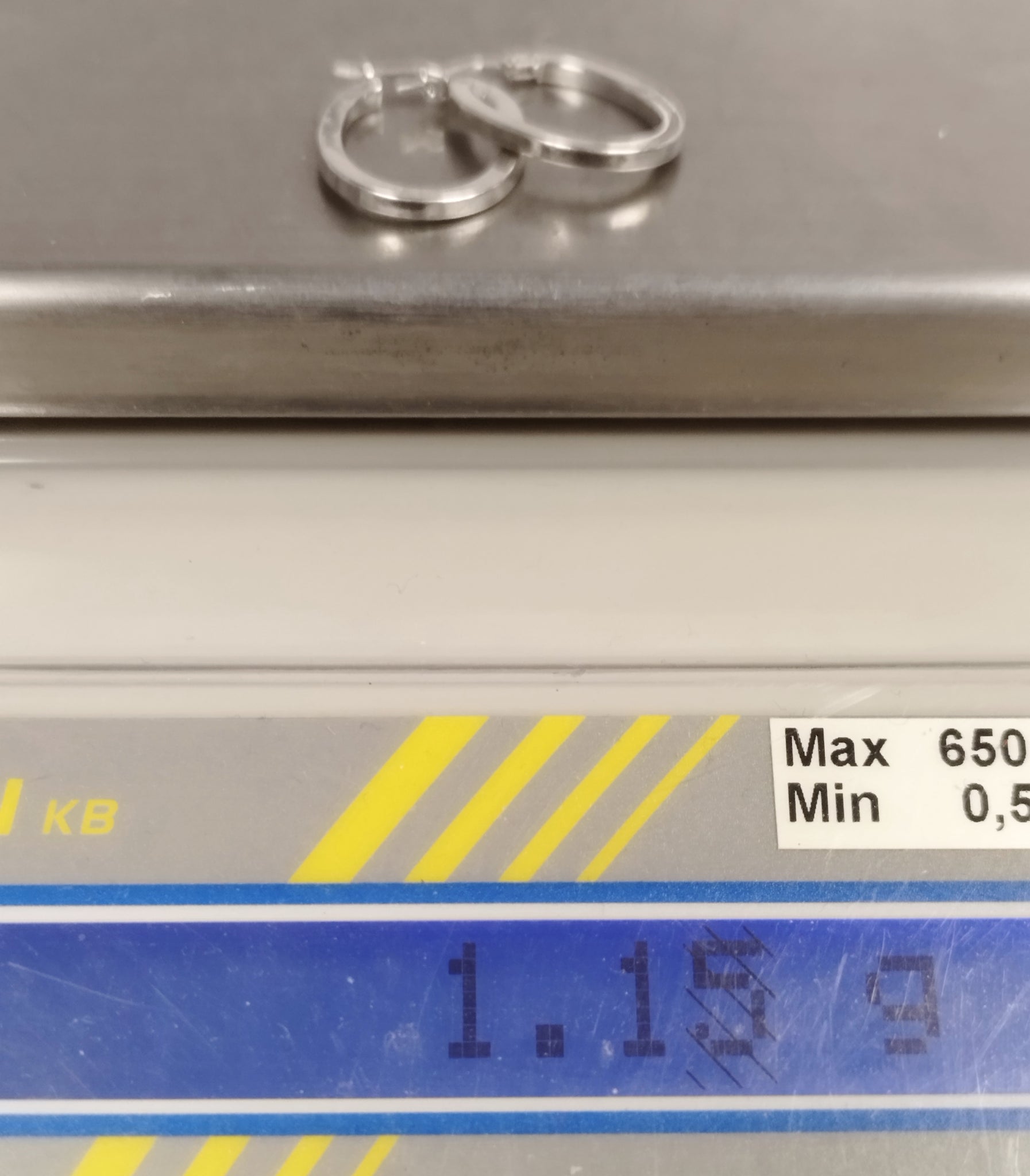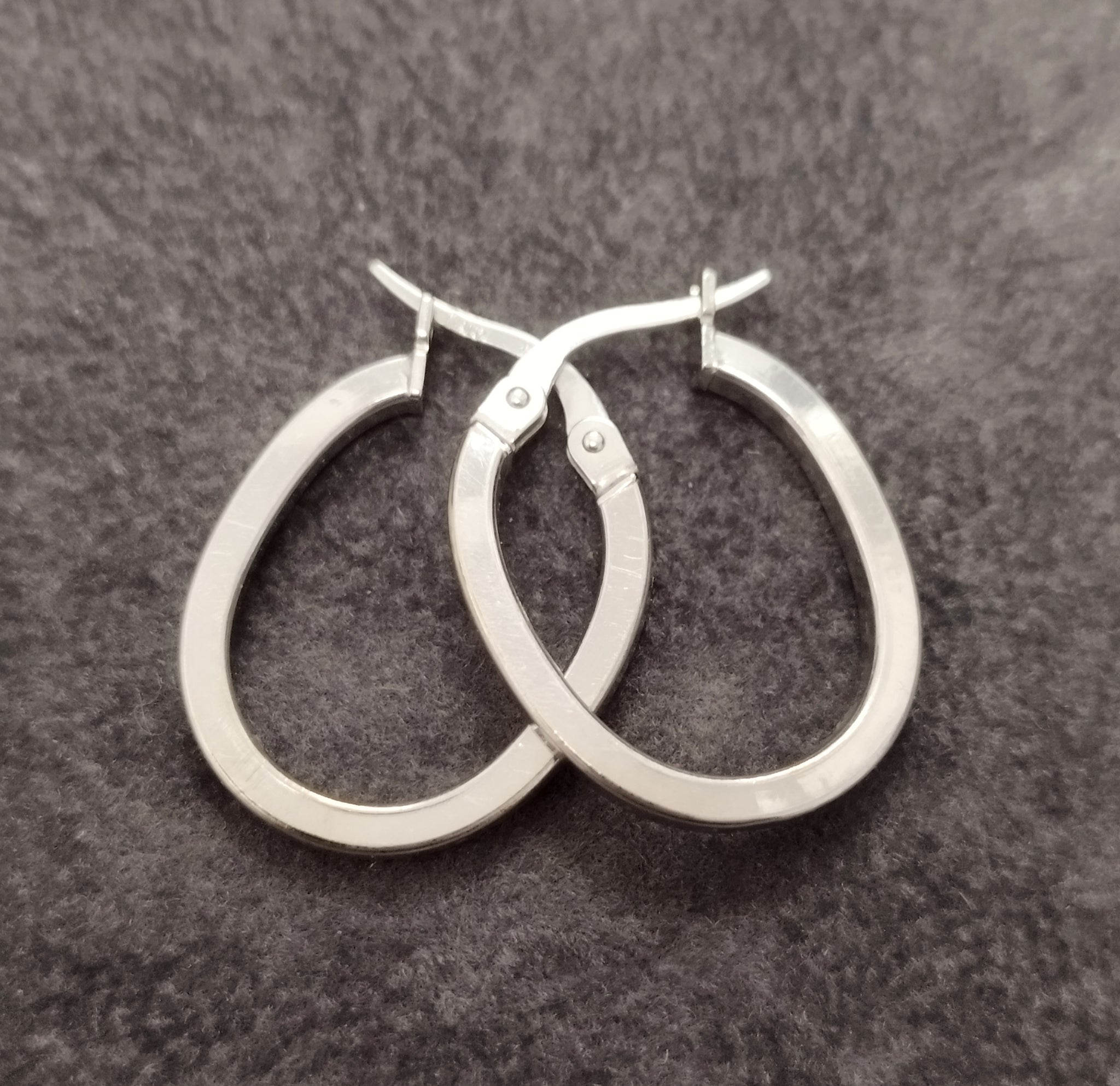 9ct white gold oval hoops with hinged lever fastening. The hoops are square edged rather than round, giving a more modern appearance..