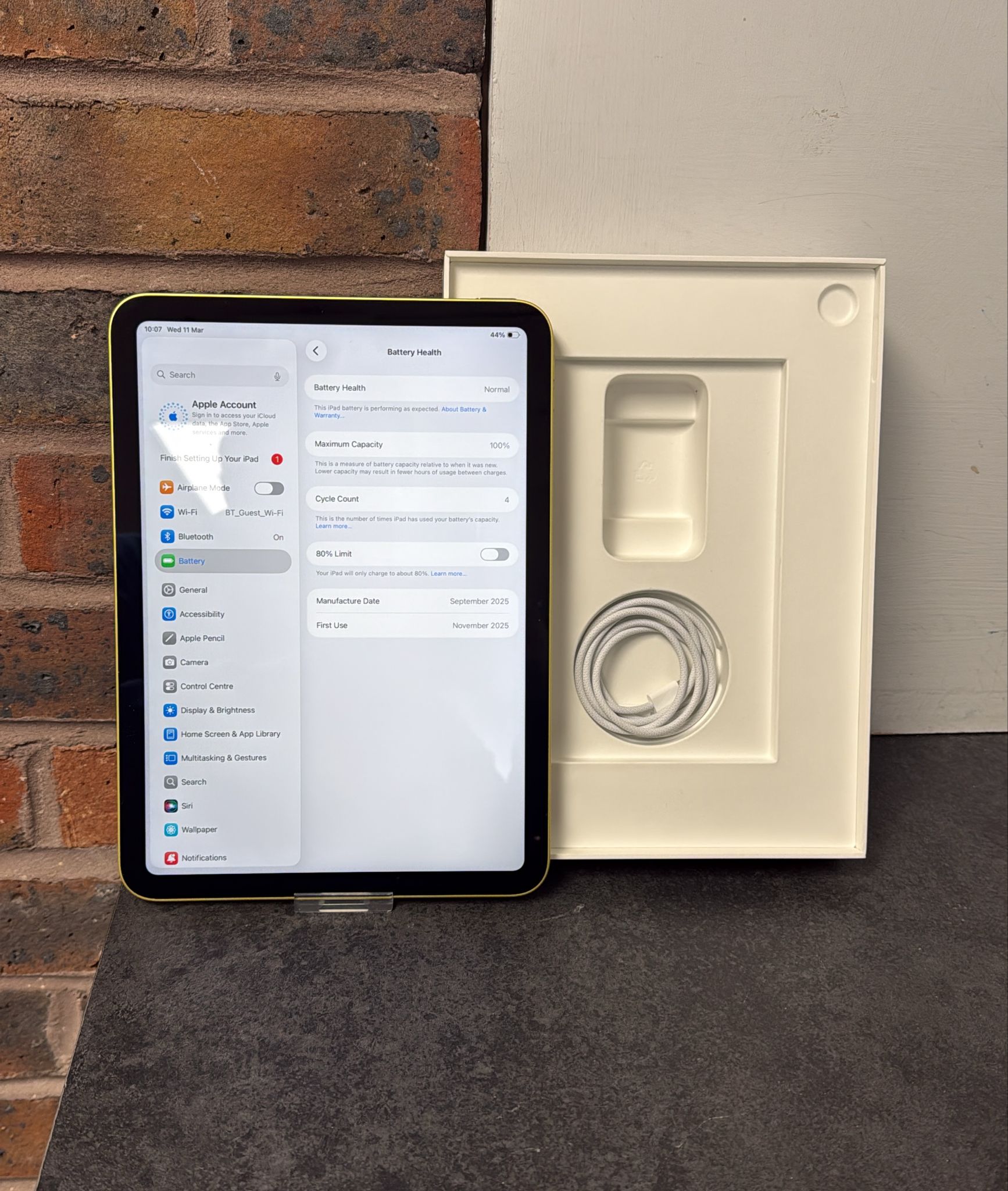 This Apple iPad A16 (128GB, Yellow) is fully working and in good used condition, showing only minimal signs of previous use. It has been well looked after and performs smoothly across apps, browsing, streaming, and everyday tasks.