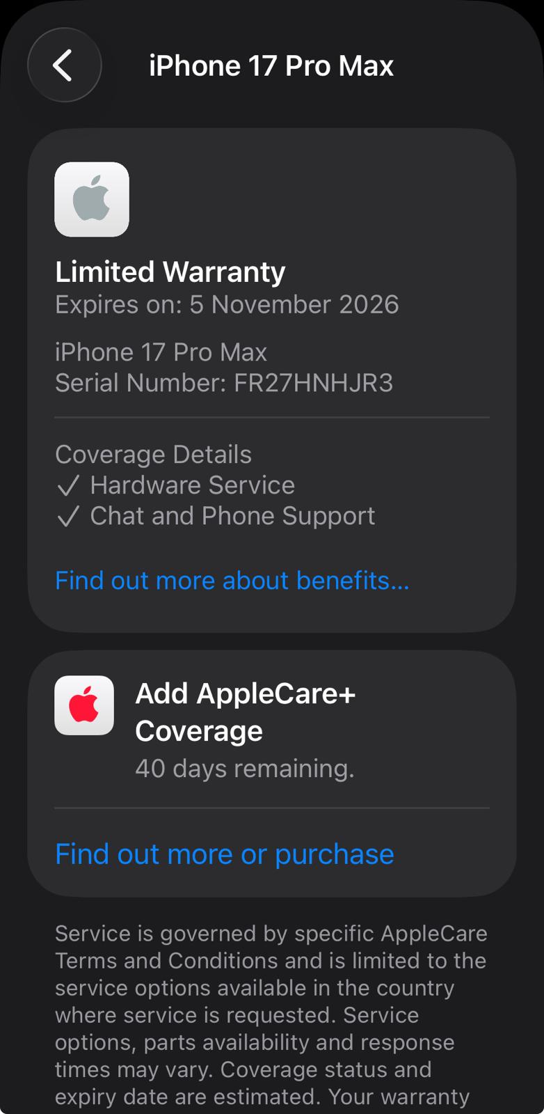 | Model | Apple iPhone 17 Pro Max (A3526) |