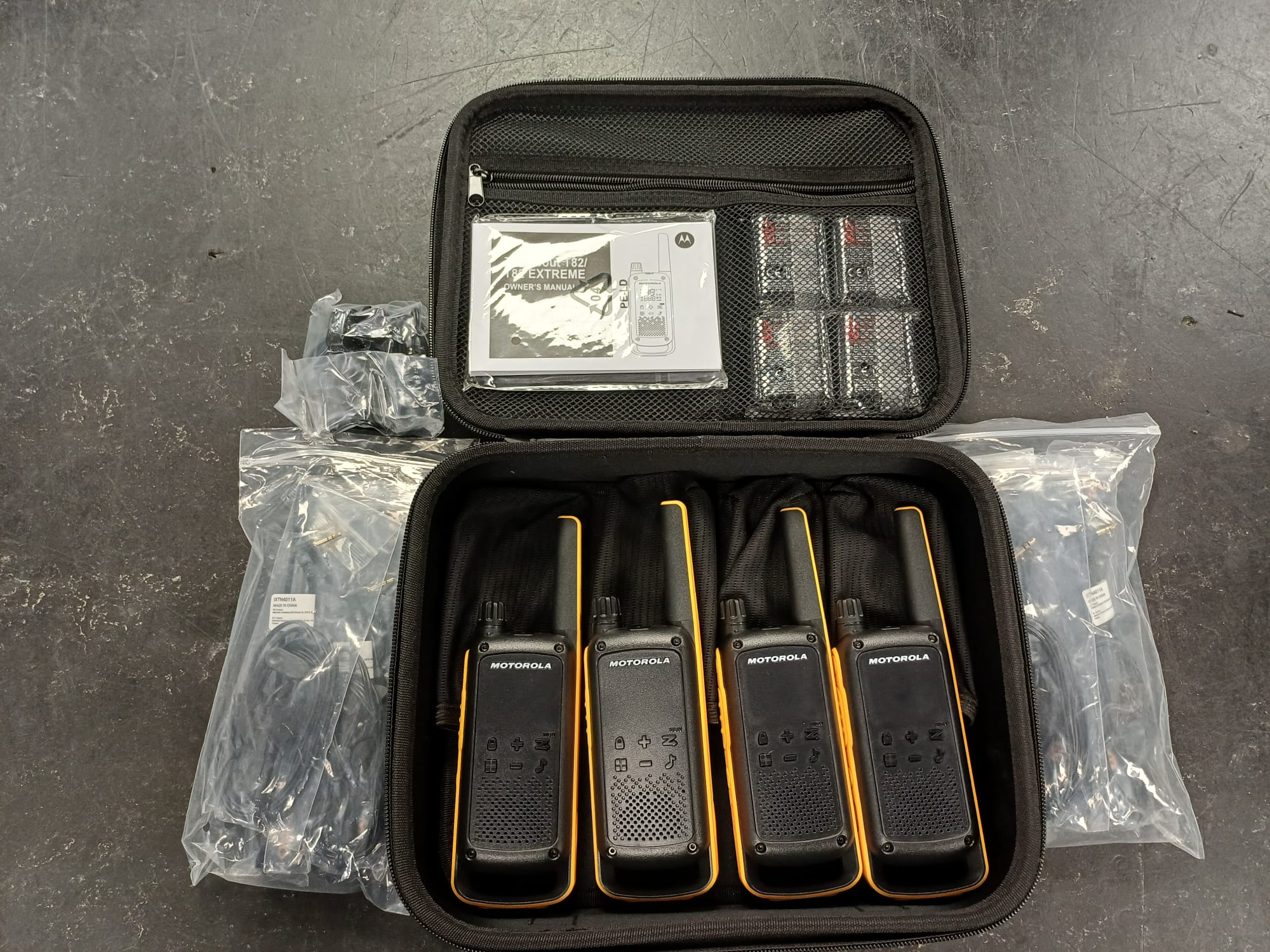 Motorola Walkie Talkie T82 Extreme Quad Pack 🔊 Rugged, Reliable, and Ready for Anything - 4 x T82 walkie talkies – perfect for family outings, events, or work crews. - IP68 waterproof + MIL-810G tested – withstands dust, water, and drops (up to 1.5m). - 22 FGMRS channels, 38 CTCSS/DCS codes – clear communication range (up to 10km in open areas). - Rechargeable batteries – up to 18 hours per charge (included). - Compact and lightweight – clip-on ready (belts, backpacks). 💡 Why It’s for You - Family-friendly – great for festivals, hiking, or keeping kids connected. - Business use – construction sites, security teams, or events. - No subscription fees – instant push-to-talk. 🔌 Extras - VOX hands-free, 1000mAh batteries, and belt clips.