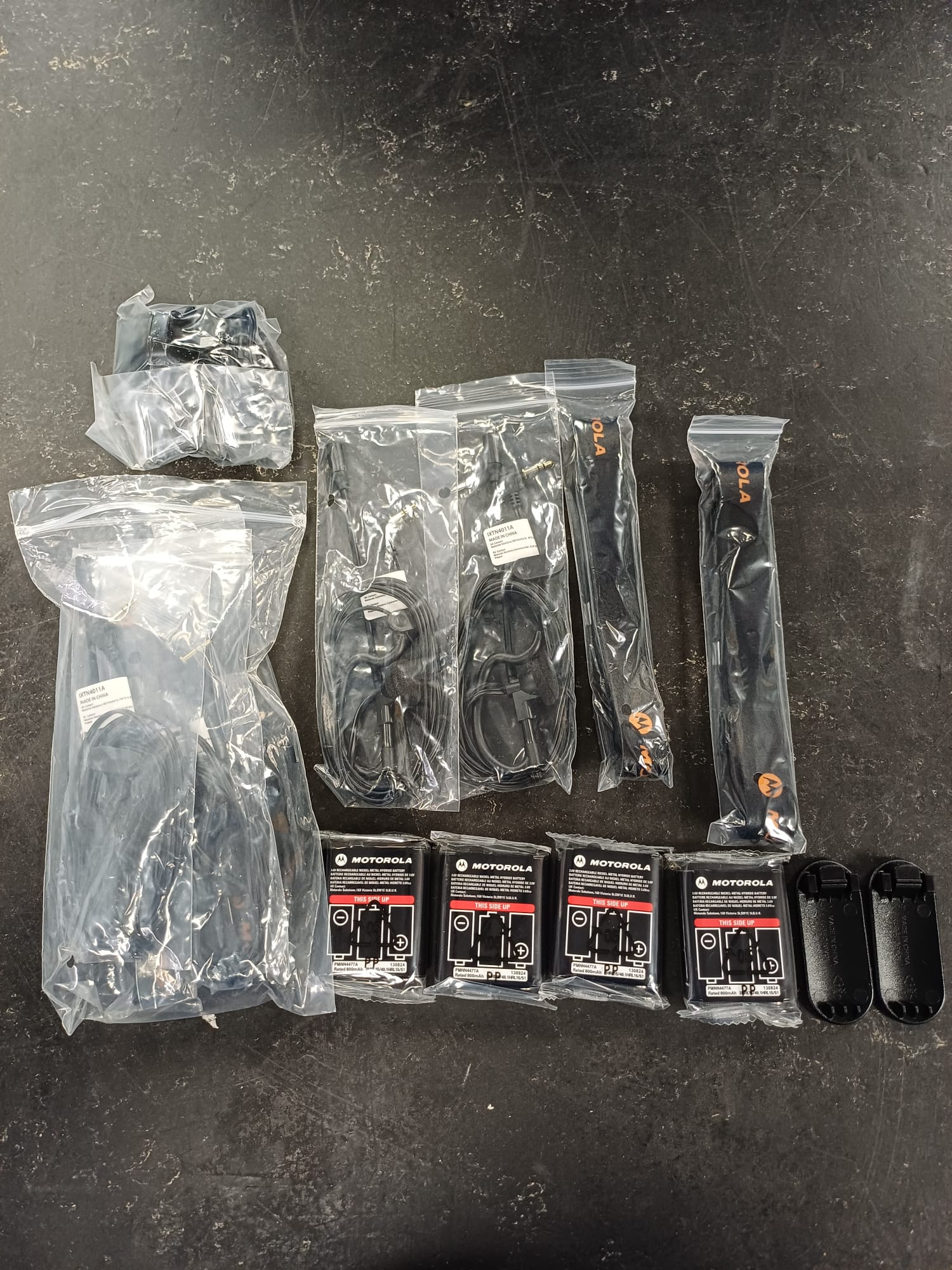 Includes case, batteries, belt clips, lanyards, earpieces, as new