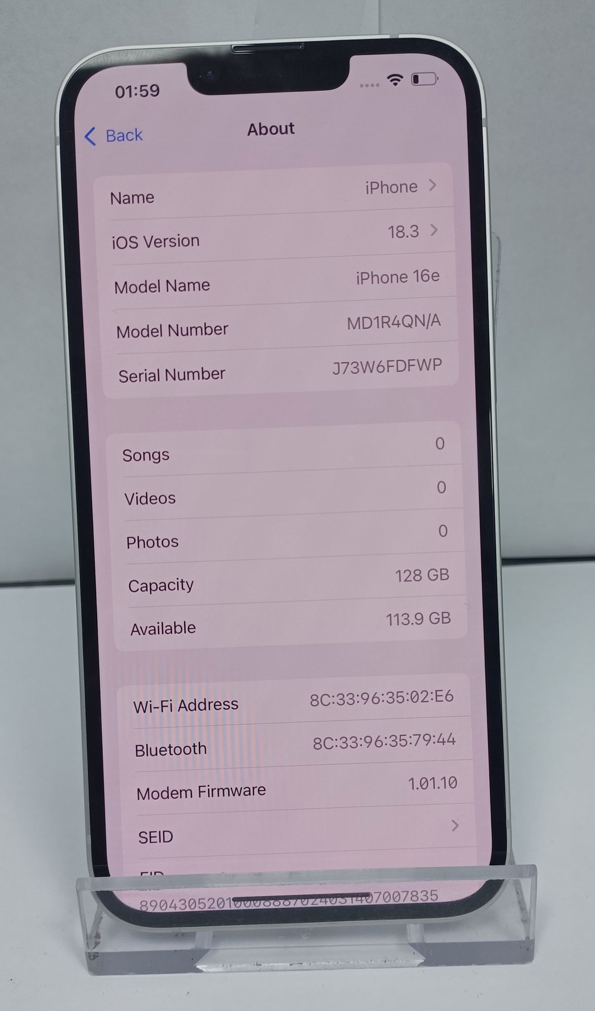 Product Overview The Apple iPhone 16e 128GB in white combines cutting-edge technology with elegant design. Powered by the advanced A18 chip, this smartphone delivers exceptional performance for both everyday tasks and demanding applications. The device features a stunning 6.1-inch Super Retina XDR display with 2532 x 1170p resolution and 460 PPI for crisp, vibrant visuals. Revolutionary Camera System Capture life's moments in extraordinary detail with the 48MP Fusion camera, which also enables a 12MP 2x Telephoto option. The camera system features sensor-shift optical image stabilisation and support for super-high-resolution photos at 24MP and 48MP. For selfies and video calls, the 12MP front camera delivers stunning results with Smart HDR 5 technology and Portrait mode with Focus and Depth Control. Built for Apple Intelligence Experience the power of Apple Intelligence with personal, private, and powerful features that help you write, express yourself, and get things done effortlessly. The A18 chip not only powers these intelligent features but also ensures smooth performance for gaming and regular iOS updates, keeping your smartphone feeling new for years to come. Long-lasting Battery and Durable Design Enjoy up to 26 hours of video playback with the impressive battery life - the best in any 6.1-inch iPhone. The device features a durable design with Ceramic Shield front, which is tougher than any smartphone glass, and IP68 water and dust resistance for added protection. The customisable Action Button provides quick access to your favourite apps and features. Connectivity and Security Stay connected with 5G capabilities, WiFi 6, and Bluetooth 5.3. The USB-C charging port ensures compatibility with a wide range of accessories and faster charging. For security, Face ID provides secure unlocking, app authentication, and payment verification, ensuring your personal data remains protected. BATTERY HEALTH: 100%