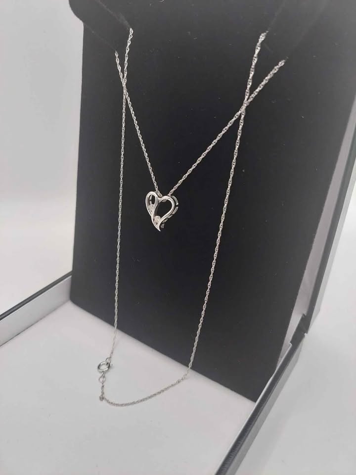 (10K Hallmarked&Tested) White Gold Necklace With Heart Pendant, Weight: 2.1G, 18" In Length In Great Condition- Looked After Well