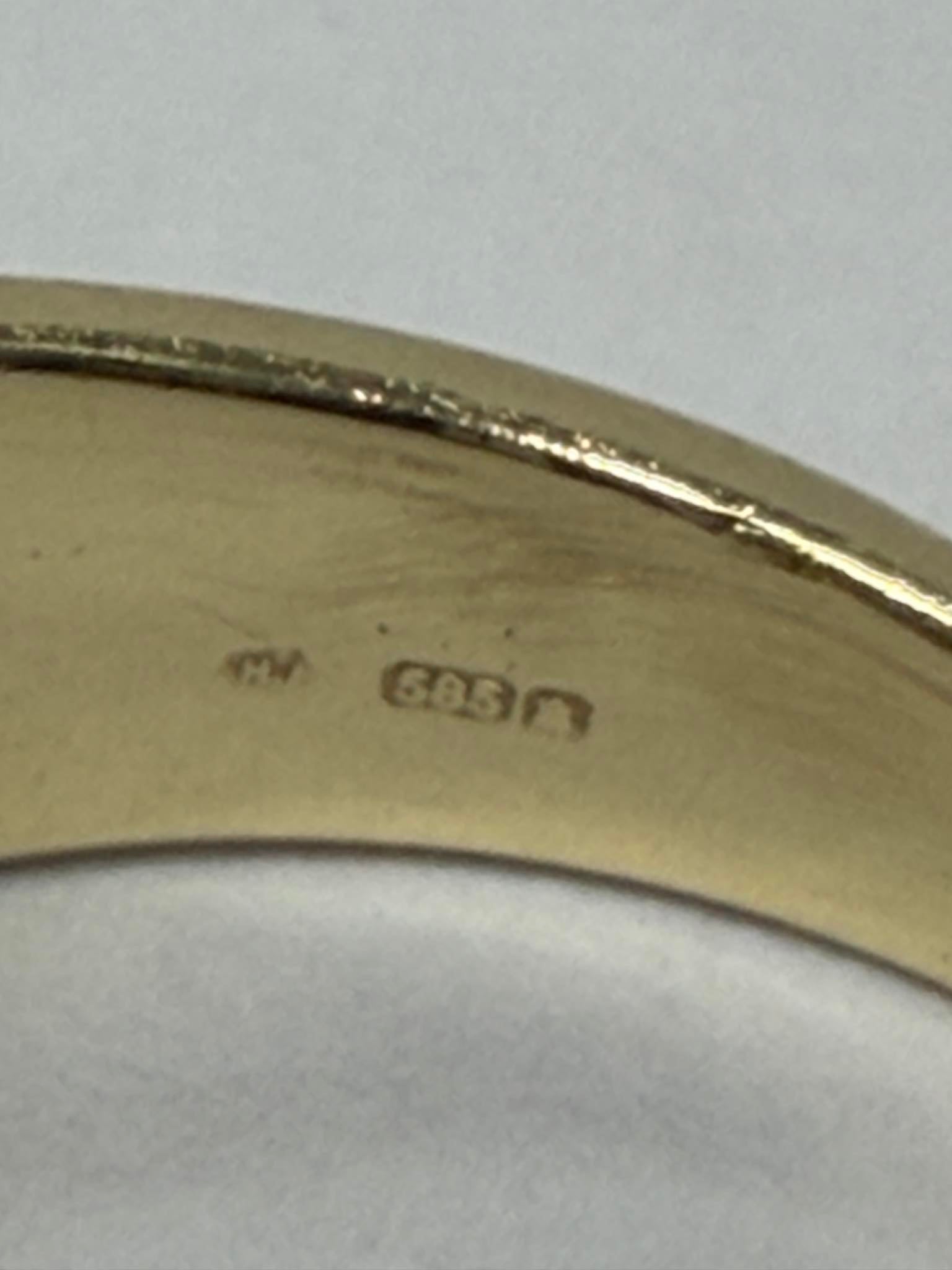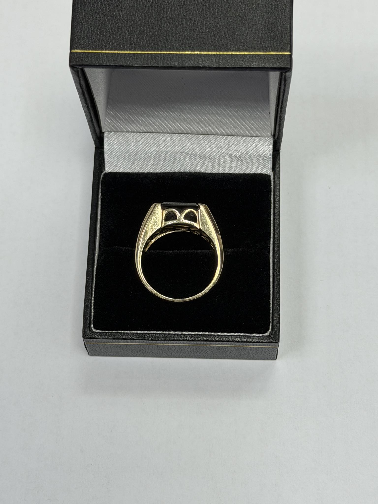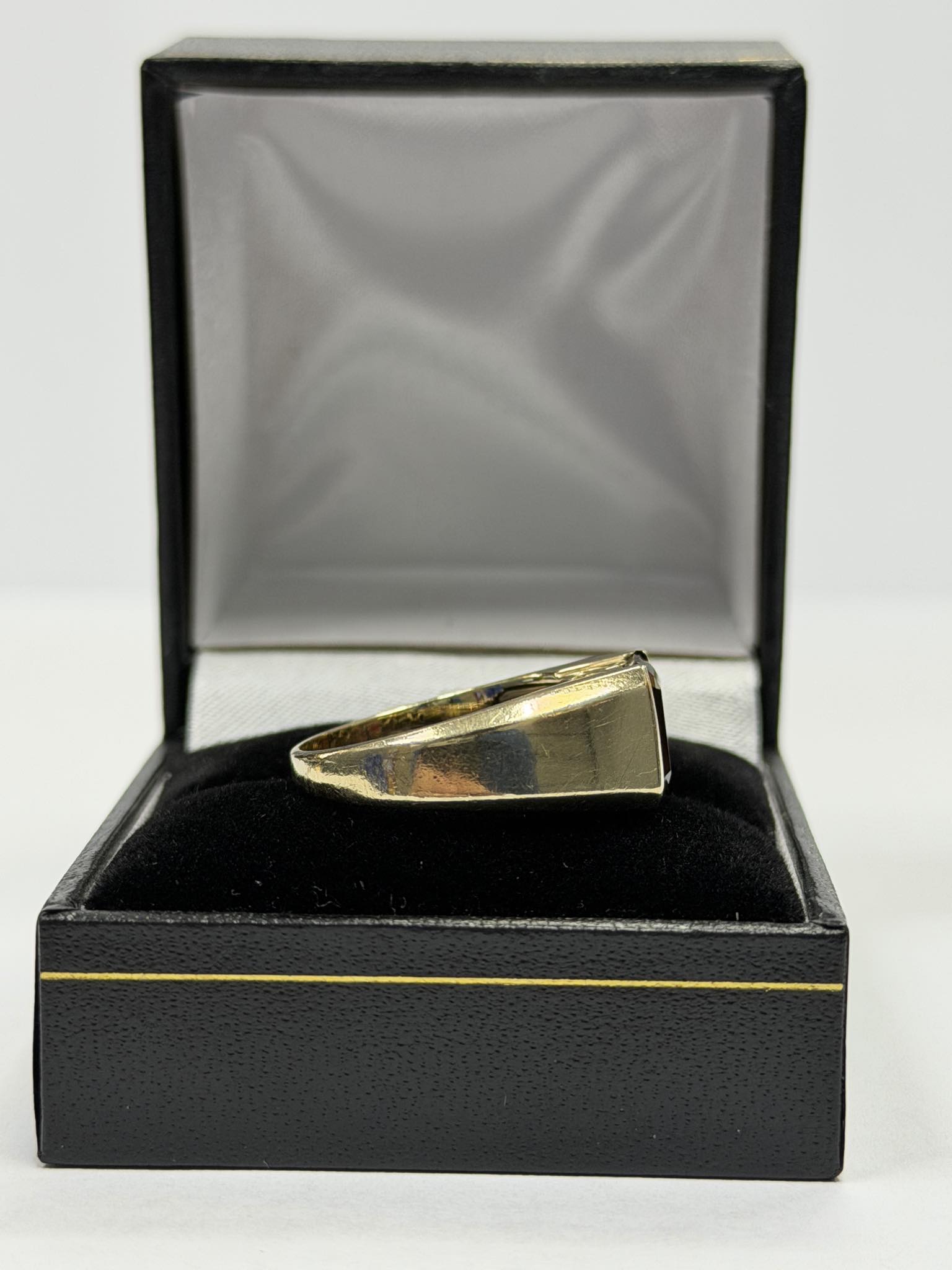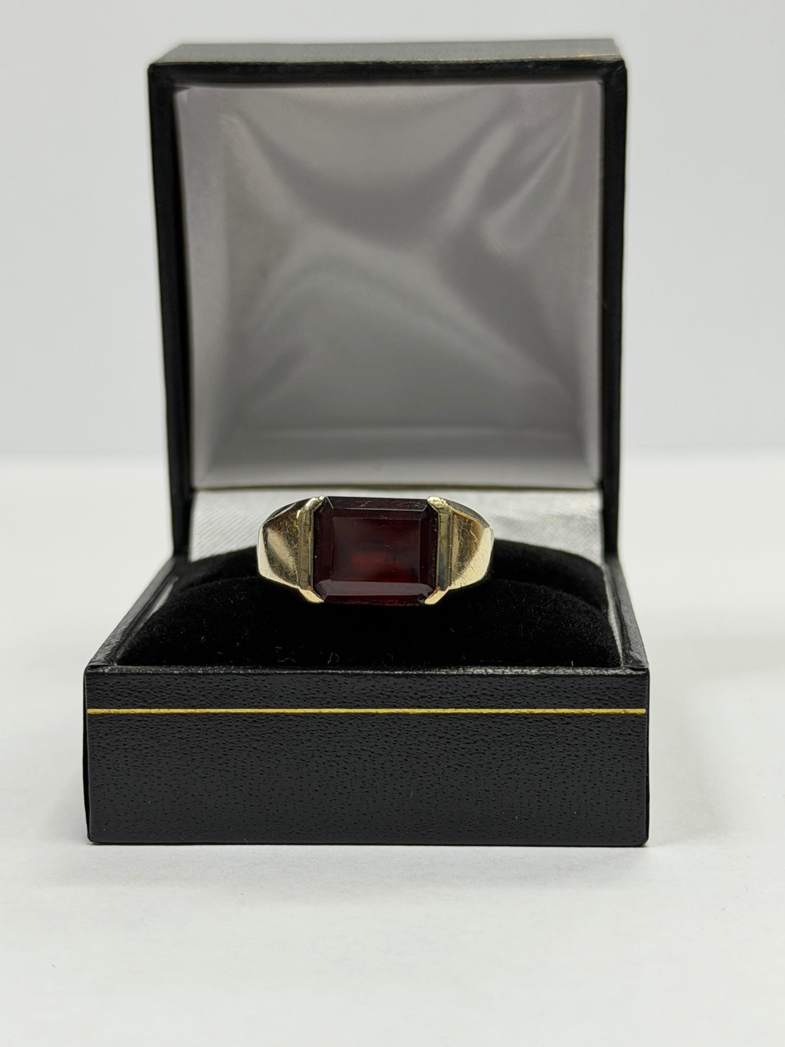 A 14ct gents gold garnet ring with a red coloured stone in the centre that weighs 6.59 grams in a size O . The ring is in great condition with minor signs of wear. The ring has been professionally cleaned and polished. The ring is hallmarked and tested. Boxed - Delivery or Collection **Click and Collect from the Handsworth Branch**