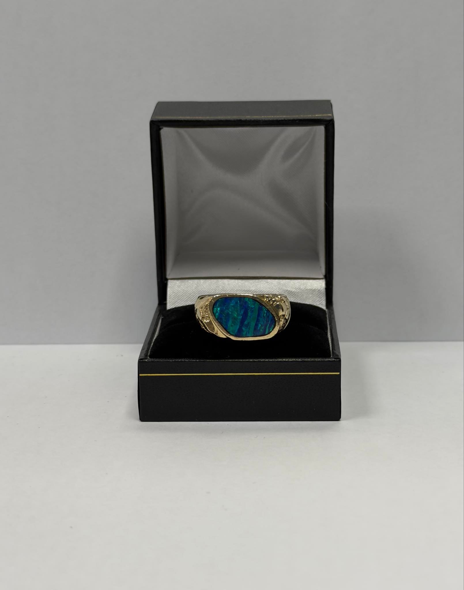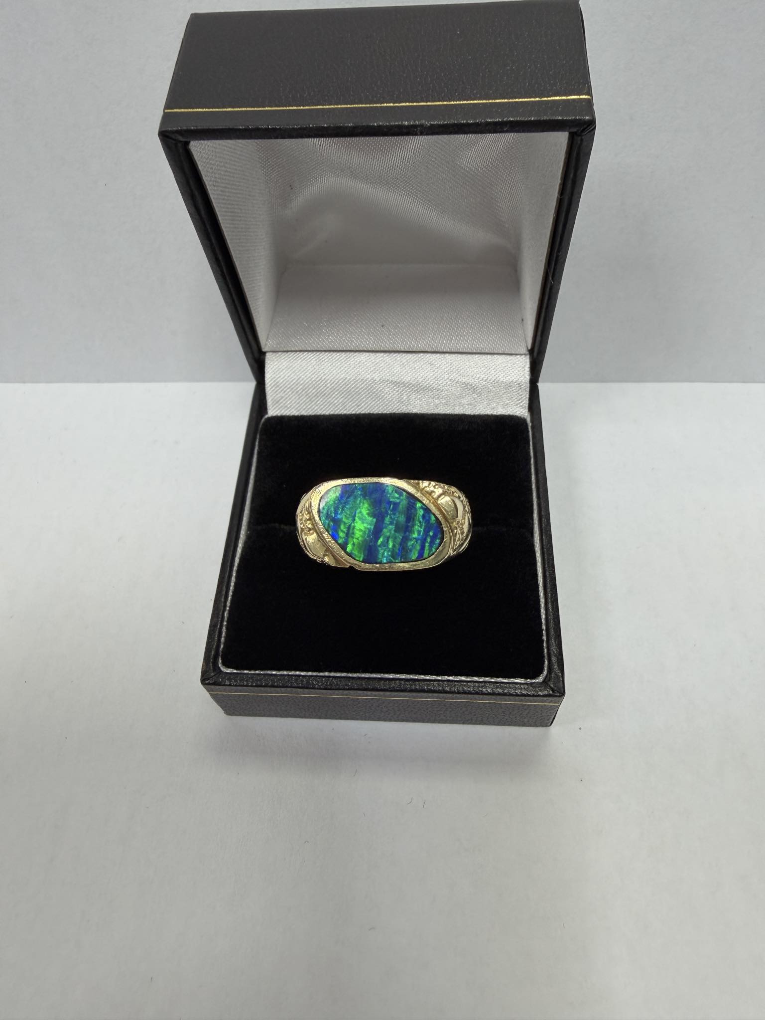 This 14ct gold gents ring is in fabulous condition with minor signs of wear. The stone of the ring is in pristine condition. The stone on this ring reflects different colours depending on the angle of which you look at the stone. Such as different shades of blues and greens.