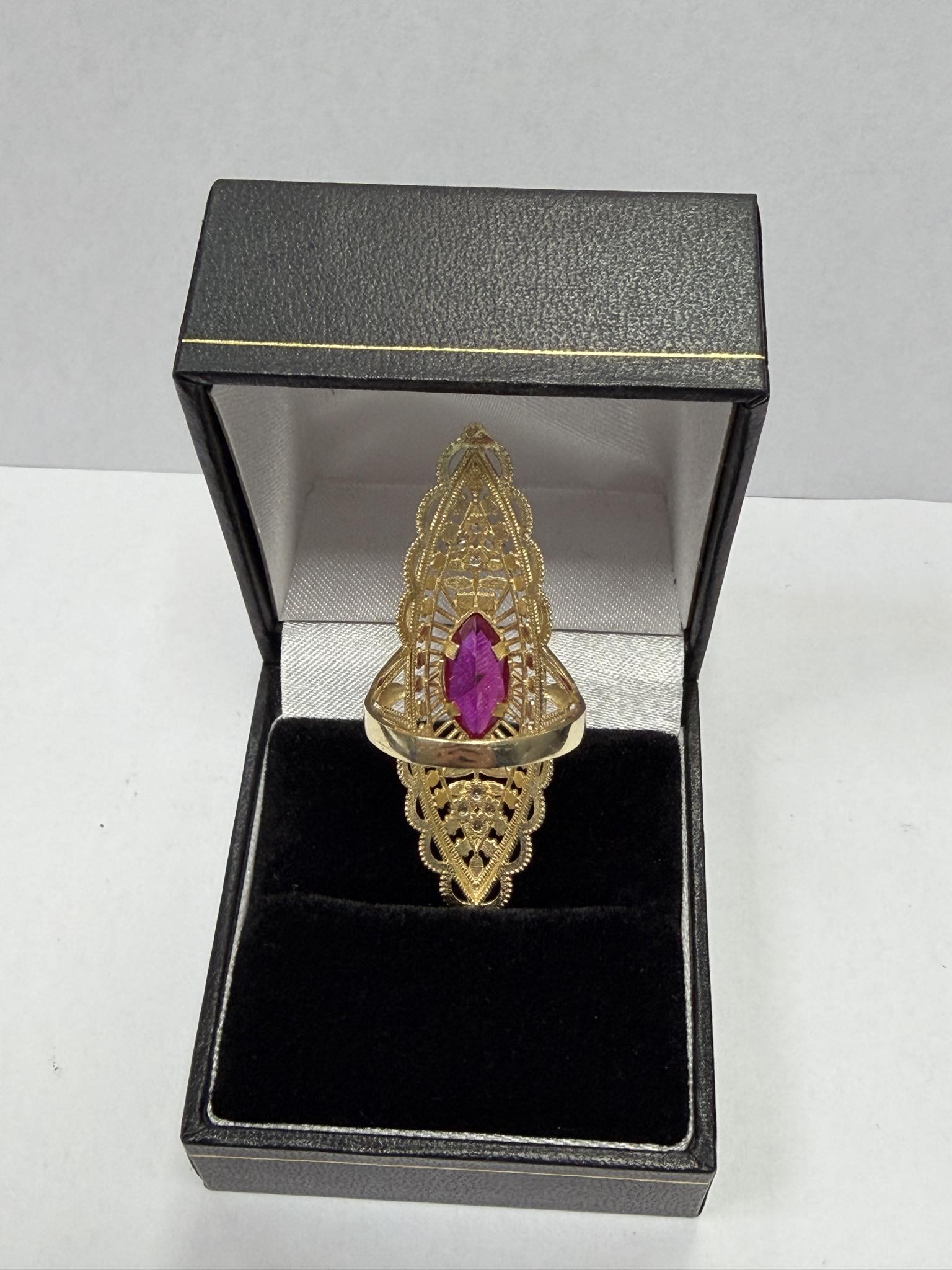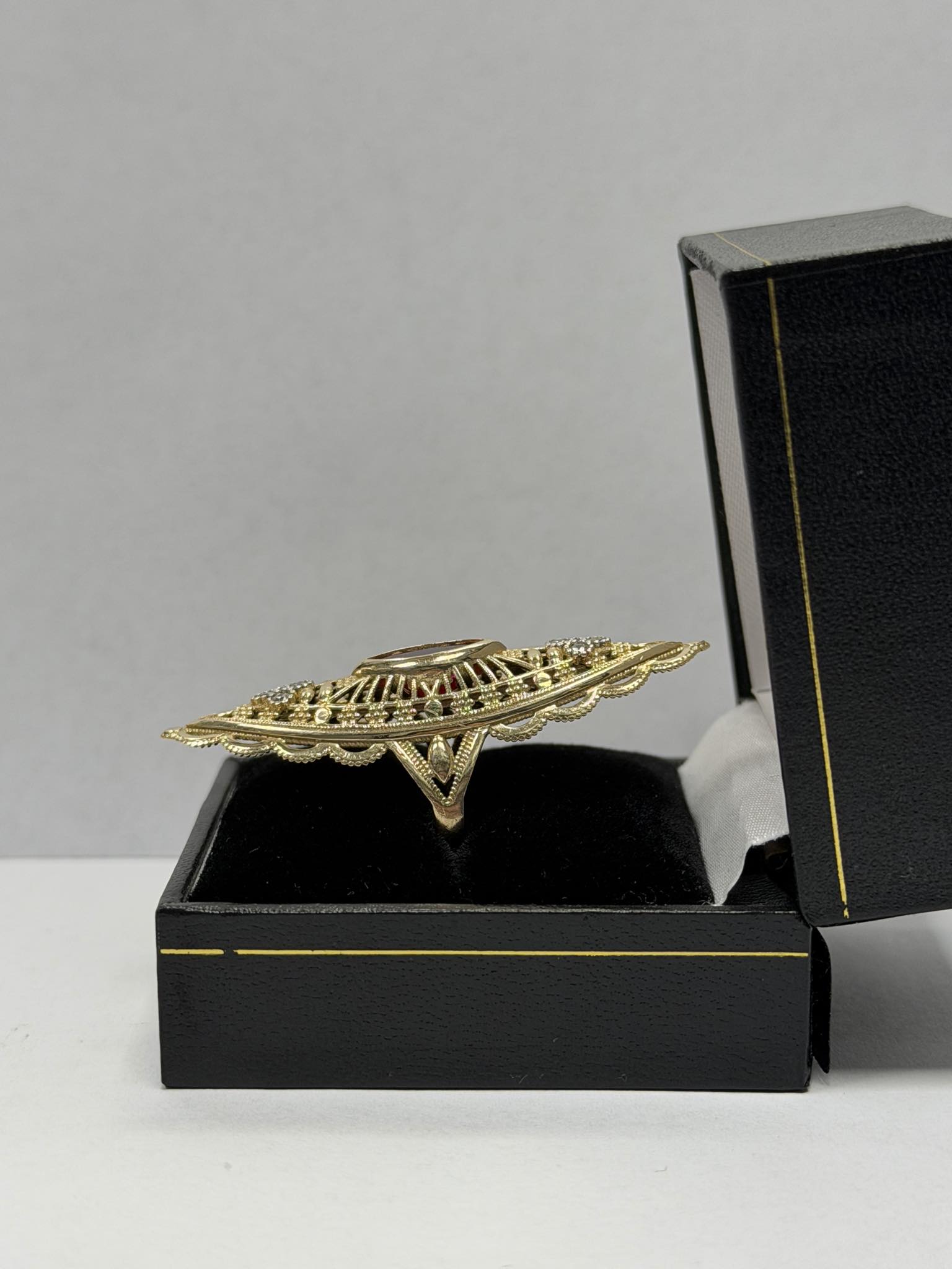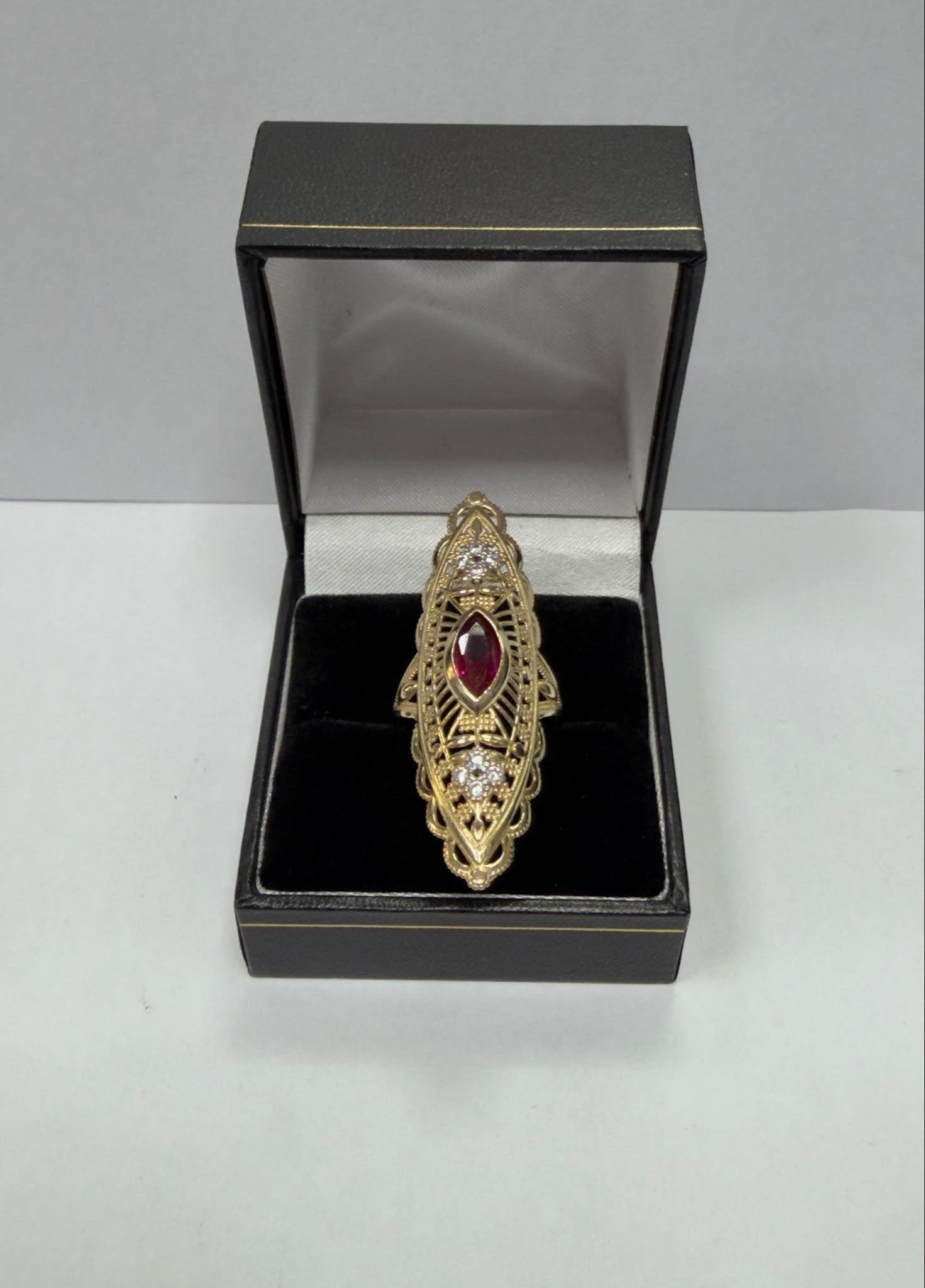 Elegant and eye-catching, this beautiful ladies’ ring is crafted in solid 14ct gold and fully hallmarked for authenticity. At the centre sits a striking marquise-cut red stone, rich in colour and beautifully framed by intricate gold detailing. The elongated design is enhanced with delicate openwork and sparkling accent stones, creating a timeless vintage-inspired look. Weighing 5.26 grams, this ring has a substantial yet comfortable feel, making it perfect for both special occasions and everyday elegance. Details: -Metal: 14ct Gold (Hallmarked) -Ring Size: P -Weight: 5.26 grams -Centre Stone: Marquise-cut red stone -Decorative accent stones -Ornate, detailed setting A stunning statement piece that would make a wonderful gift or a luxurious addition to any jewellery collection. Boxed - Delivery or Collection **Click and Collect from the Handsworth Branch**