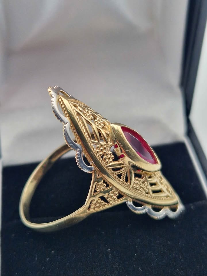 14ct Yellow And White Gold Marquise Red Gemstone Patterned Fancy Ring - Size R - 3.90 Grams