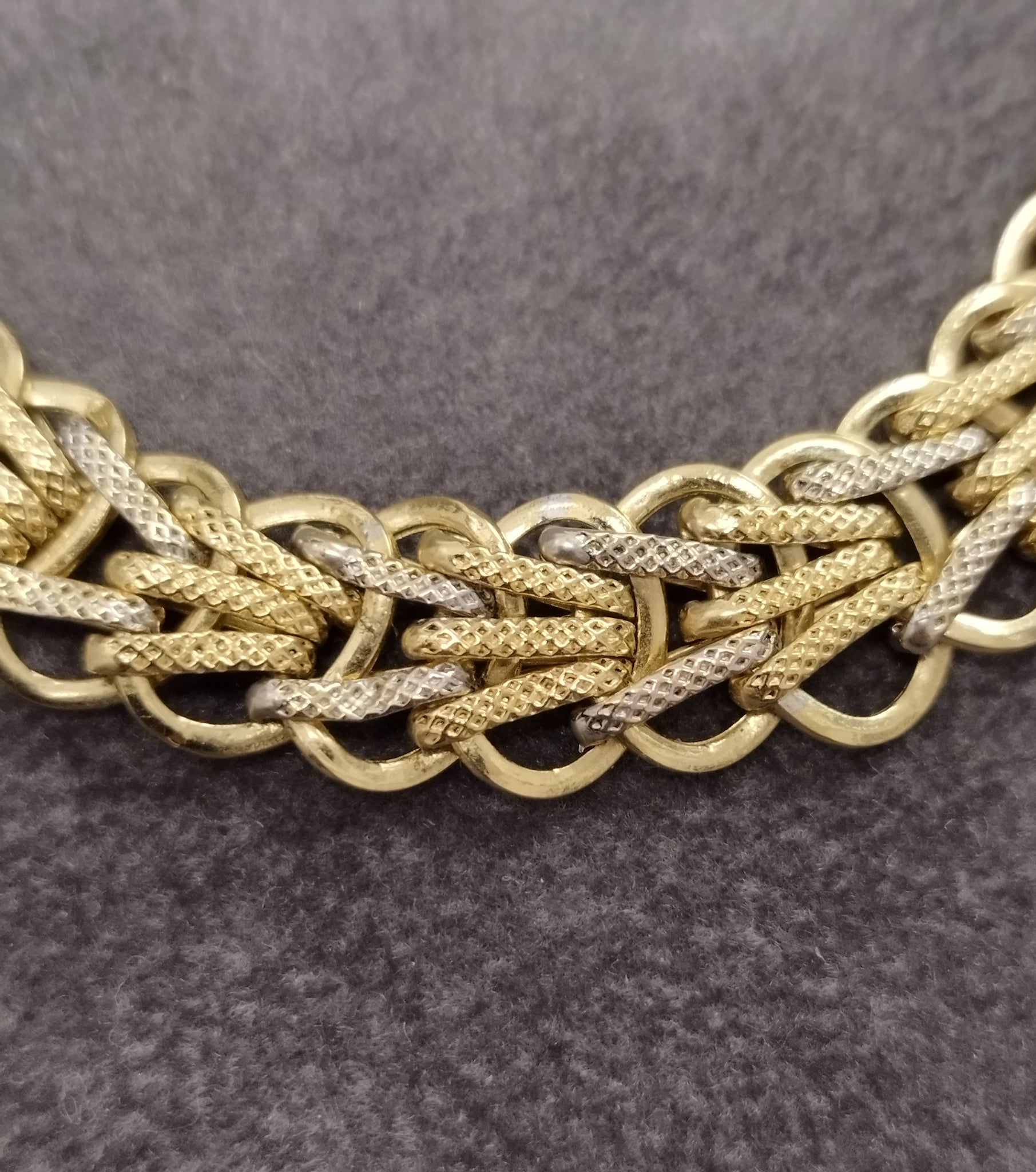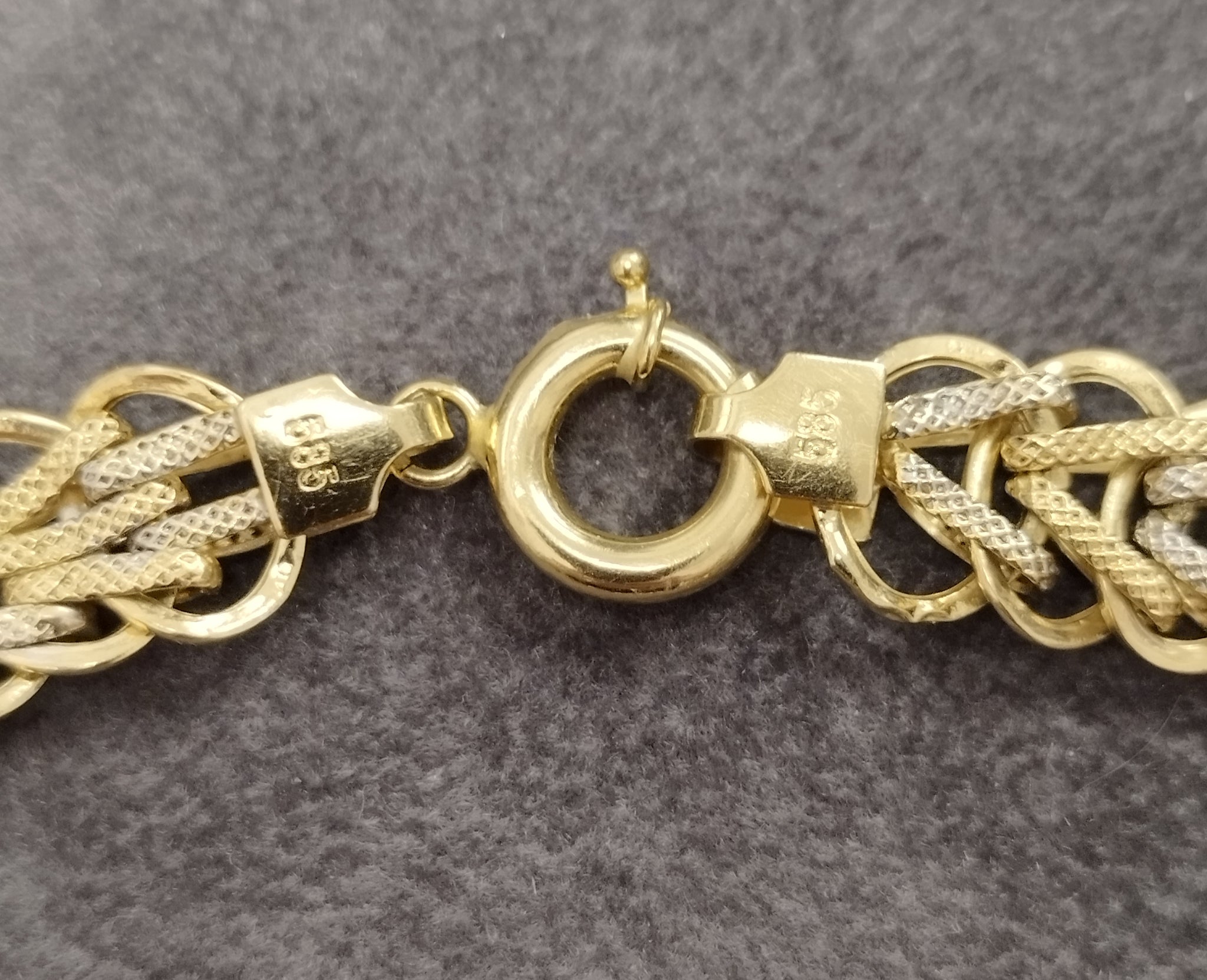 A lovely braided/woven link design bracelet crafted in 14ct yellow & white gold. Measuring 7.5 inches in length & 11mm width.. A stylish piece that is comfortable to wear and lays flat against the wrist. A perfect gift for any occasion.