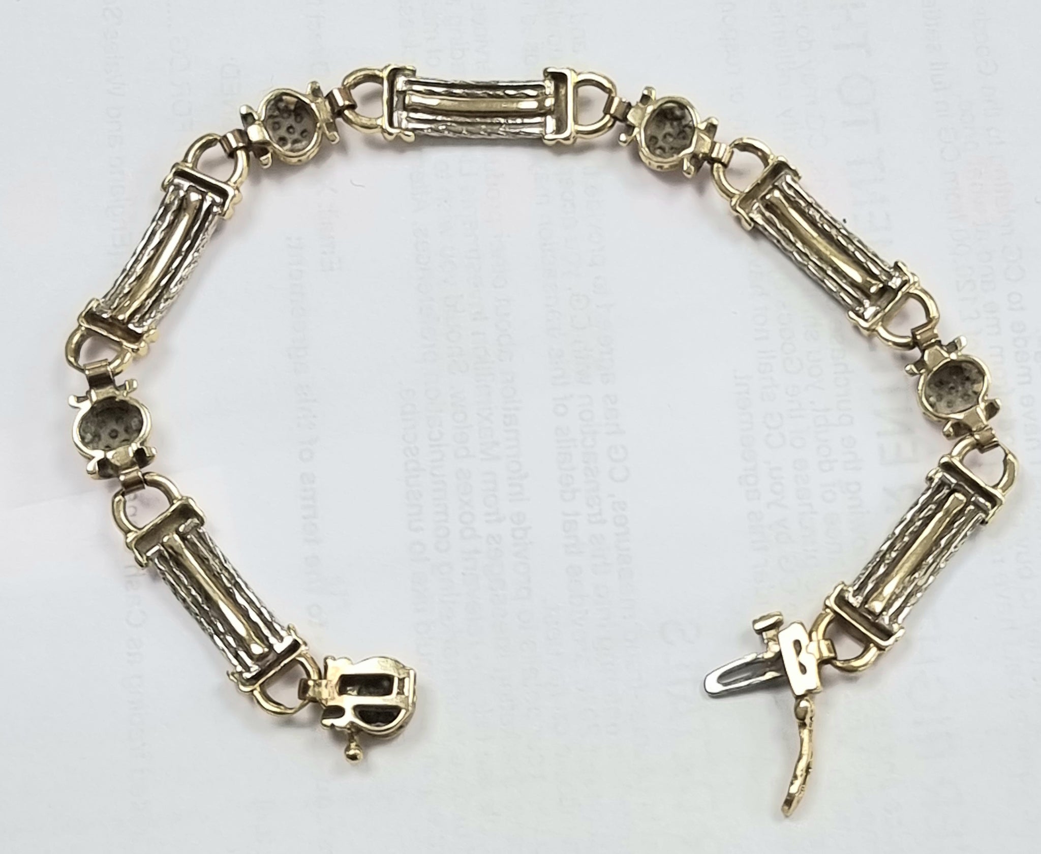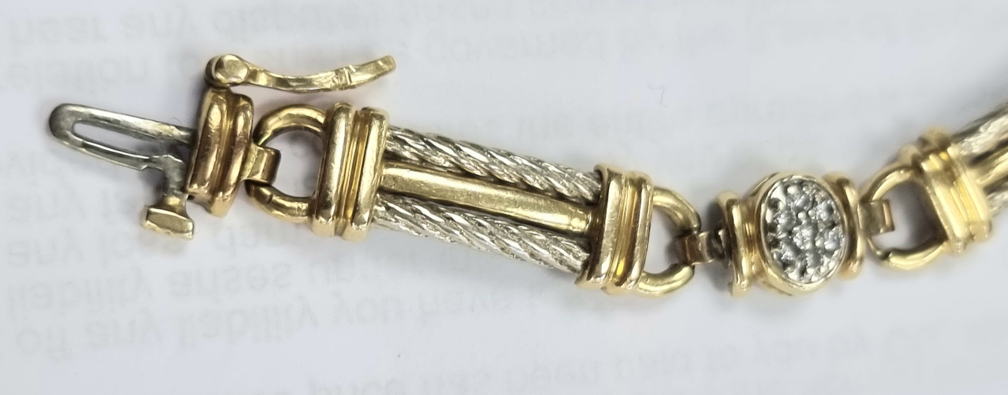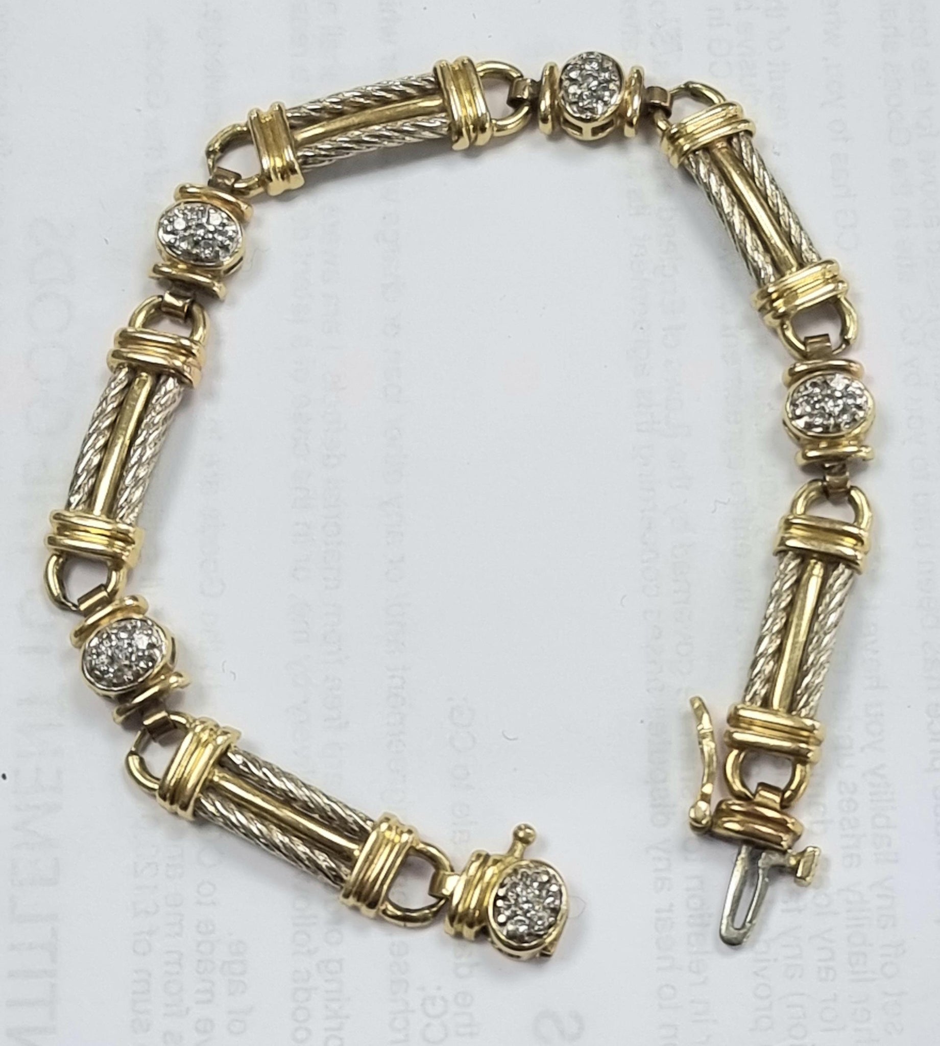 *I am selling this lovely 14k solid yellow/white gold diamond bracelet 7.5"** *This weighs 19.58 grams is 7.5 inches and 5mm wide** *Has a nice tight sturdy clasp ** *The bracelet is stamped 14ct but has also been tested** *The small diamonds have also been tested but pricing for gold only ** *Made up of 5 sections with white gold beads and 5 oval section set with small diamonds in each** I would say it is in nice condition and a lovely piece** any further information please call Dave on 1772 970007