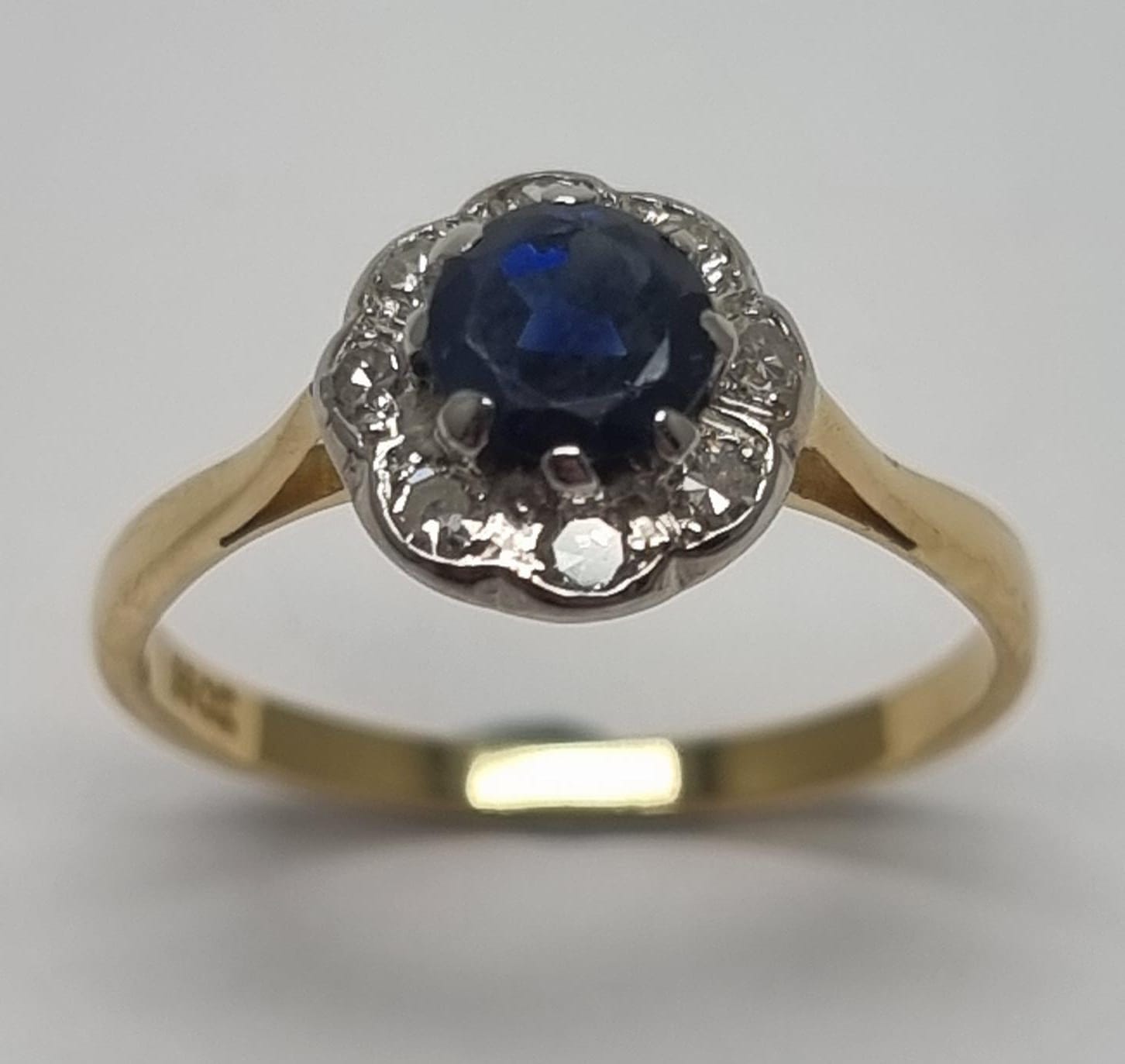 18ct Gold Sapphire & 0.22ct Diamond Cluster Head Ring - Size O (Valued at £1250)