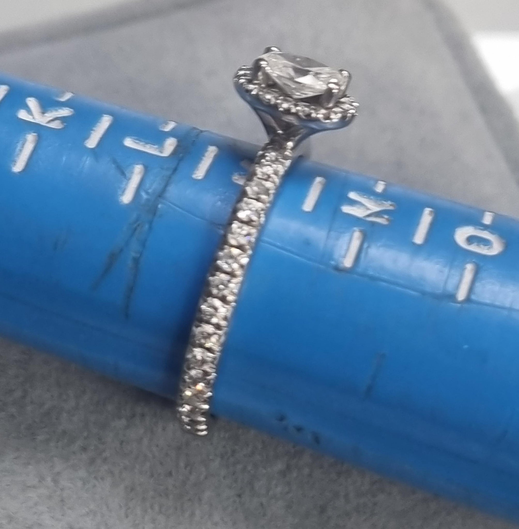 A stunning 18ct white gold ring with a lovely oval cut diamond with smaller chips down the side weighing 2.64 grams 0.65ct