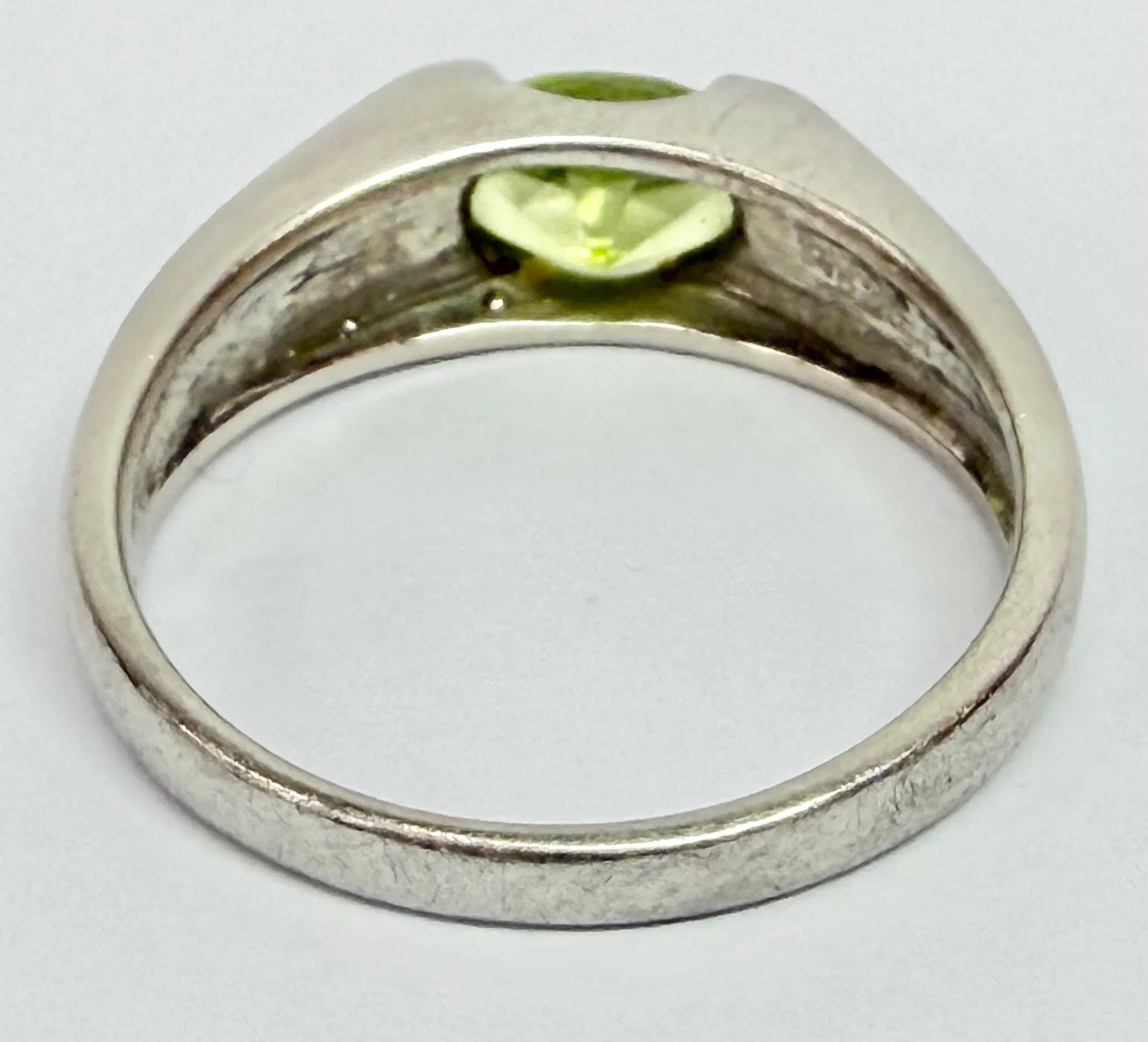 This beautiful 28ct white gold ring has a gorgeous lime green stone, weighs 4.8 grams and is a size L