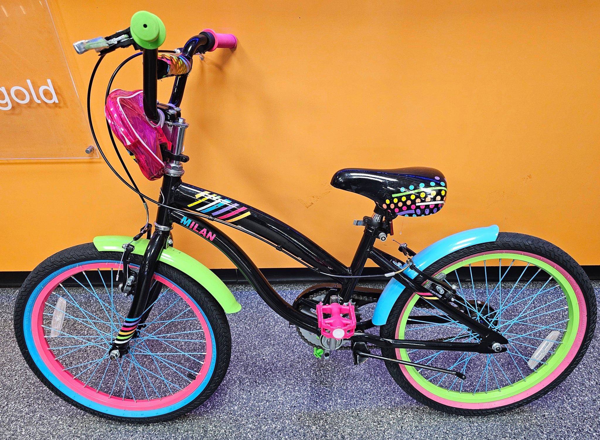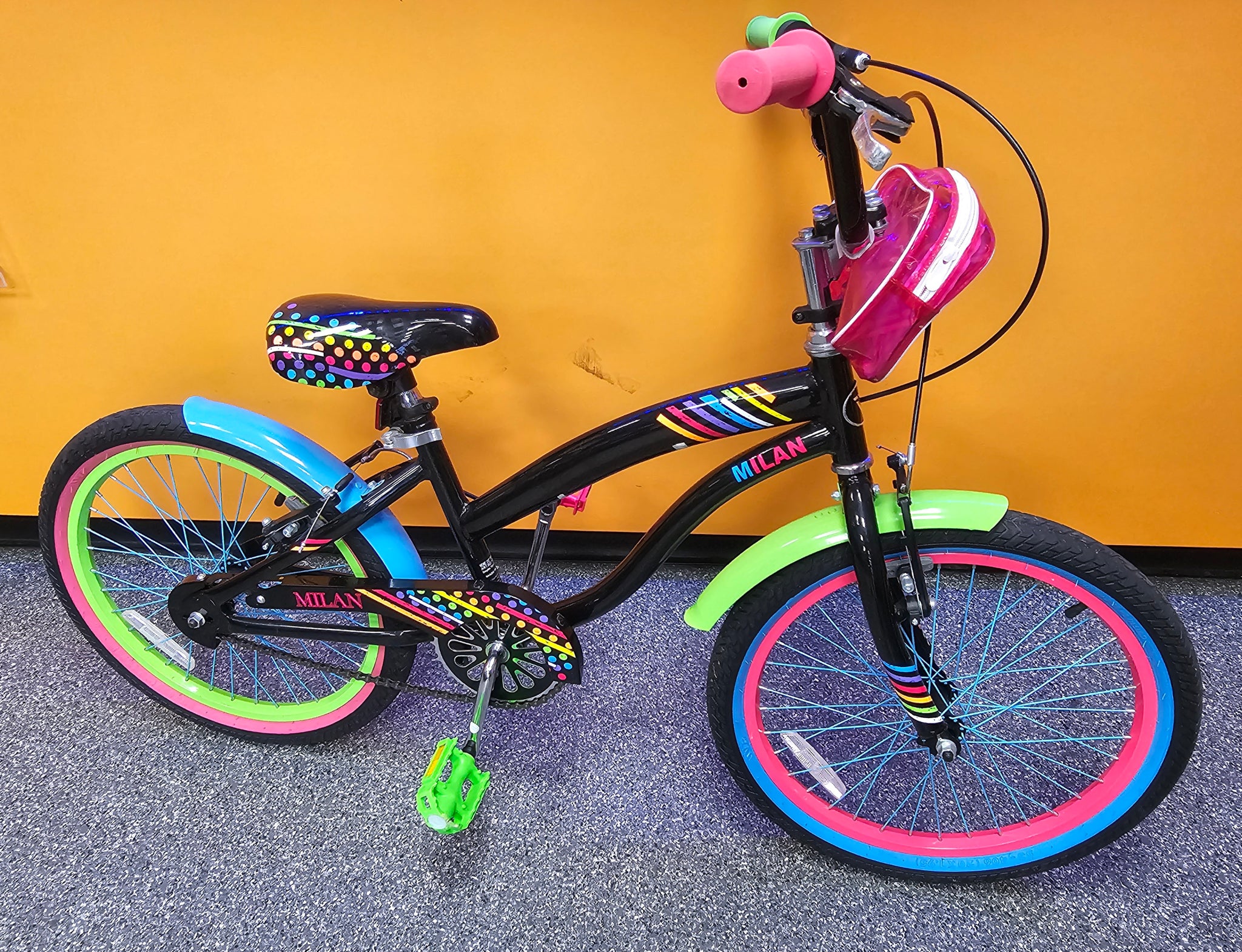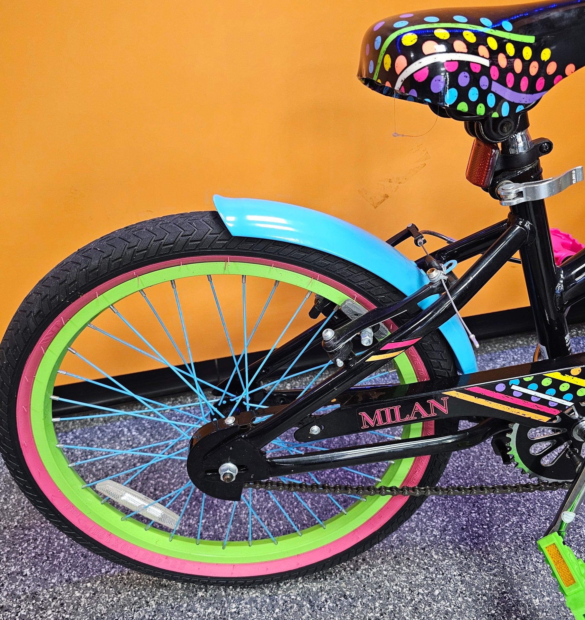 Key features Steel Bike Frame: enhanced durability, designed for a smooth and stable ride 20 Inch Wheels: with allow wheel rims and pneumatic air-filled tyres Fixed Gear Bike: lets children focus on pedalling, steering and braking Half-Closed Chain Guard: protects against dirt and moving parts for secure cycling Front and Rear Alloy V-brakes: strong, reliable stopping power with enhanced control Front and rear reflectors, front and rear mudguards, and kickstand Black finish, rainbow neon details and matching handlebar bag Contents: 1x Milan Bike with 20 Inch Wheels To fit inside leg measurement 50cm - 72cm