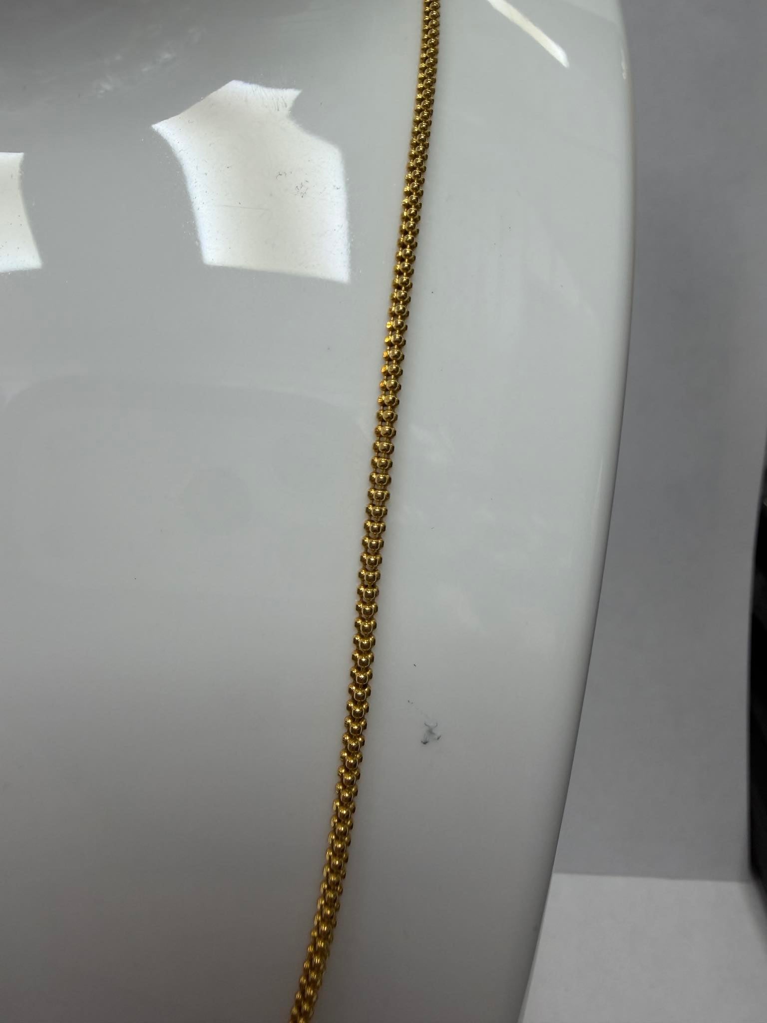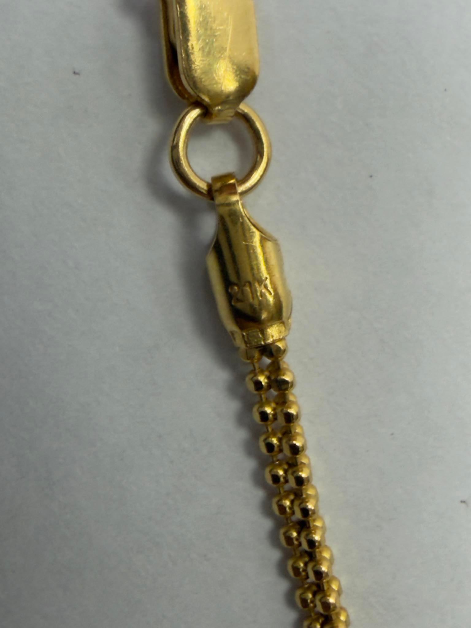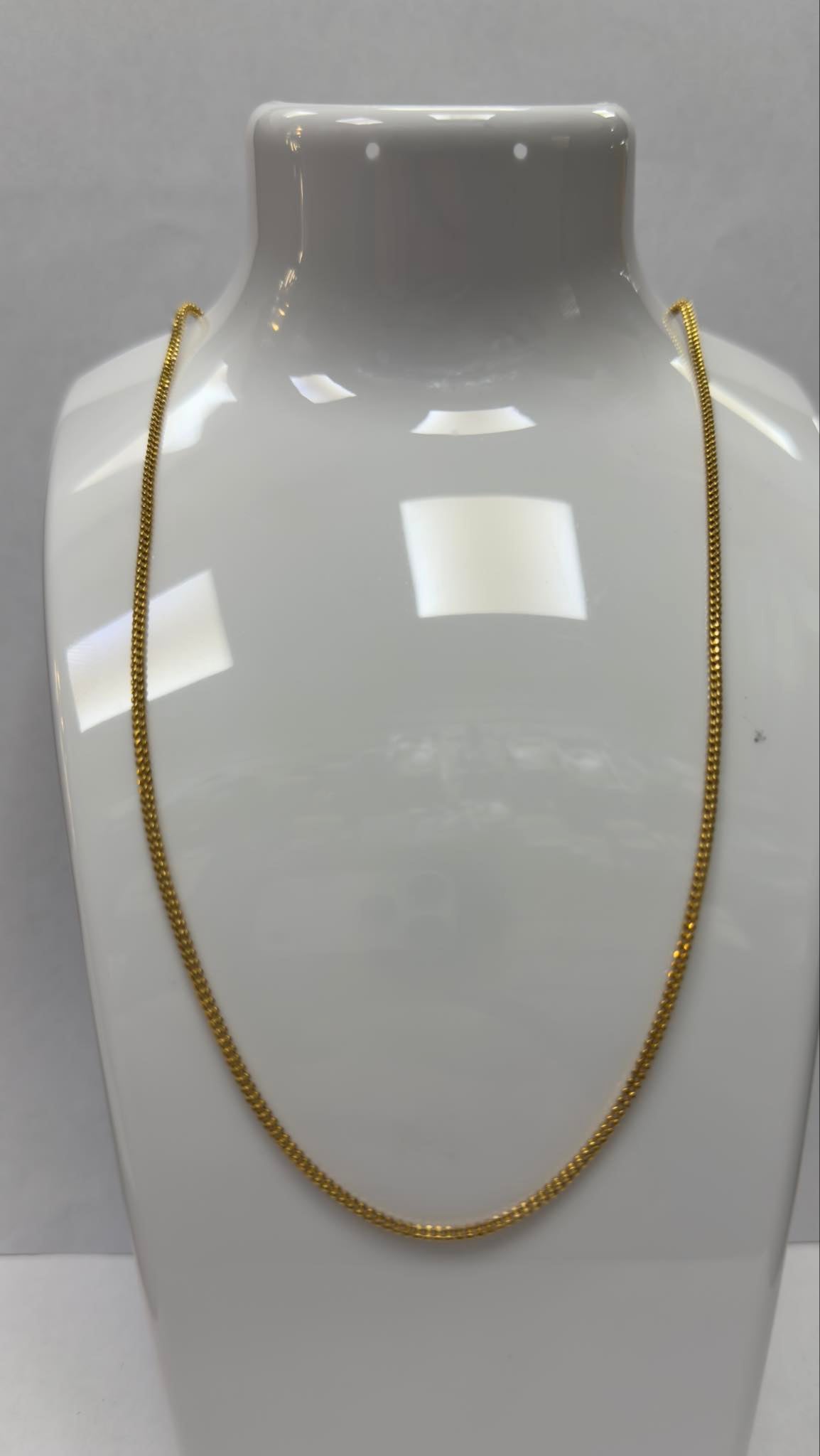 grade a description This 21ct fancy gold chain is in very good condition overall. The gold displays a rich, consistent colour typical of high-purity 21ct gold, with light surface wear visible under close inspection, consistent with careful previous use. There are no apparent dents, kinks, or structural damage, and the links remain well-shaped and evenly aligned throughout the 24-inch length. The 2mm width maintains a delicate yet defined appearance, and the chain has a comfortable weight of 8.7