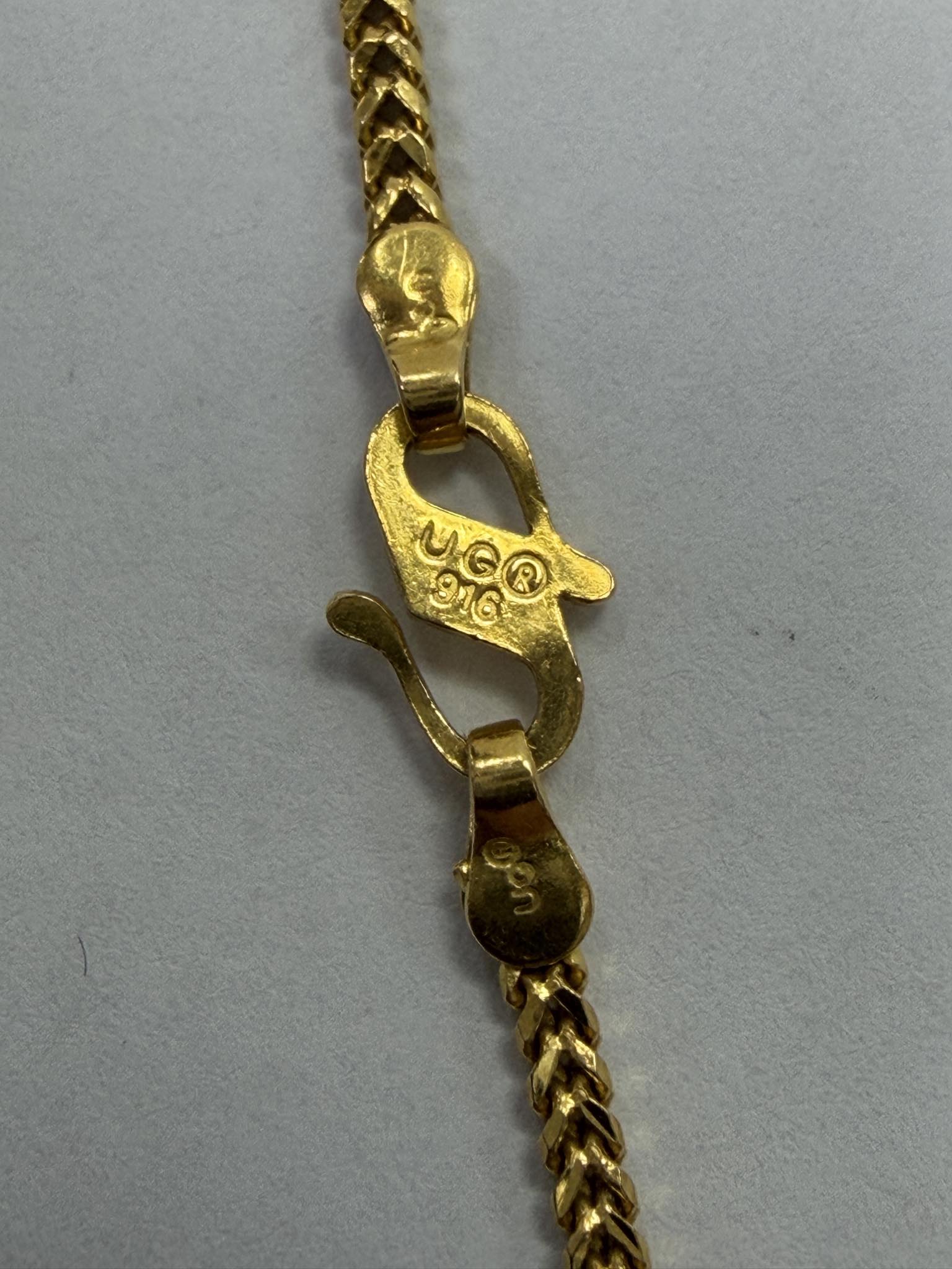 This pendant and chain set is in Grade A condition, showing only very minimal signs of light wear consistent with careful use. The gold maintains a bright, rich finish, with no visible damage to the Khanda pendant or chain links. The clasp operates securely, and the hallmarks are clear and fully legible. Overall, a beautifully maintained piece in excellent wearable condition.