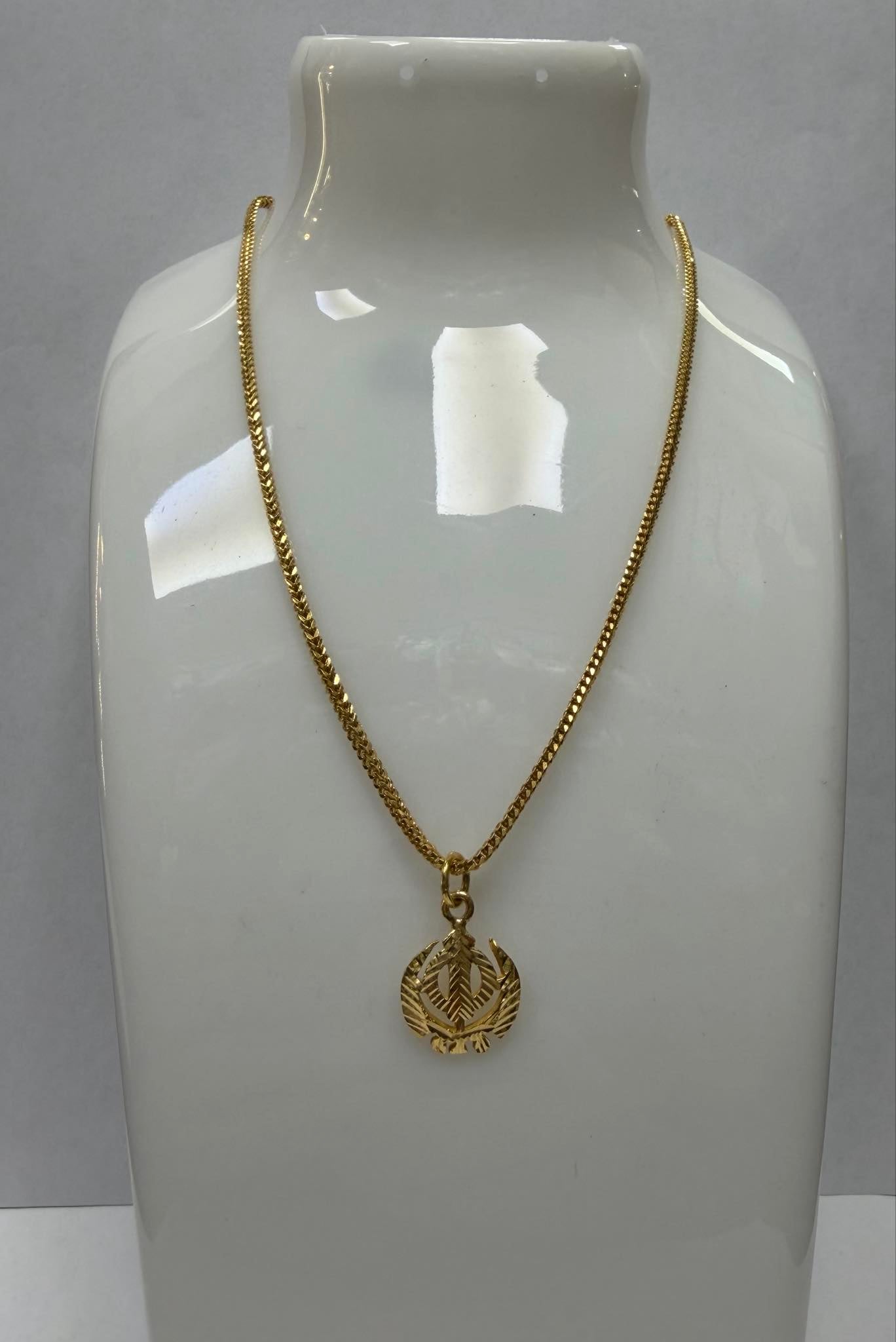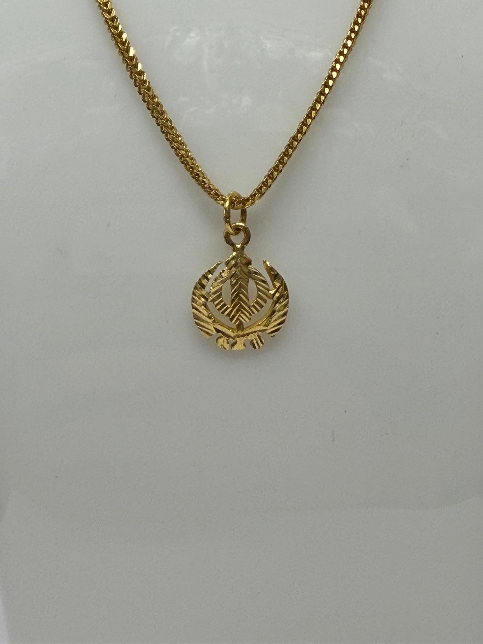 A beautifully crafted 22ct yellow gold Khanda pendant and chain set, fully hallmarked for authenticity. The striking centrepiece features the iconic Khanda symbol, representing faith and strength, intricately detailed with a polished finish that enhances the rich, warm tone of 22ct gold. The pendant is perfectly paired with a matching gold chain, creating a balanced and elegant look suitable for both daily wear and special occasions. Measuring approximately 15.6 inches in length, the chain sits comfortably along the neckline. With a combined weight of 12.44 grams, this set offers a substantial yet wearable feel, reflecting both quality craftsmanship and timeless design. Details: -Metal: 22ct Yellow Gold (Hallmarked) -Length: 15.6 inches -Total Weight: 12.44 grams _Design: Khanda symbol pendant Matching gold chain included A meaningful and eye-catching piece, ideal as a thoughtful gift or a treasured addition to any jewellery collection. Boxed - Collection Only **Click and Collect from the Handsworth Branch**