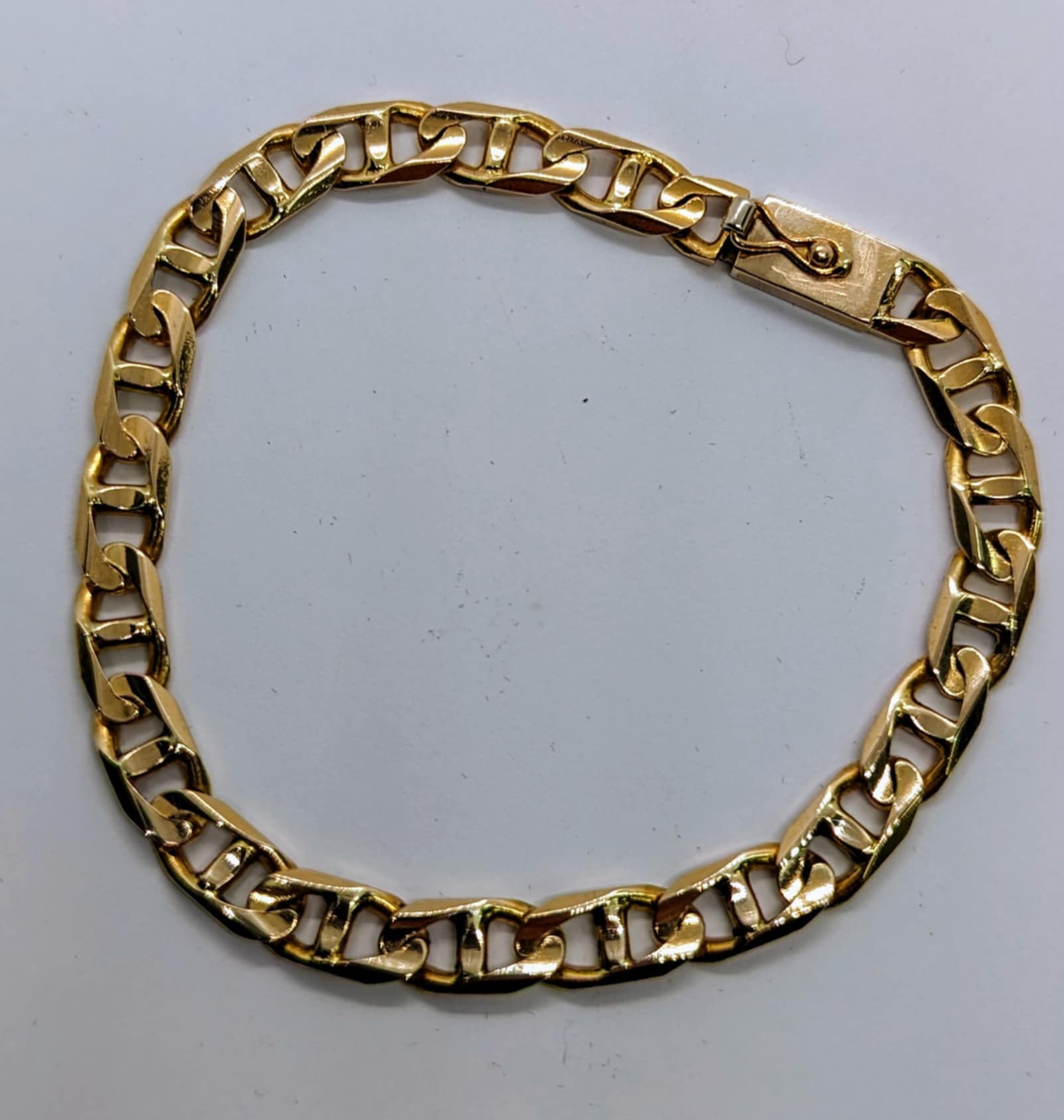 585 14CT, YELLOW GOLD, MARIAN STYLE Bracelets, 9", 16.75G, BOXED ITEM IS IN WEARABLE CONDTION AND IS FREE OF ANY WARPING EFFECTING THE ITEMS SHAPE, HOWEVER, AS IT IS A PRE OWNED ITEM, SOME SIGNS OF USE MAY BE VISABLE, PLEASE SEE PHOTOS Harpurhey Store