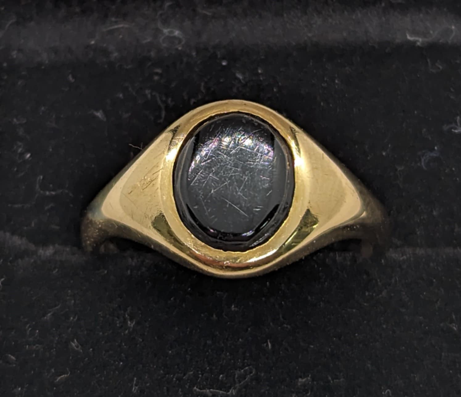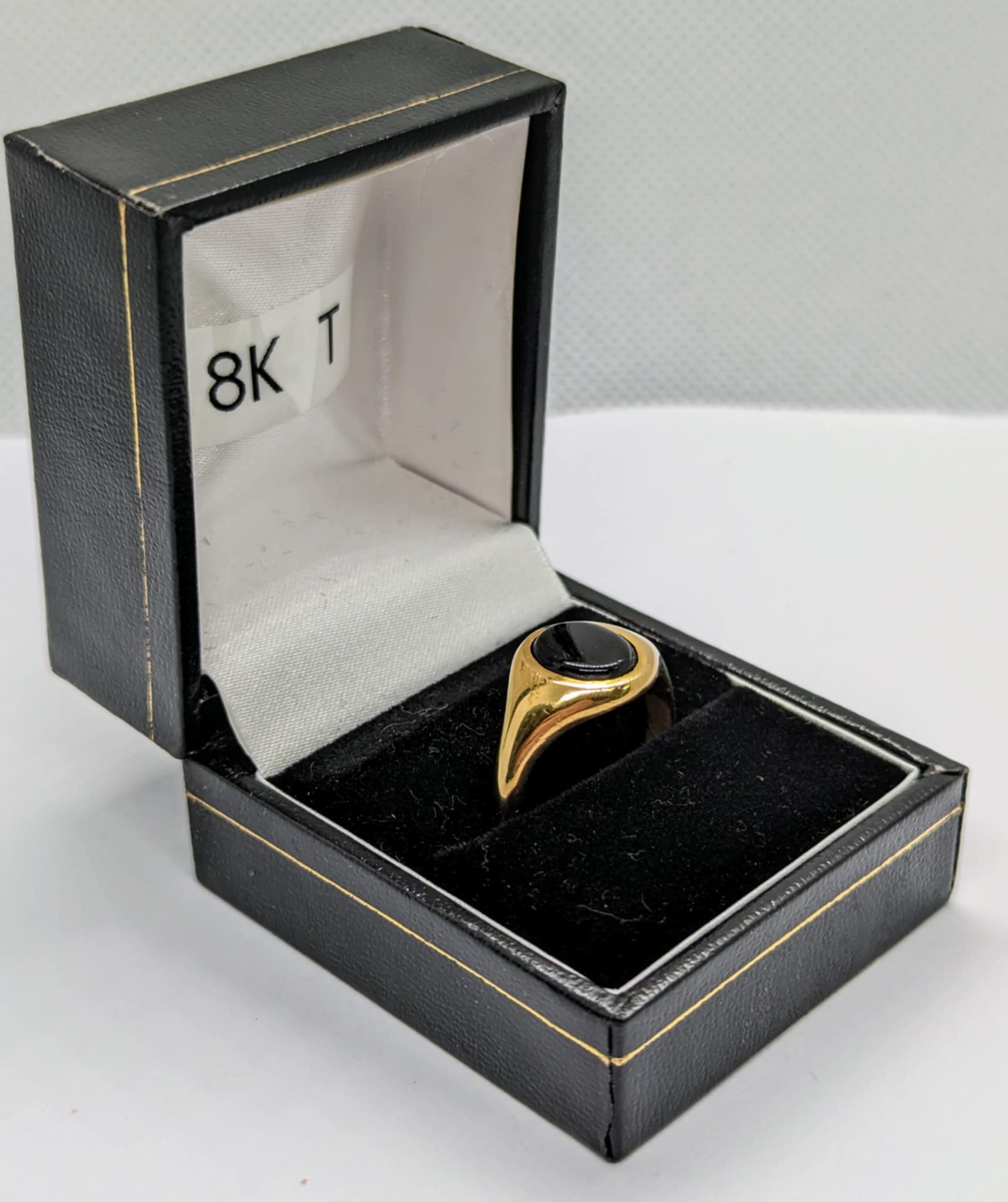 750 HALLMARKED 18CT, YELLOW GOLD, RING WITH BLACK STONE, SIZE: T/9.5. 6.7G, BOXED , However as it is a pre owned item some signs of use may be visible, such a light scratch's, please see photos HARPURHEY STORE