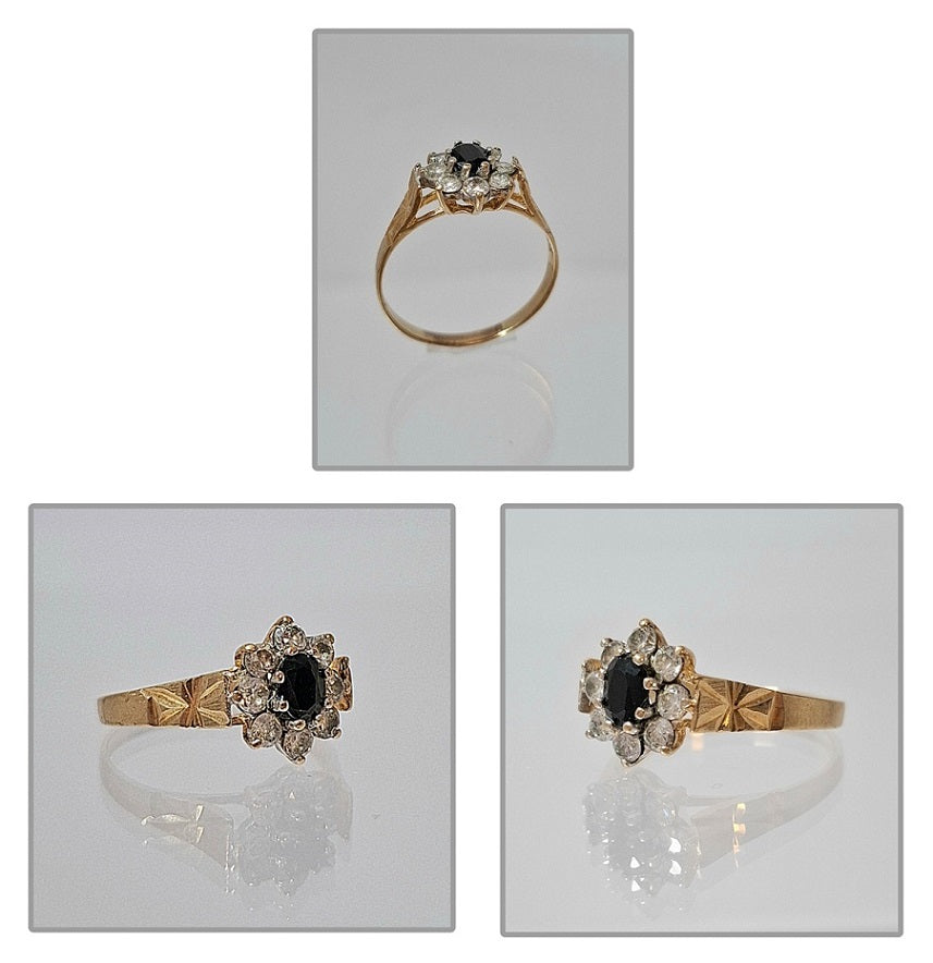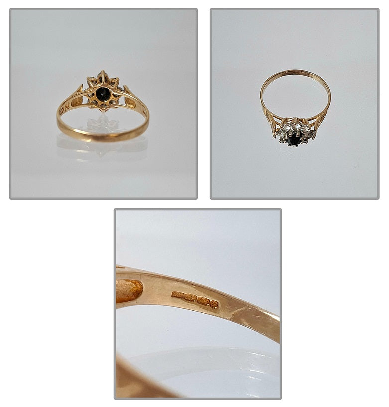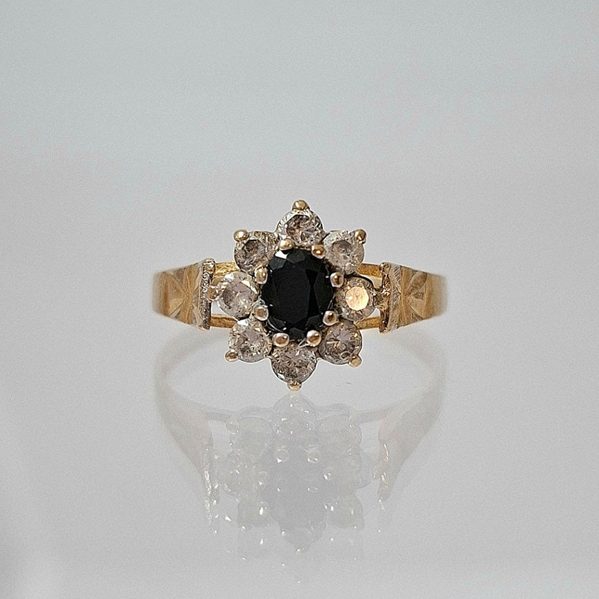 9 Carat Yellow Gold Ring - Size O - Beautifully decorated with clear stones surrounding one centre dark stone - Total weight including stones is 1.98 Grams - Full Hallmark