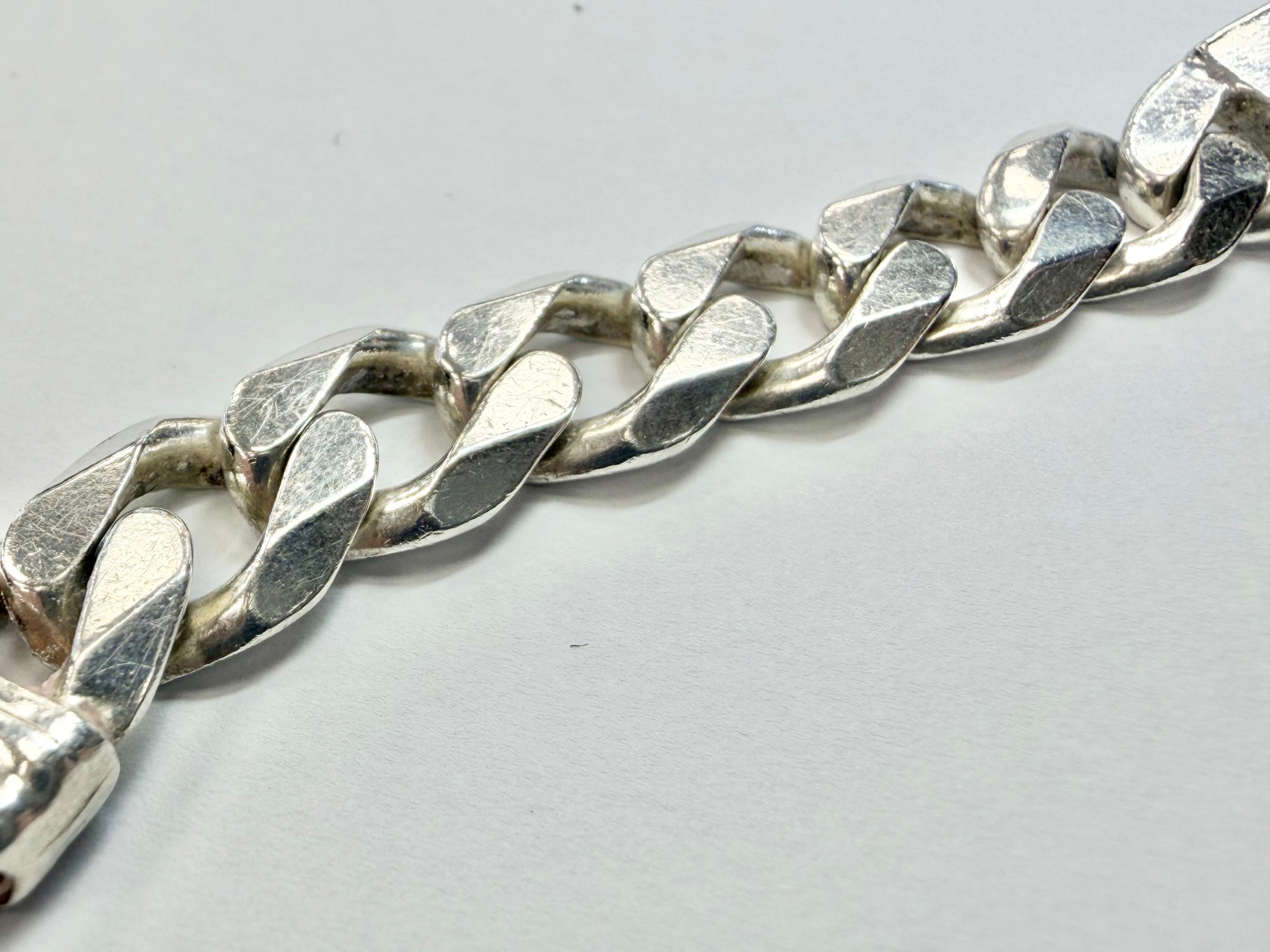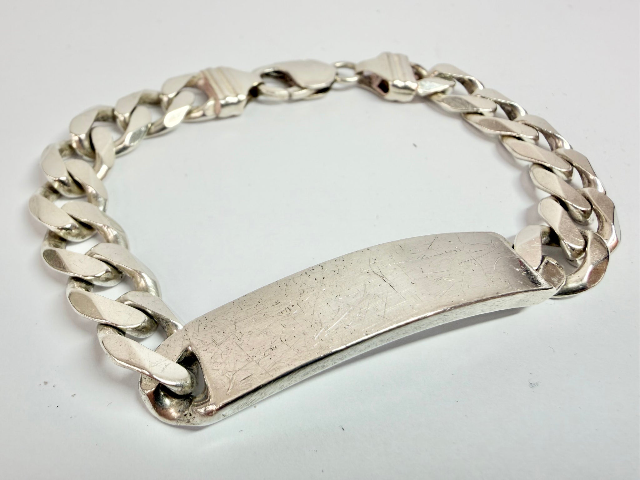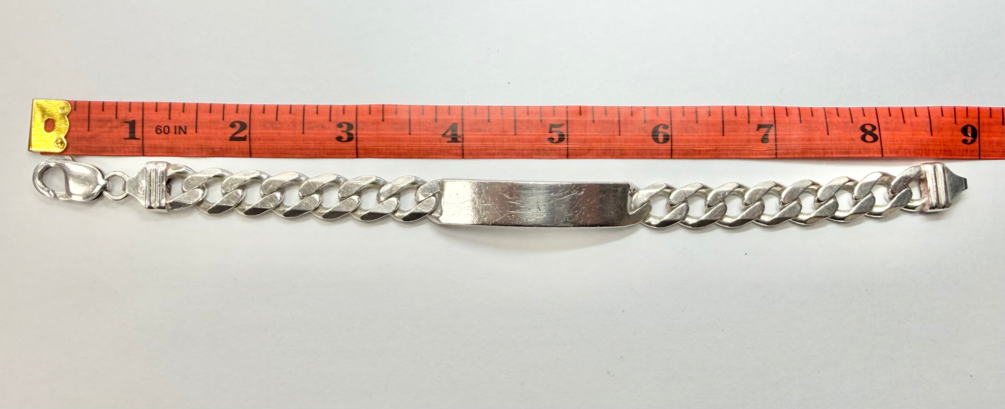 925 silver ID bracelet, weighs 46.7 grams and is 9” in length. Has signs of cosmetic wear but overall good condition