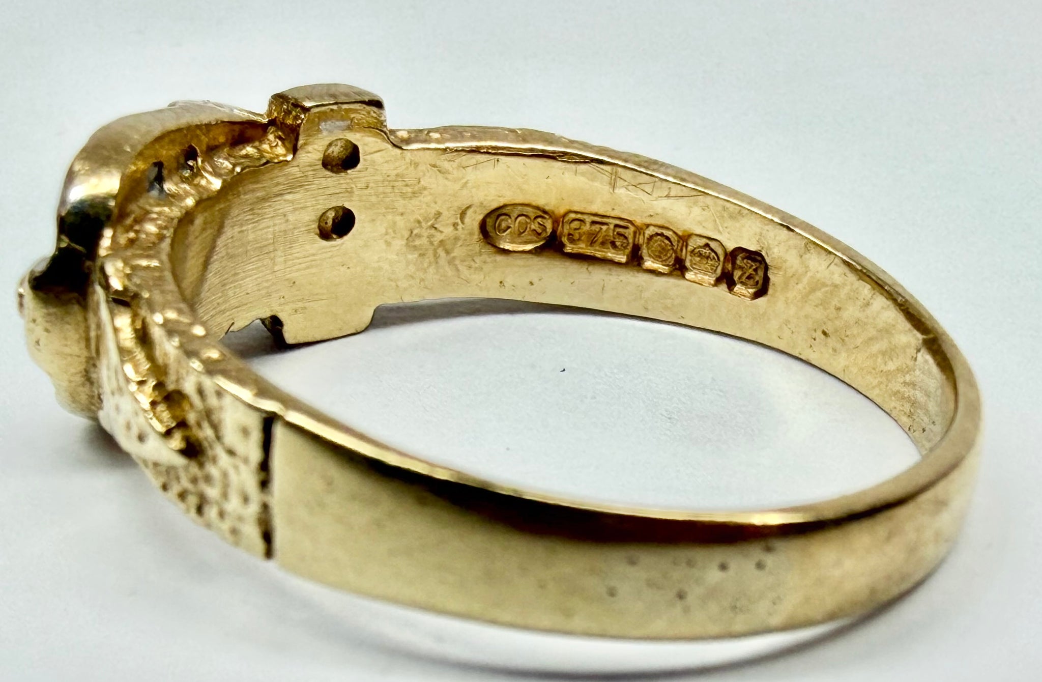 This gorgeous 9ct gold buckle ring has cz stones, weighs 3.8 grams and is a size O and is in good condition.