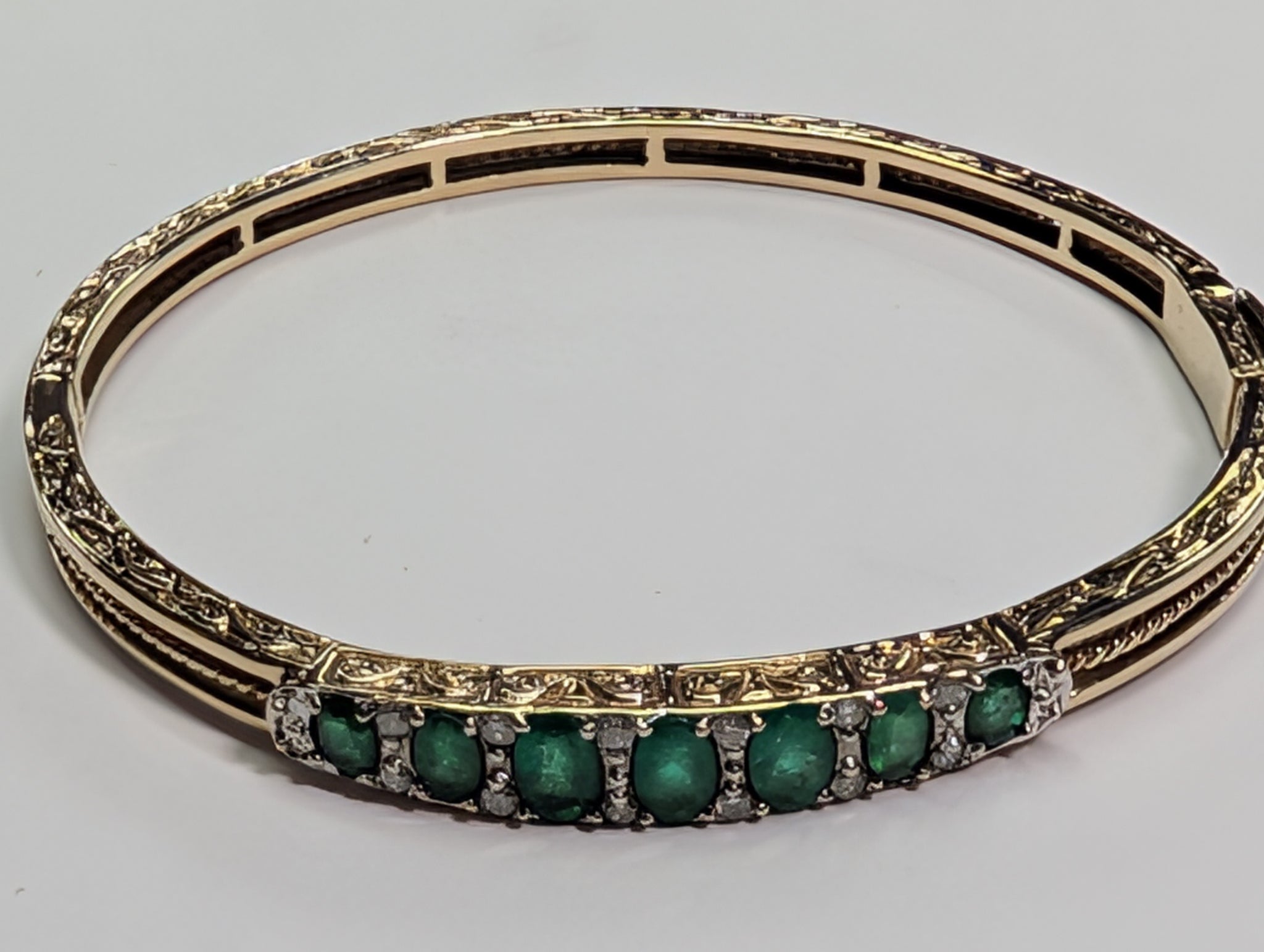 HERE WE HAVE A 9CT GOLD DIAMOND & EMERALD PATTERNED BANGLE. THIS WEIGHS 15.61G WITH WIDTH SIZE SHOWN. ** FOR ANY QUERIES PLEASE CALL OUR PRESTON STORE DIRECT MON-SAT 01772 204899