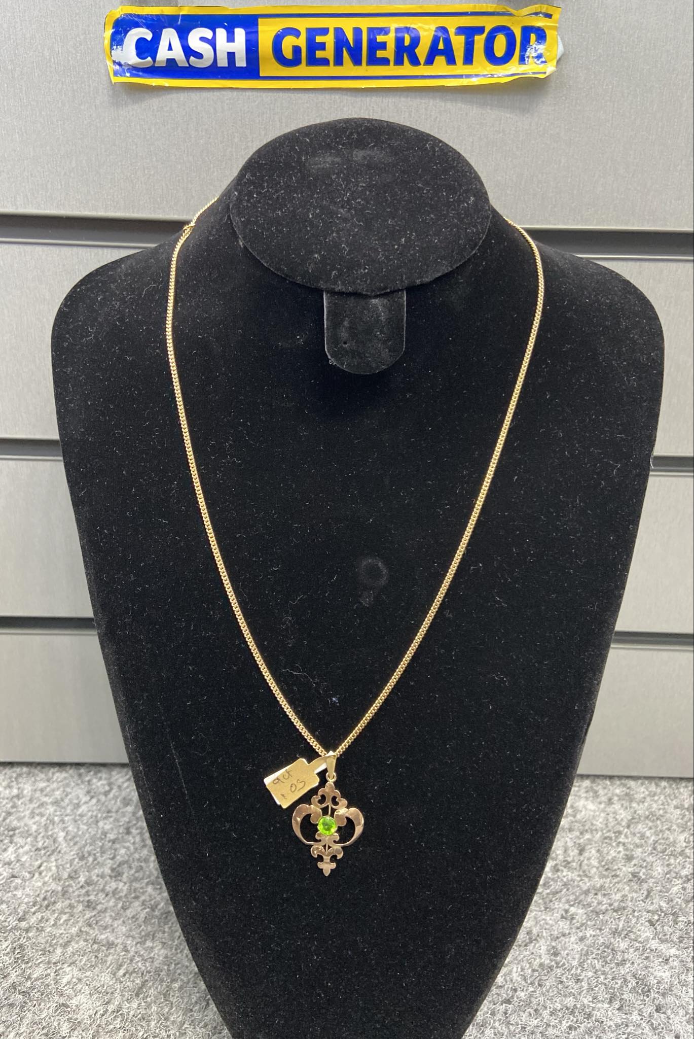 A 9ct gold fine curb chain and fancy green stone pendant, that weigh 8.4g in total and is 22 inches long. Chain and pendant are in pristine condition, cleaned and polished.