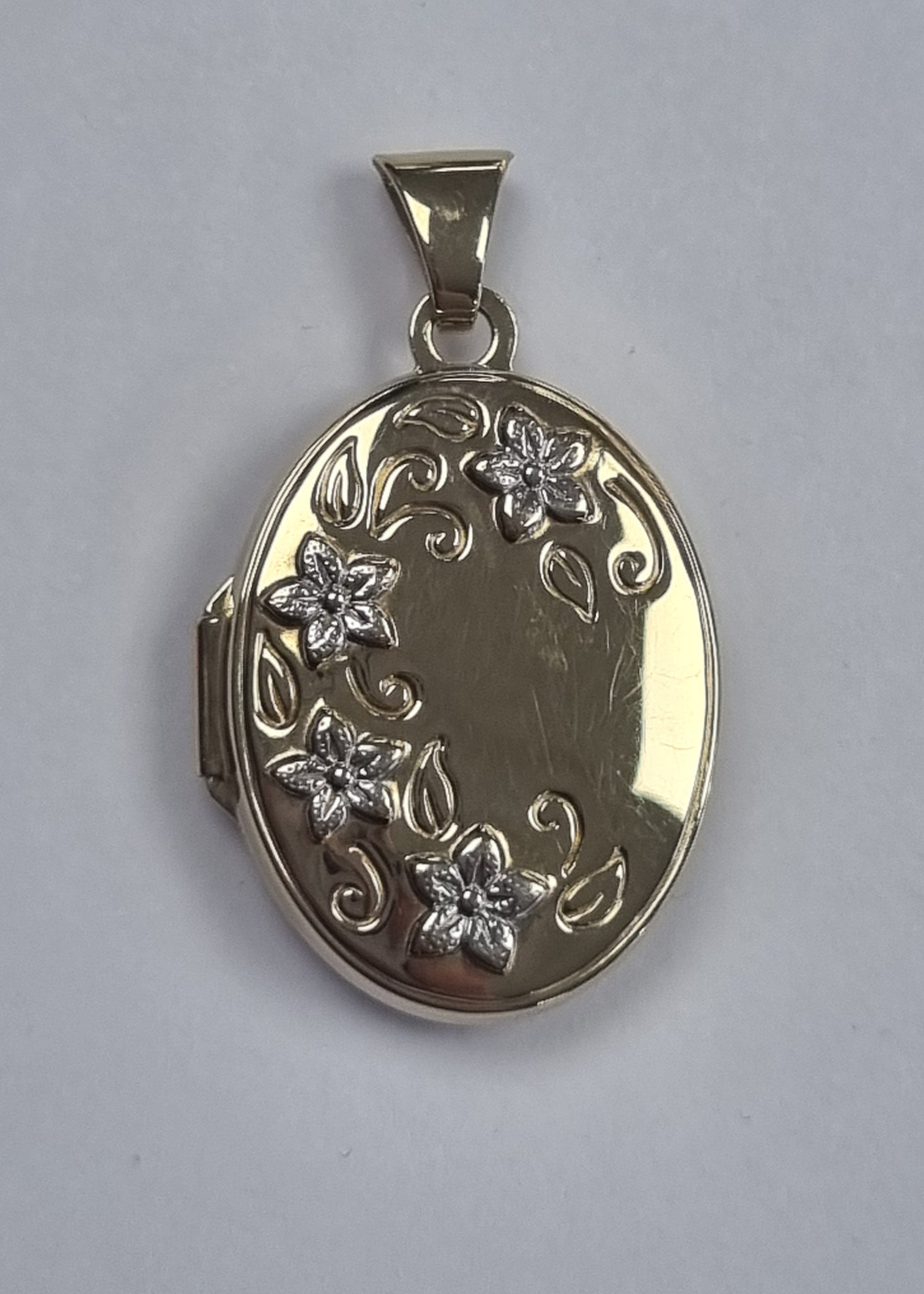 9ct gold oval locket with floral design. This is in good condition. Approx 2.8cm length. Approx 1.7cm in width. Weighs 1.7ograms in total. *********** Will be posted immediately