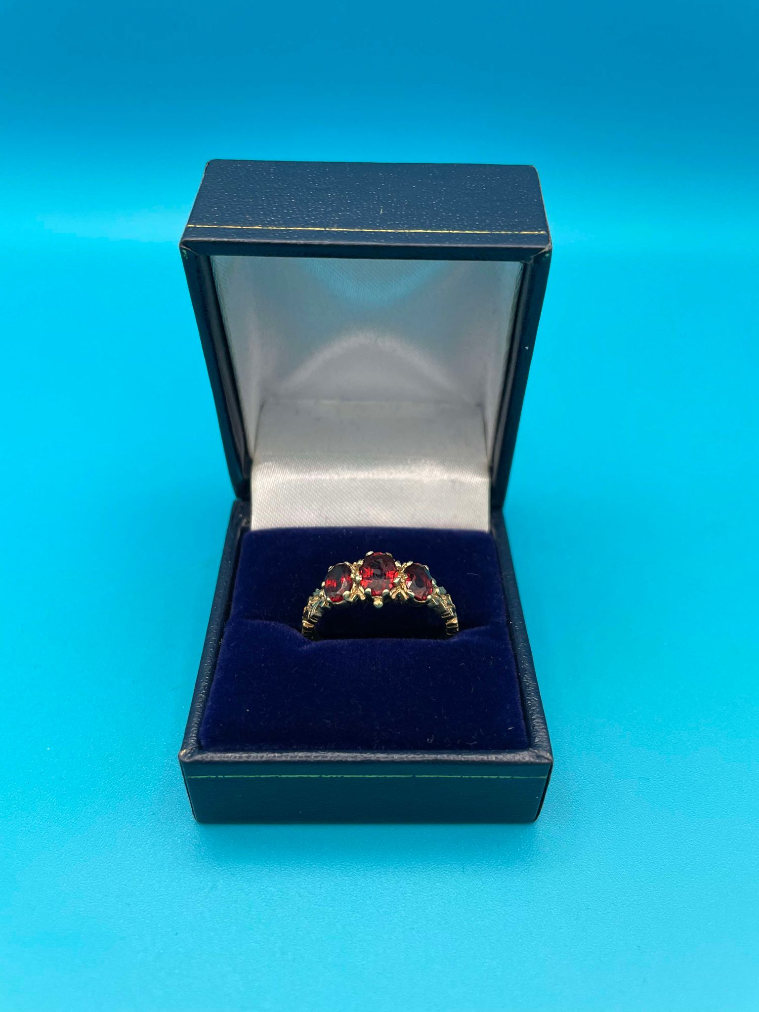 9ct gold ring with red stones