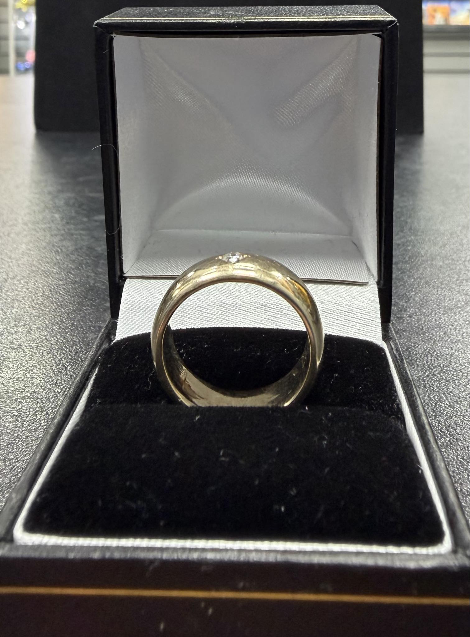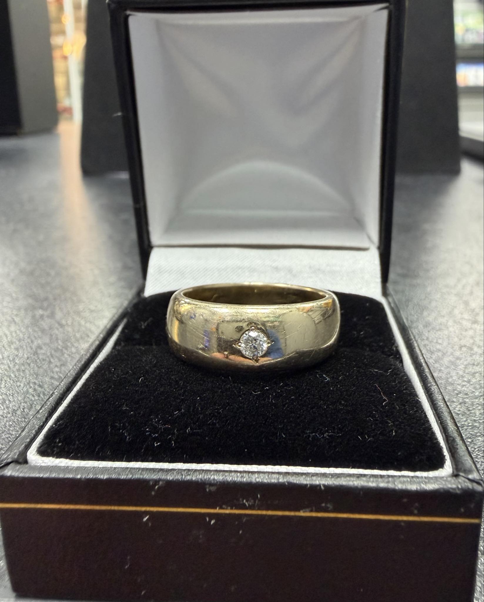 A 9ct gold wedding band with a CZ stone in the Centre that weighs 9.4 grams, in a size Q. The ring is in good condition but shows signs of wear, the inside of the wedding band has a deep scratch. The ring has been professionally cleaned and polished. The ring is hallmarked and tested. Boxed - Delivery or Collection **Click and Collect from the Handsworth Branch**