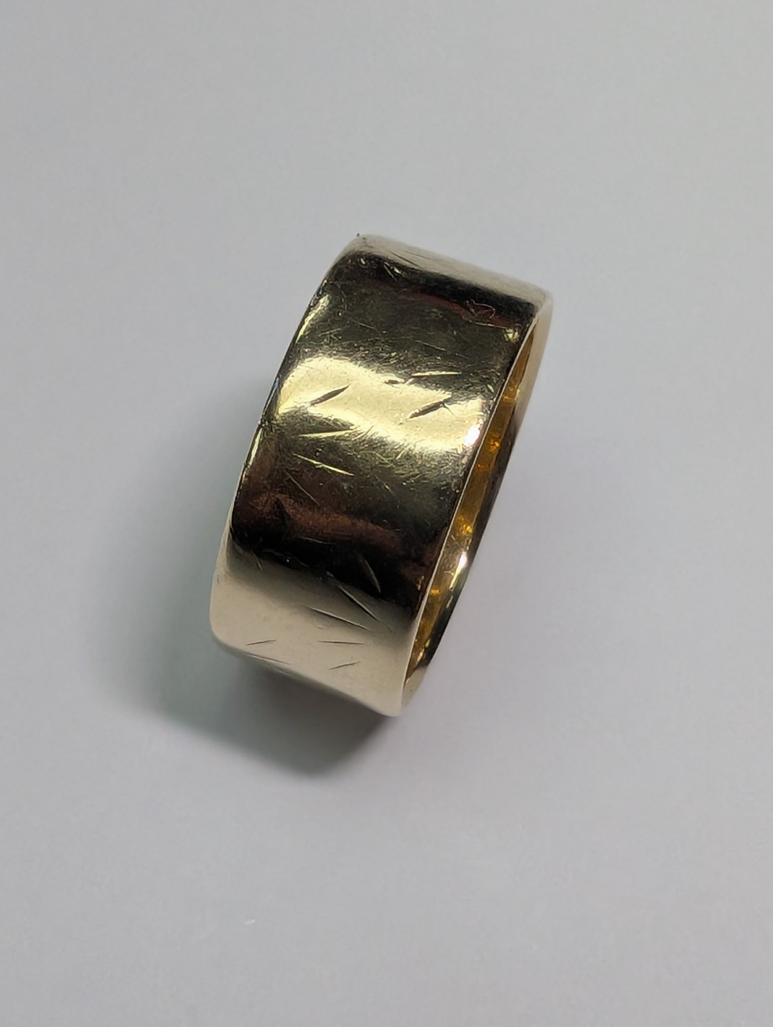 HERE WE HAVE A 9CT GOLD PATTERNED WIDE WEDDING BAND. THIS RING IS IN GOOD CONDITION AND COMES UNBOXED. TOTAL WEIGHT OF 4.92G AND A SIZE O 1/2. ******** FOR ANY QUERIES PLEASE CONTACT OUR PRESTON STORE DIRECTLY MON-SAT AT 01772 204889.