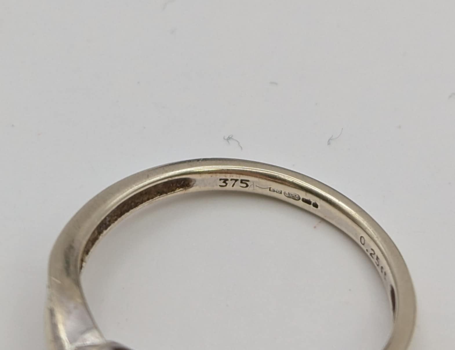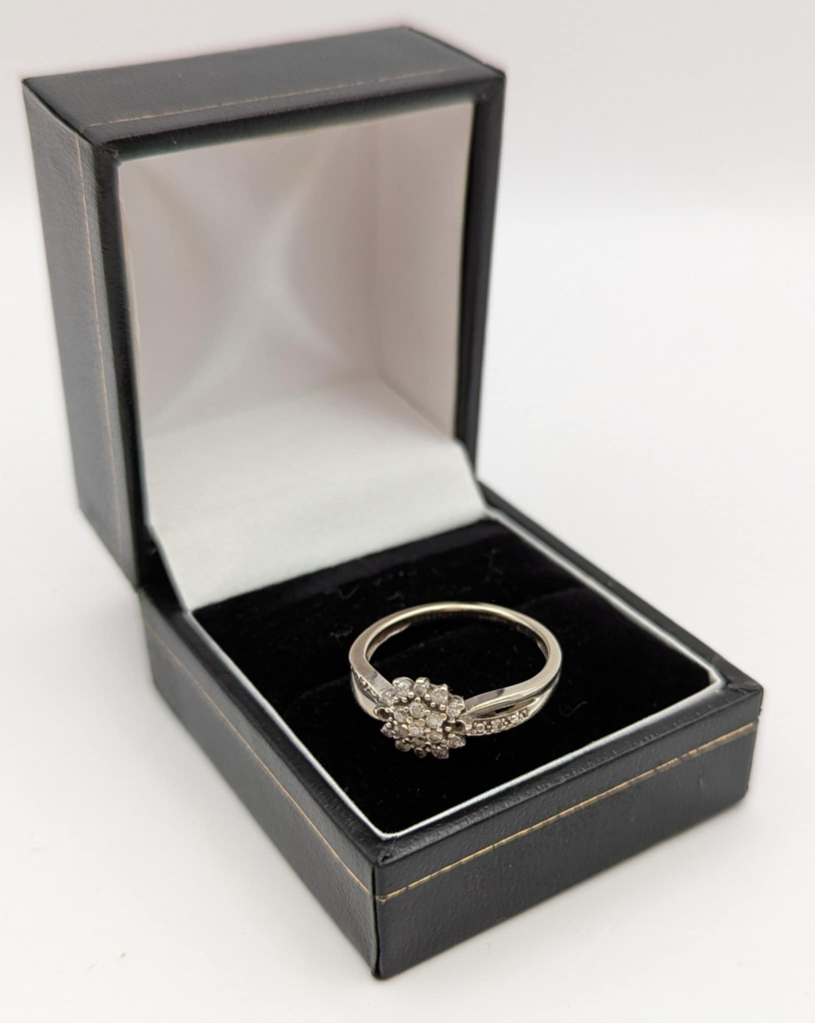 9CT HALLMARKED 375, WHITE GOLD, Stone Embedded Flower Design, SIZE: O/7, 2.5g, Boxed Item is in full wearable condition, However as it is a pre owned item some signs of use may be present such as light marks, Please see photos Harpurhey store